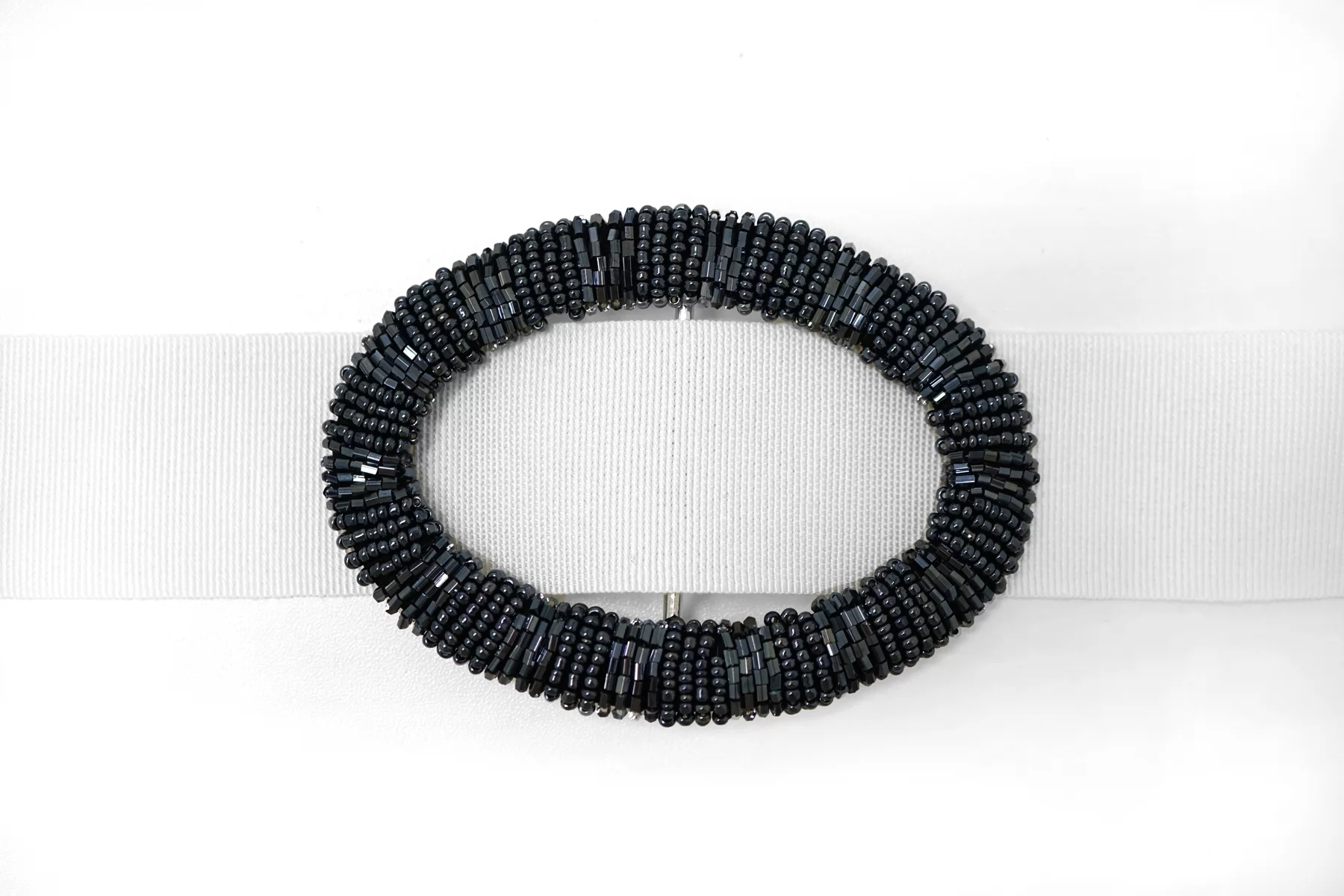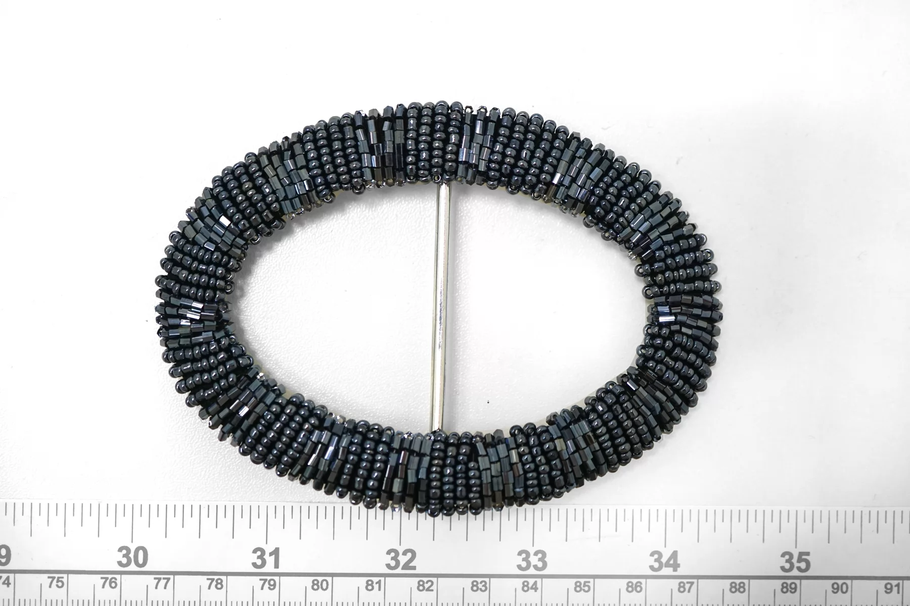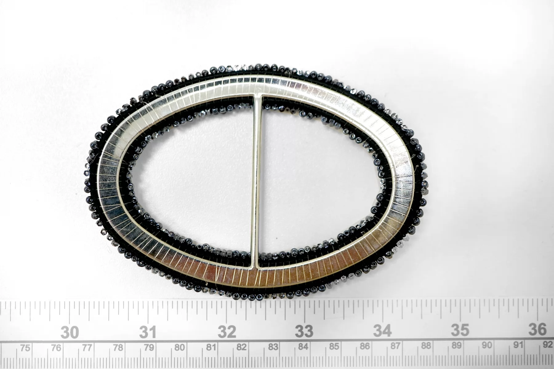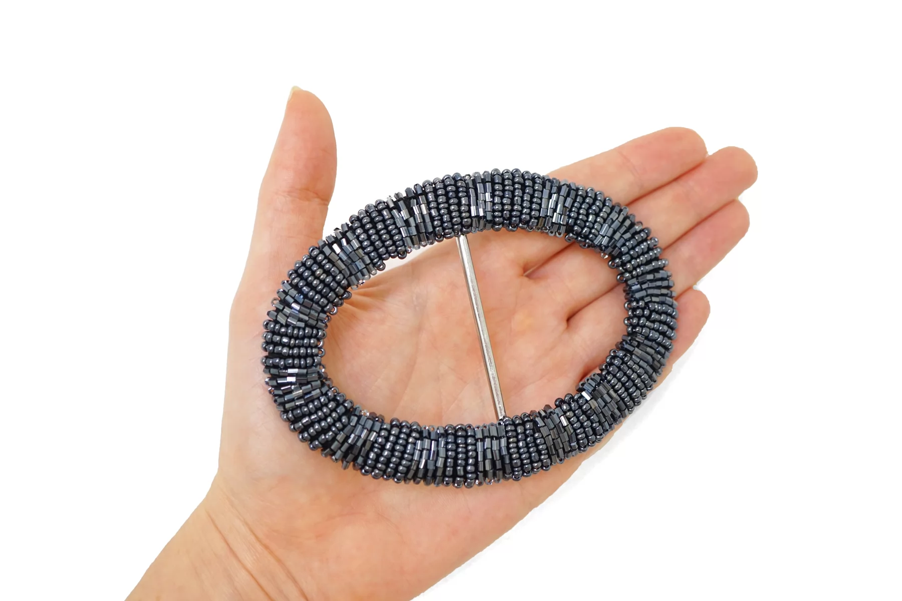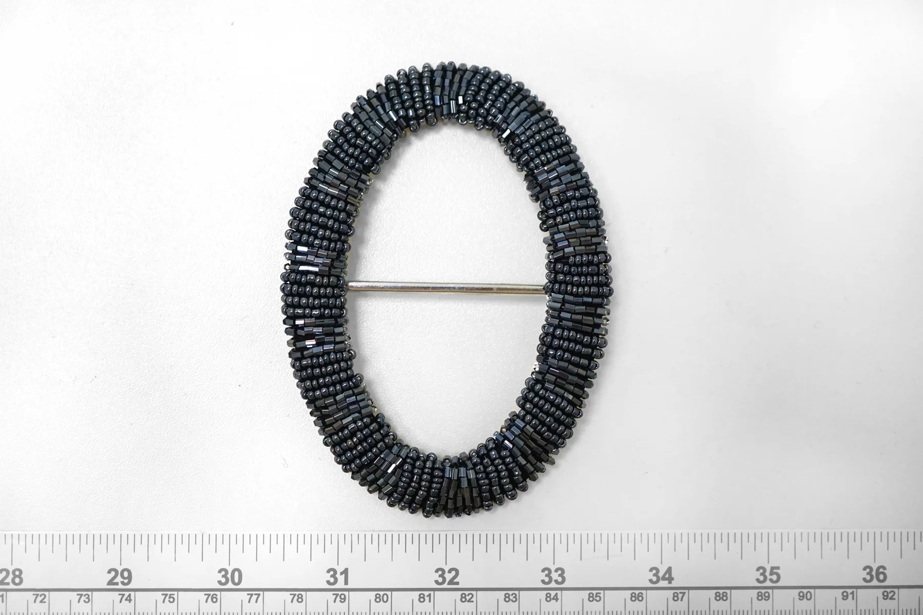 Овальная пряжка из металла расшитая бисером, цвета графит. Внутренний размер (для ремешка) - 45мм. Пряжка с металлическим язычком.