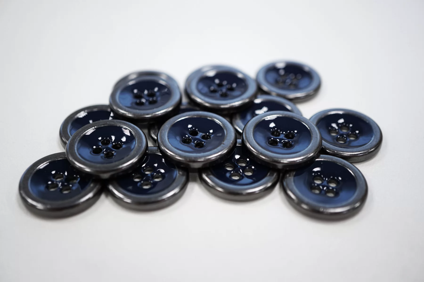 Пуговица костюмная металлическая, размер 19 мм, покрыта пыльно-синей эмалью с тёмно-серебристой каемкой.