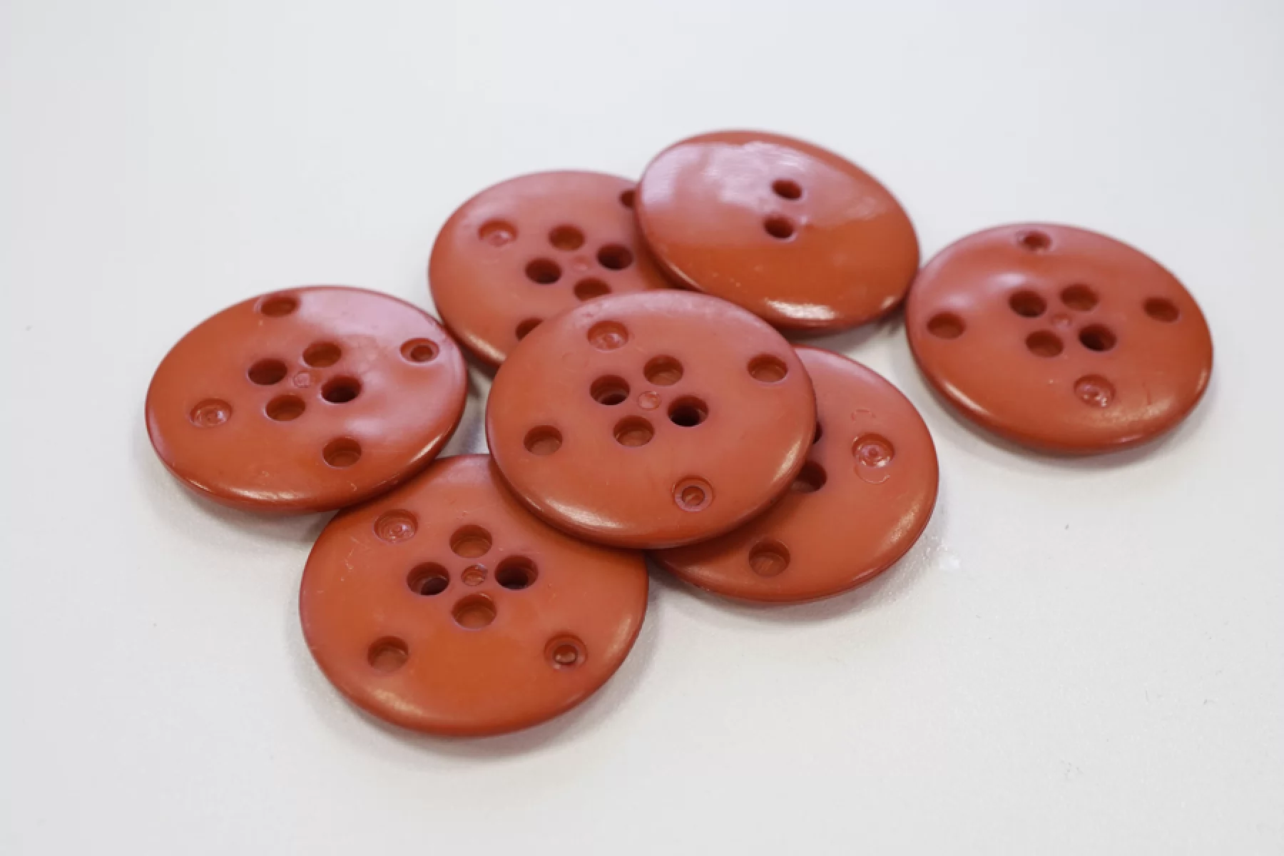 Пуговица пальтовая из пластмассы, размер 38 мм, терракотового цвета с декоративными отверстиями.