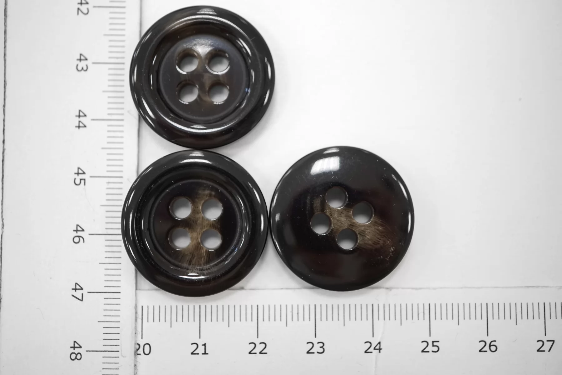 Пуговица глянцевая костюмно-пальтовая из пластмассы, размер 26 мм, чёрного цвета, с характерными коричневыми вкраплениями.