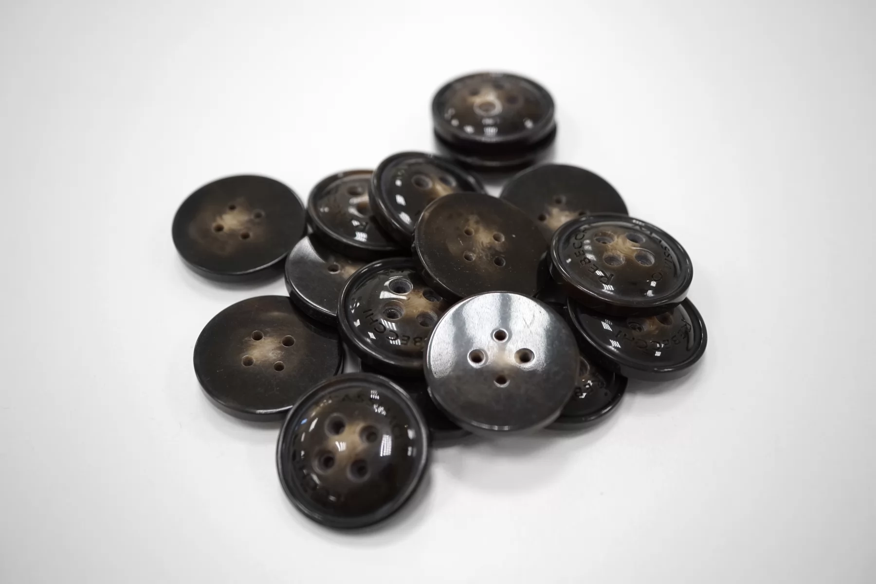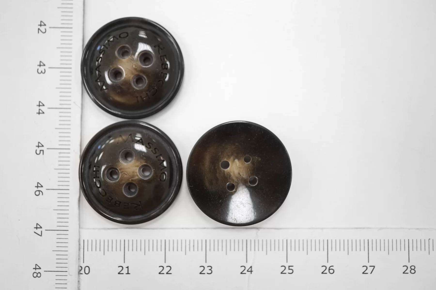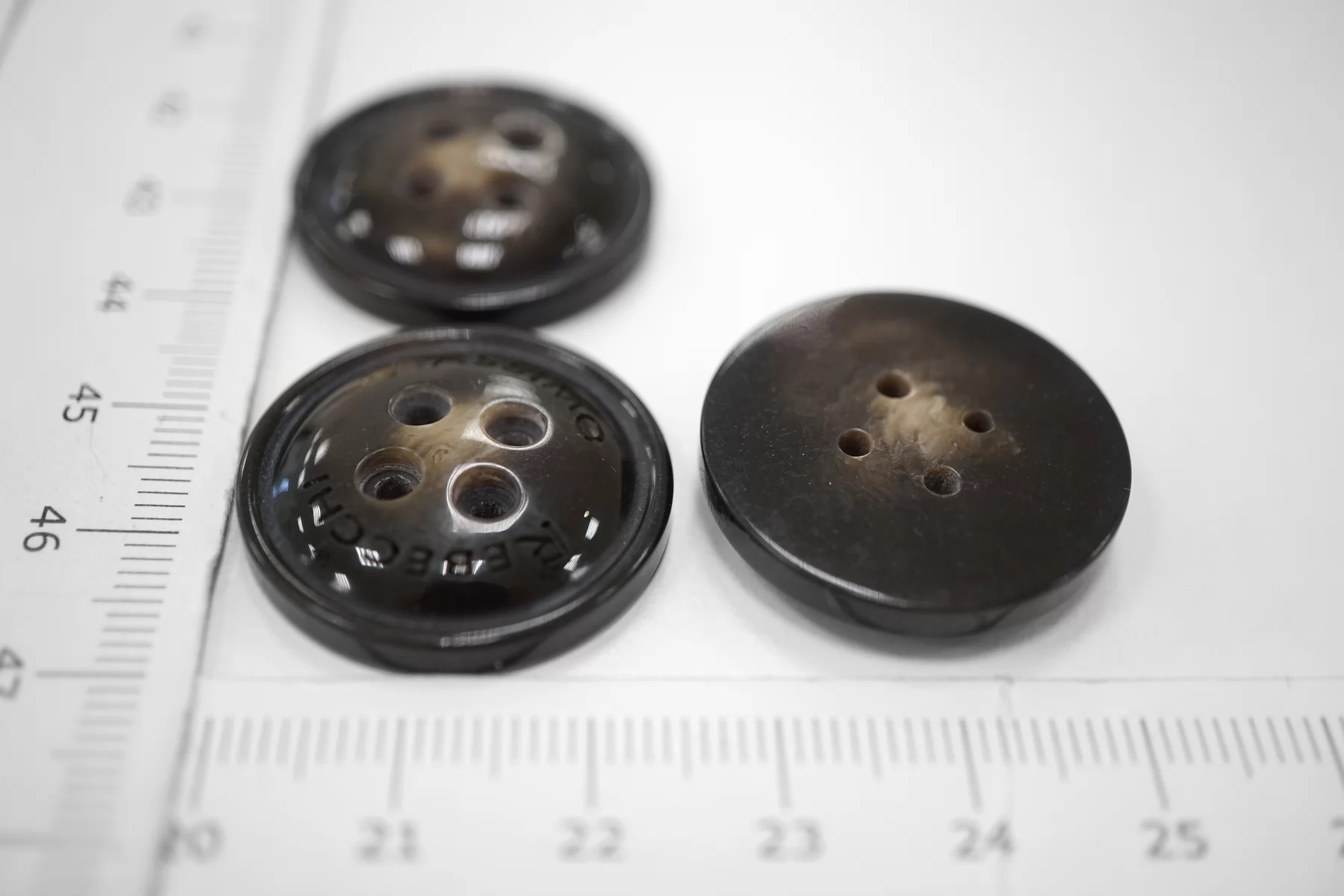 Пуговица глянцевая костюмно-пальтовая из пластмассы, Rebecchi Massimo, размер 26 мм, чёрного цвета, с характерными коричневыми вкраплениями.
