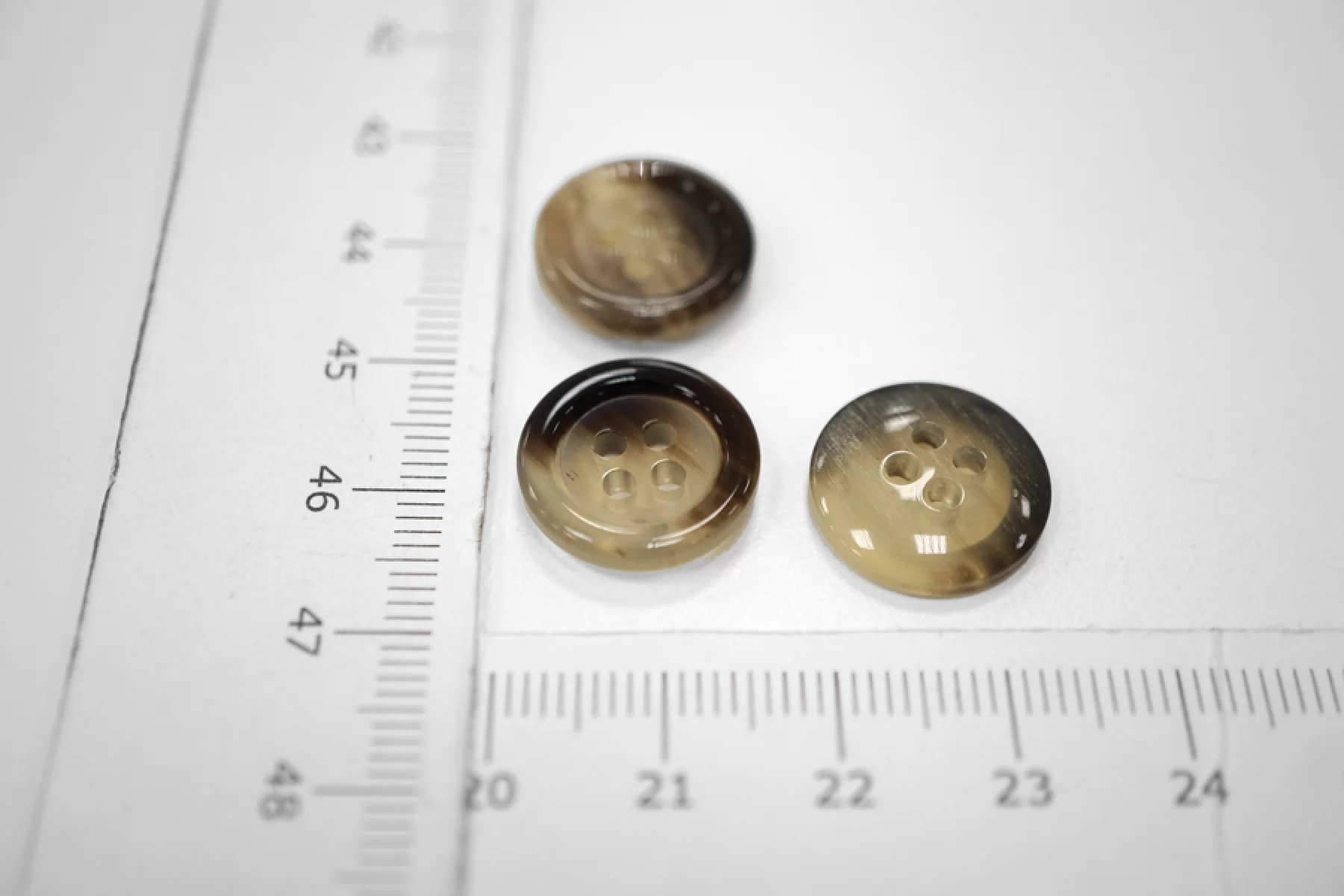 Пуговица глянцевая костюмно-рубашечная пластиковая, под рог, размер 16 мм, бежево-коричневого цвета.