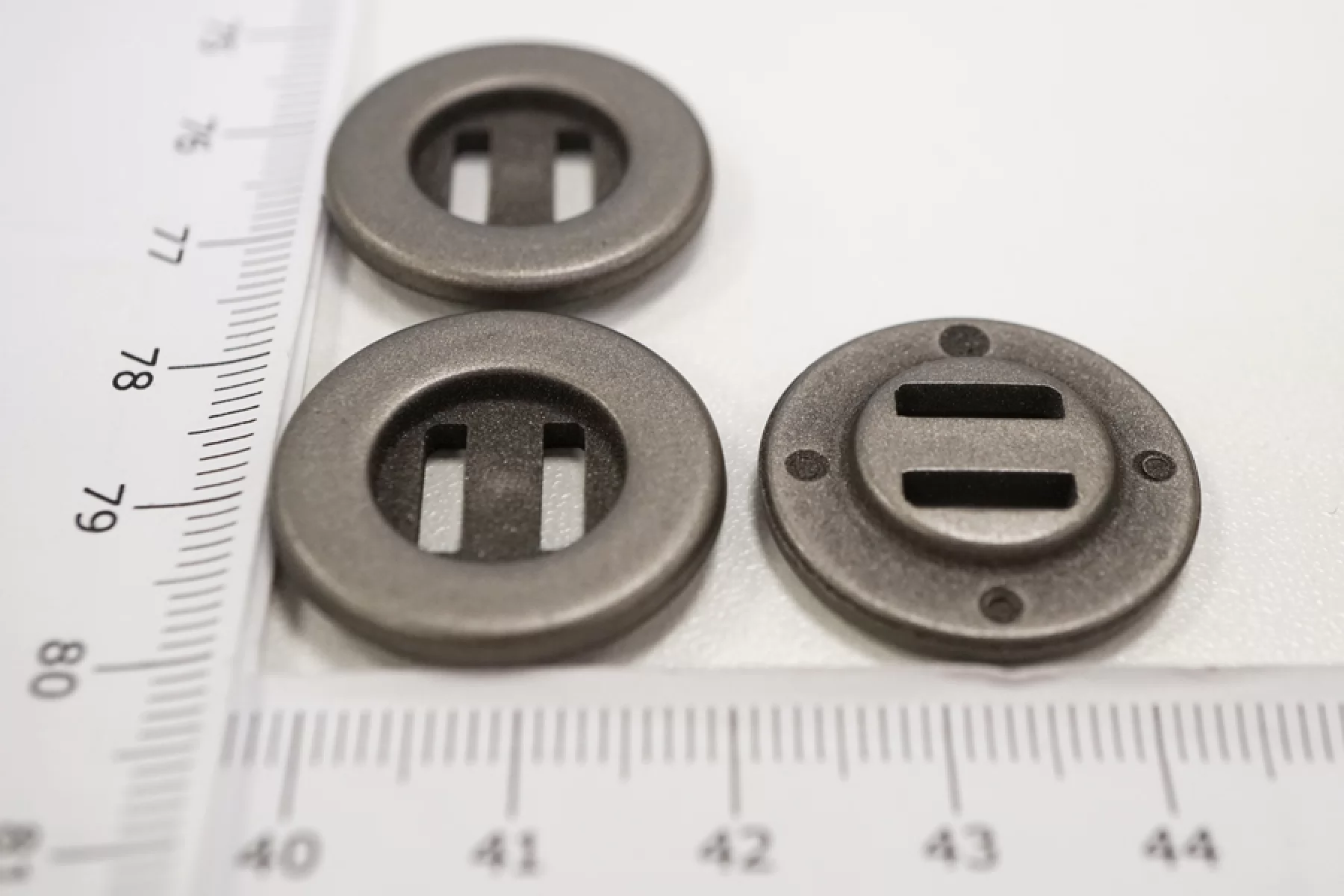 Пуговица костюмная пластиковая, имитация металла, размер 23 мм, серо-серебряного цвета, с отверстиями типа "канадка". Такую пуговицу можно пришить с помощью ниток, либо закрепить с помощью ленты.