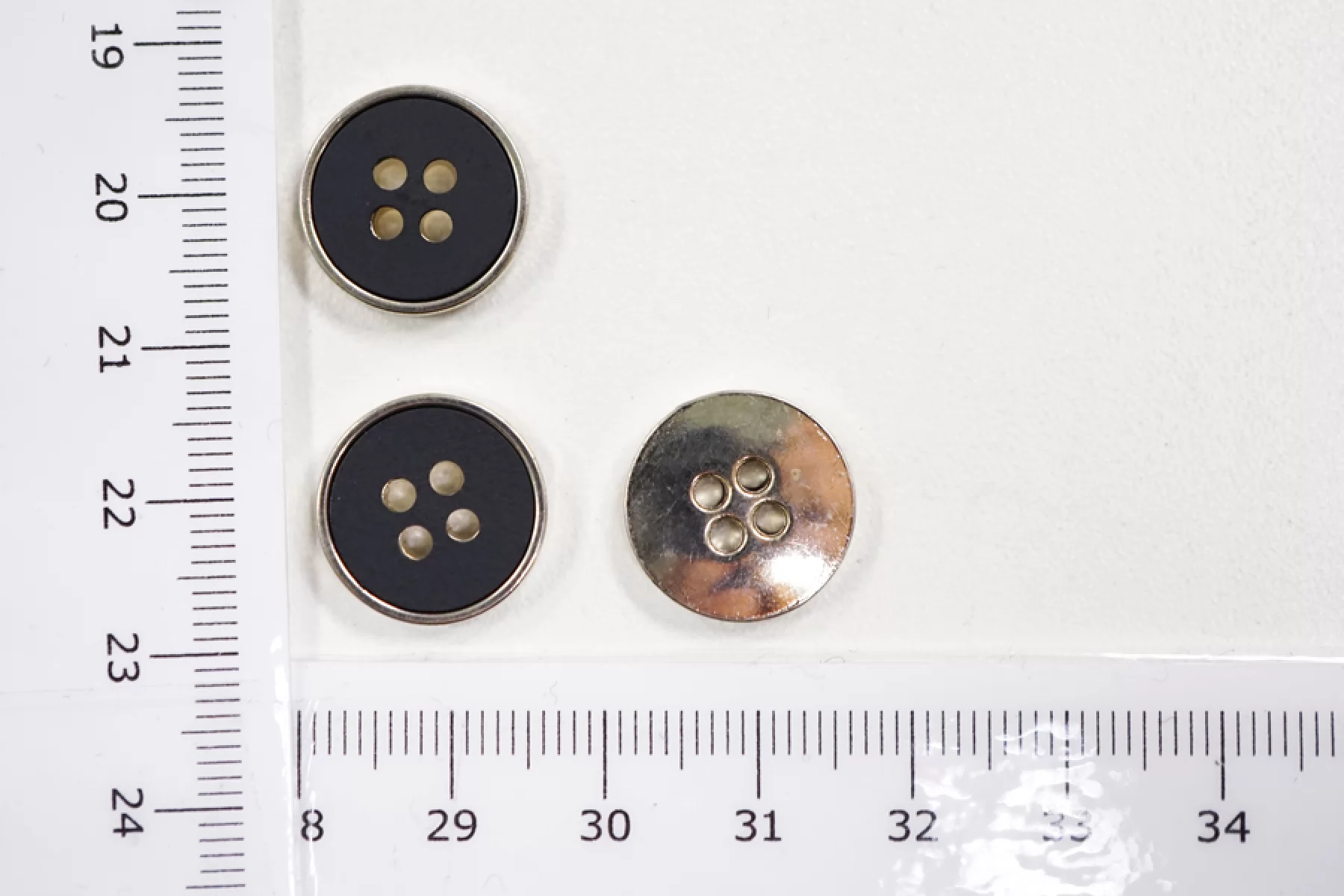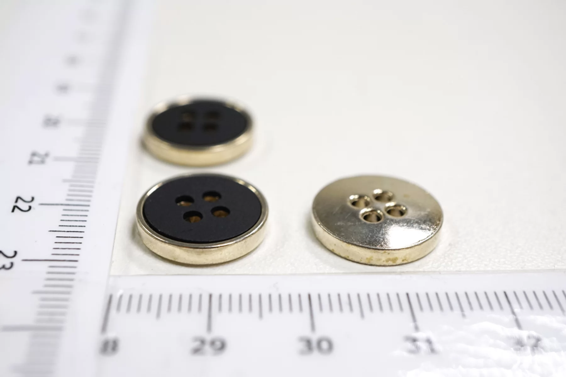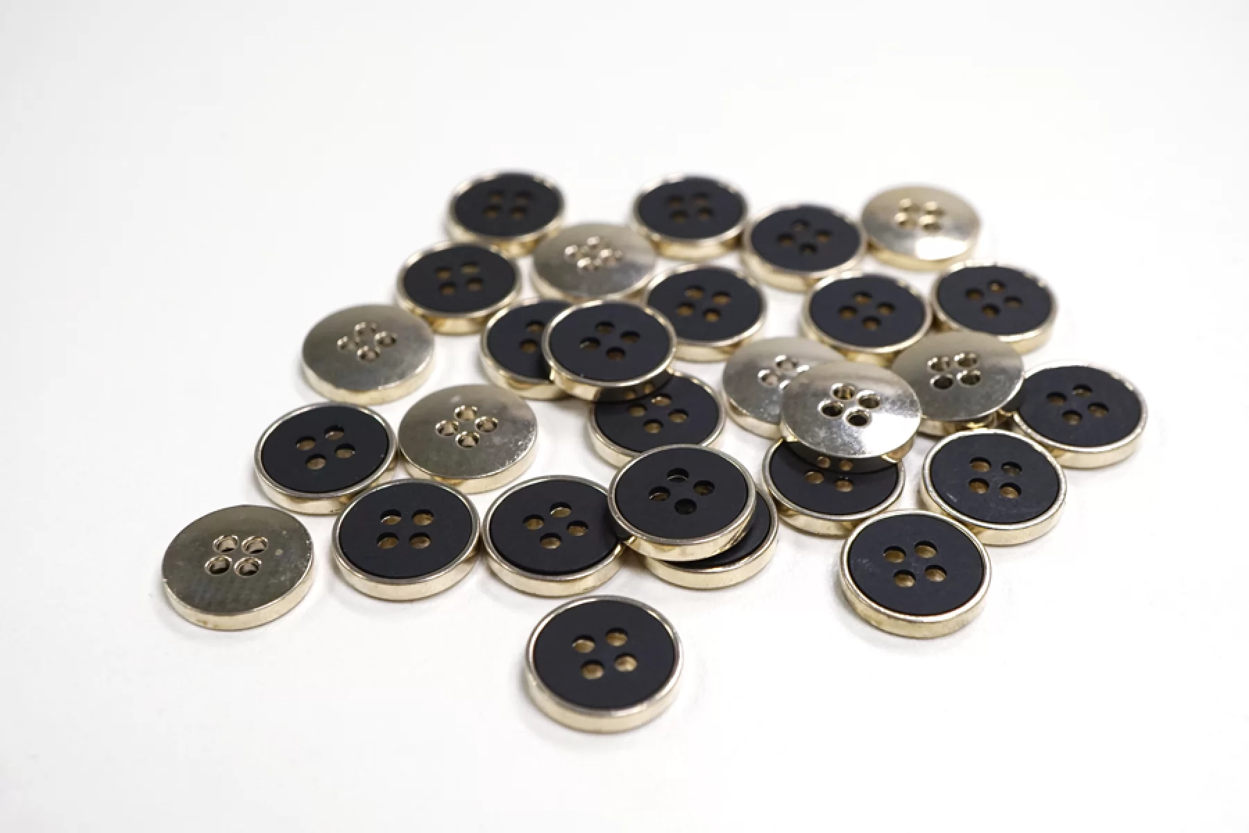 Пуговица костюмная металлическая, размер 15 мм, со вставкой из черного полимерного пластика.