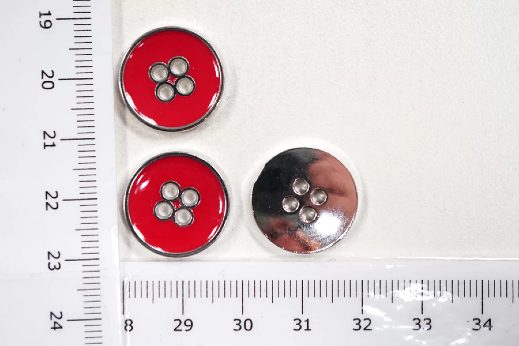 Пуговица костюмная металлическая, размер 17 мм, покрыта красной эмалью.