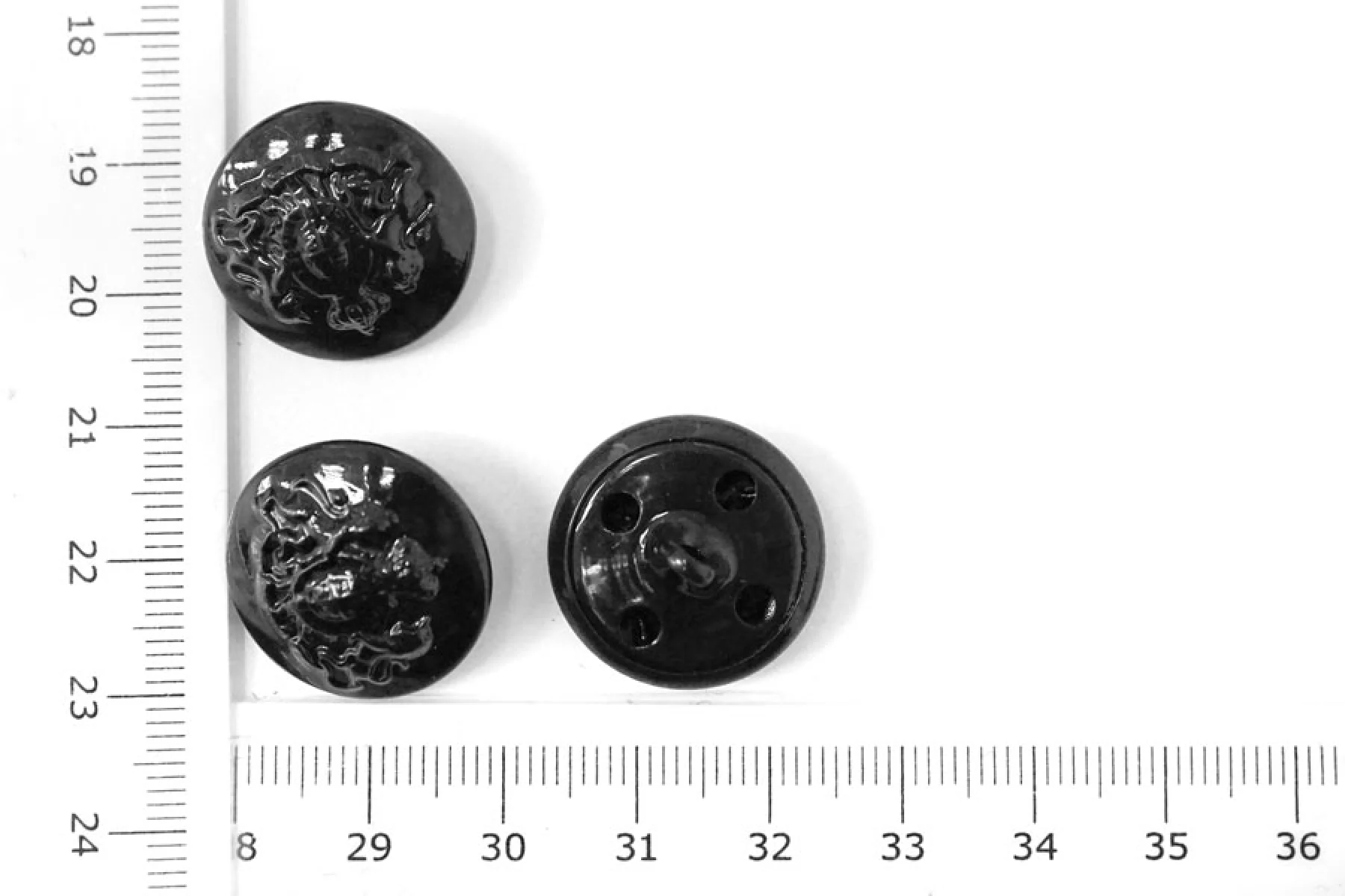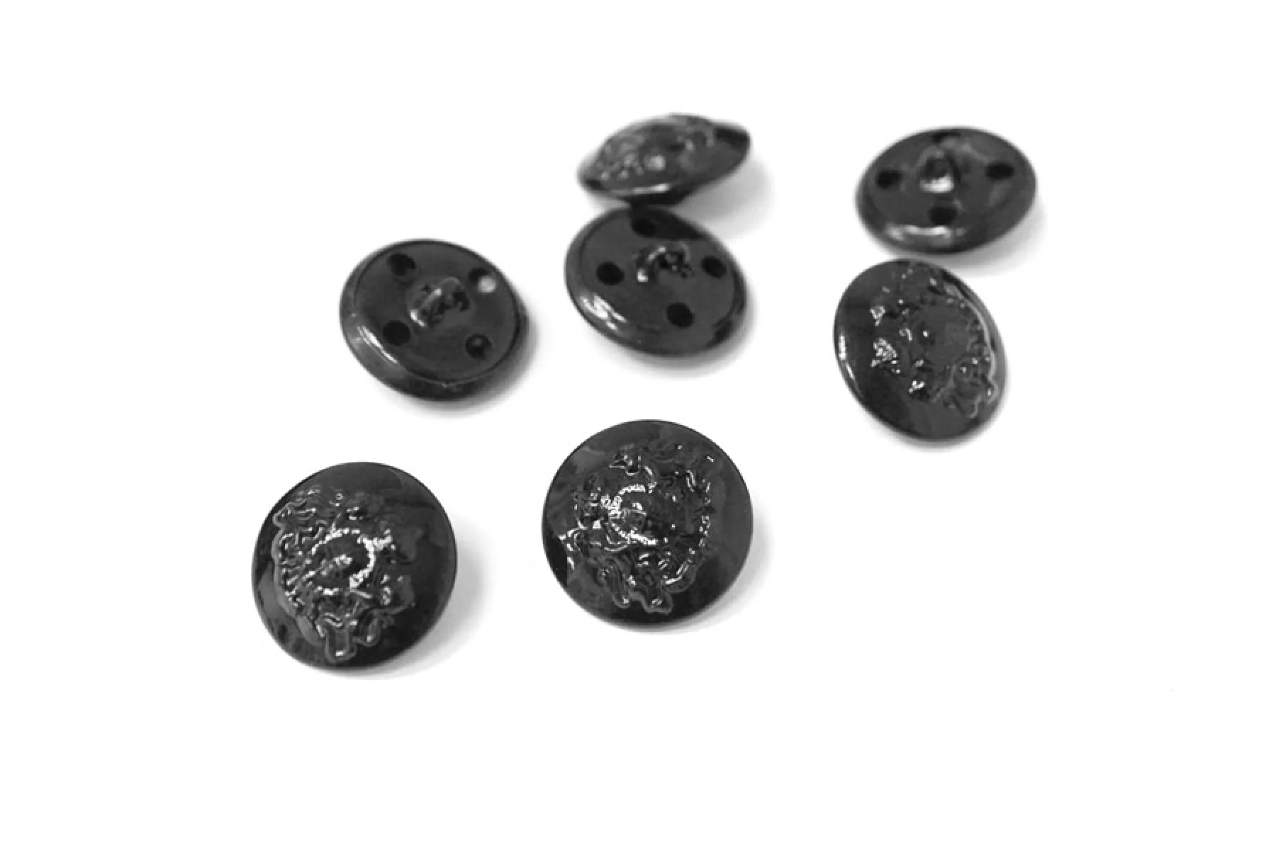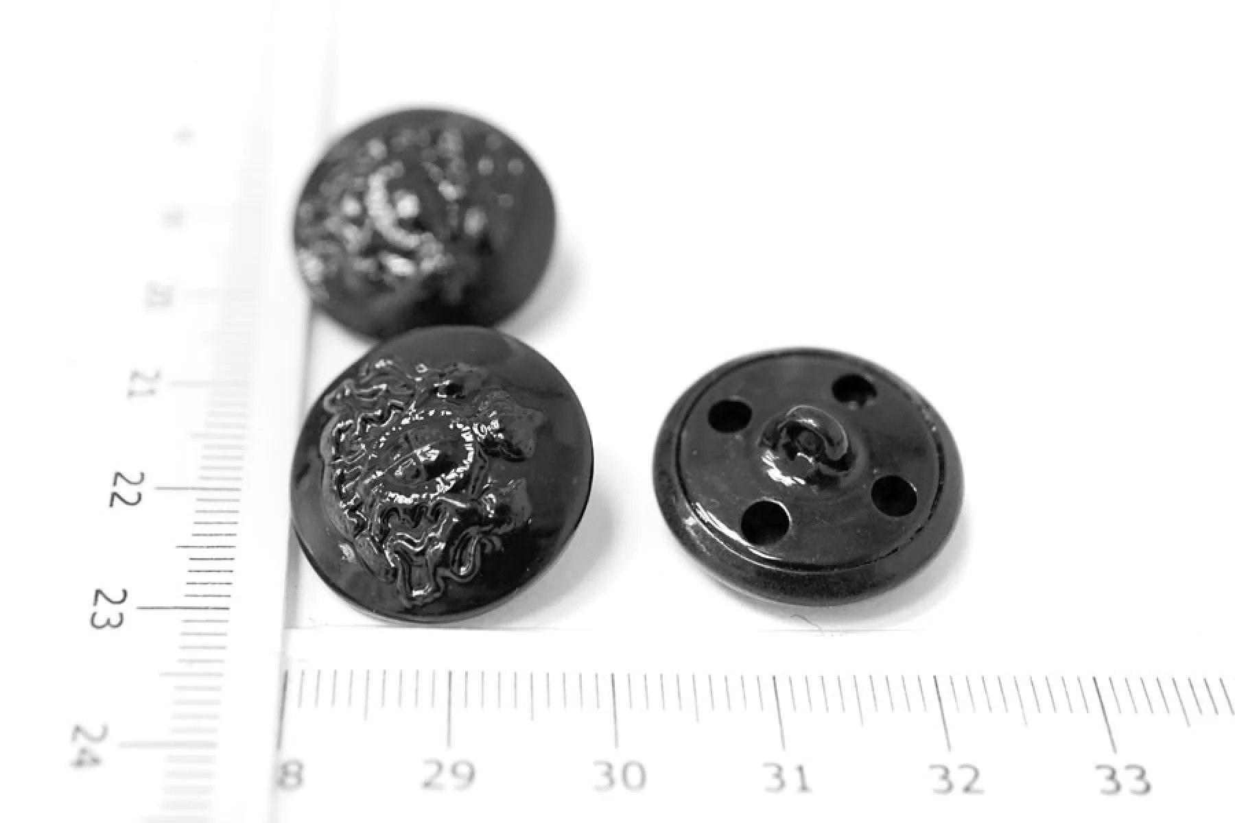 Пуговица металлическая черного цвета с объемной выделкой в виде геральдики, размер 20 мм, глянцевая.
