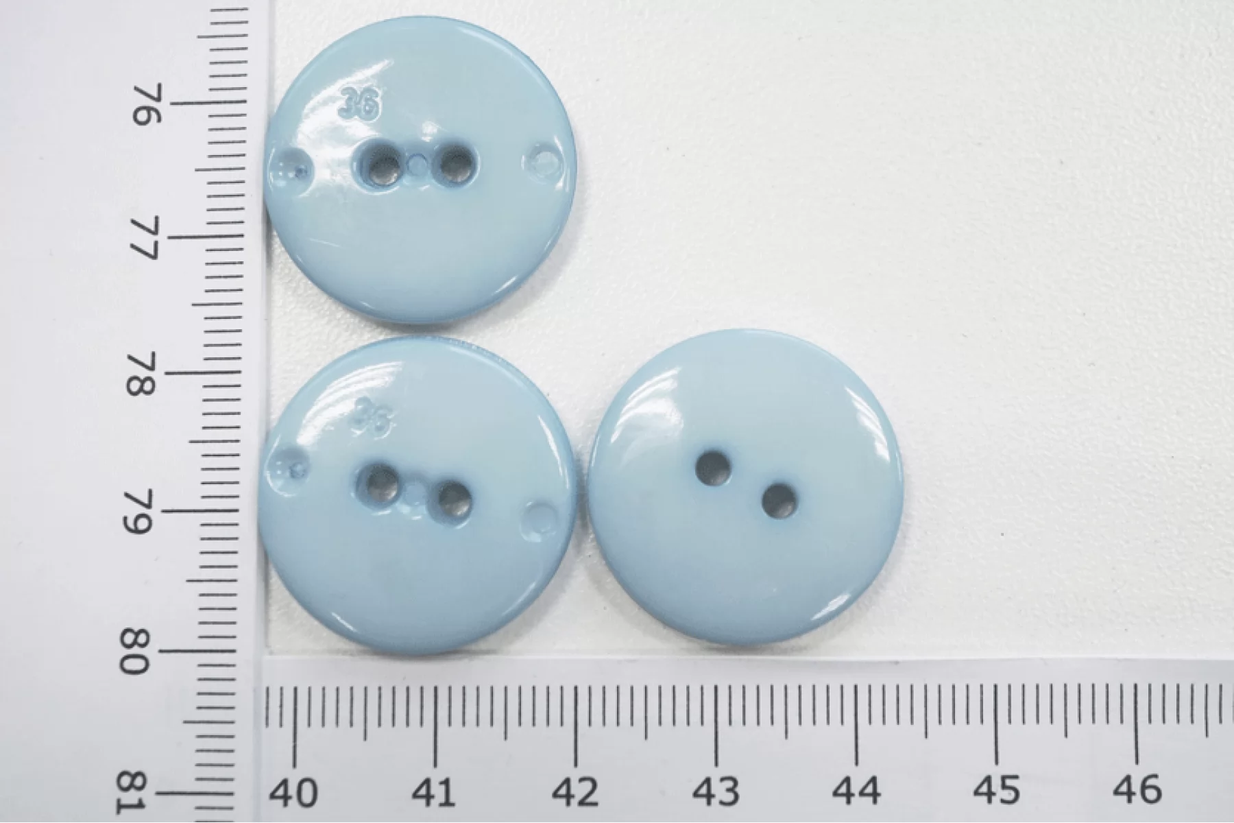 Пуговица костюмная из пластмассы, размер 22 мм, бледно-голубого цвета, с декоративными углублениями по краям и цифрой "36".