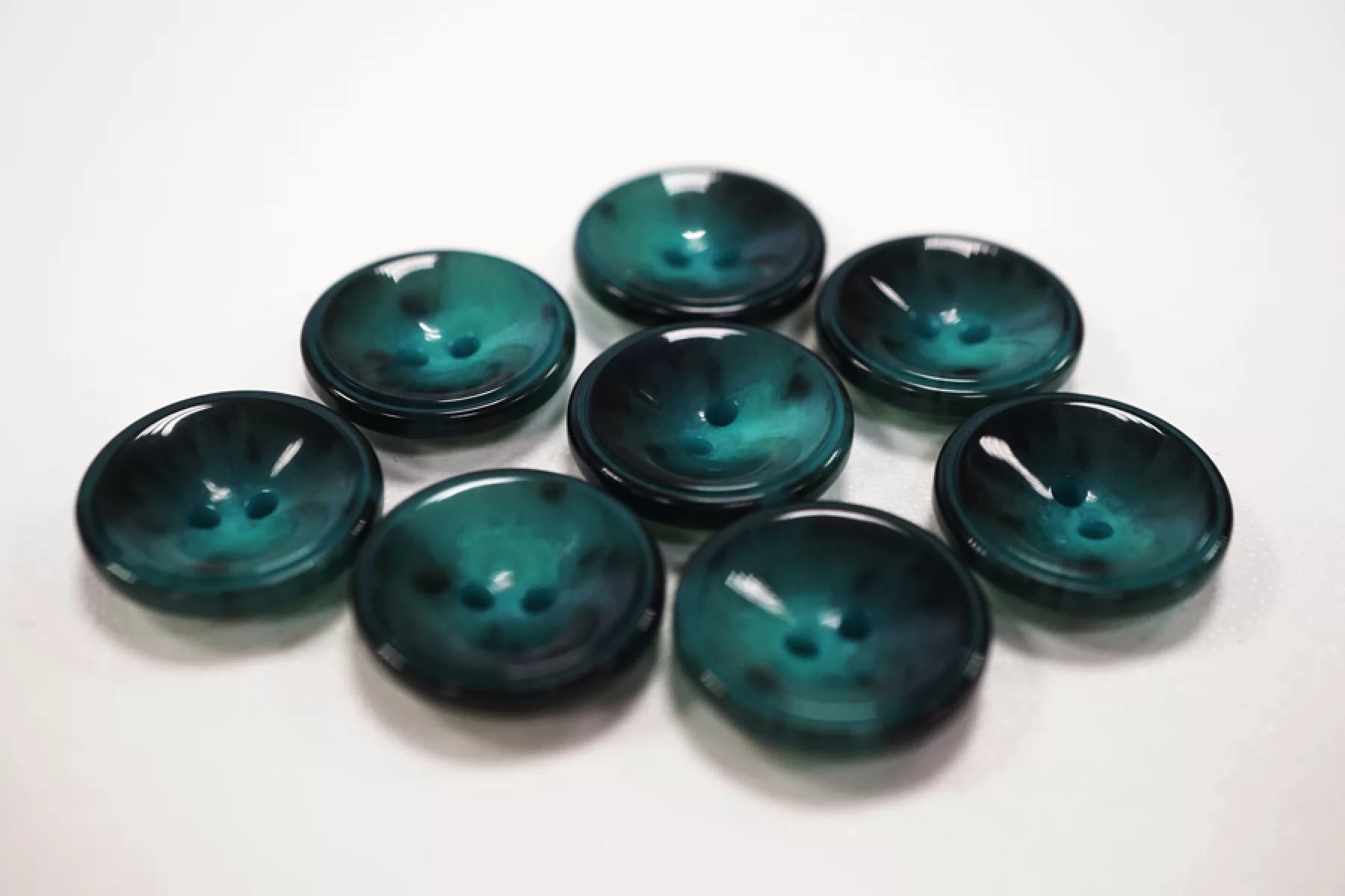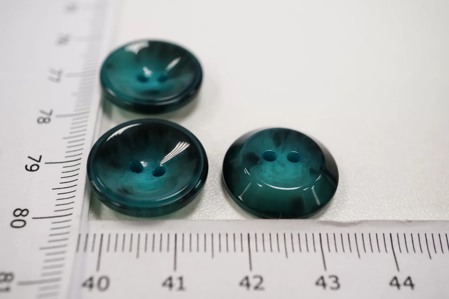 Пуговица костюмная из пластмассы, размер 17 мм, черно-бирюзового цвета, с гладкой глянцевой поверхностью, форма вогнутая чашечкой.