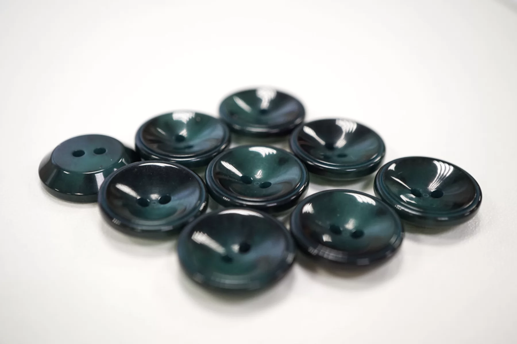 Пуговица костюмная из пластмассы, размер 17 мм, черно-бирюзово-зеленого цвета, с гладкой глянцевой поверхностью, форма вогнутая чашечкой.