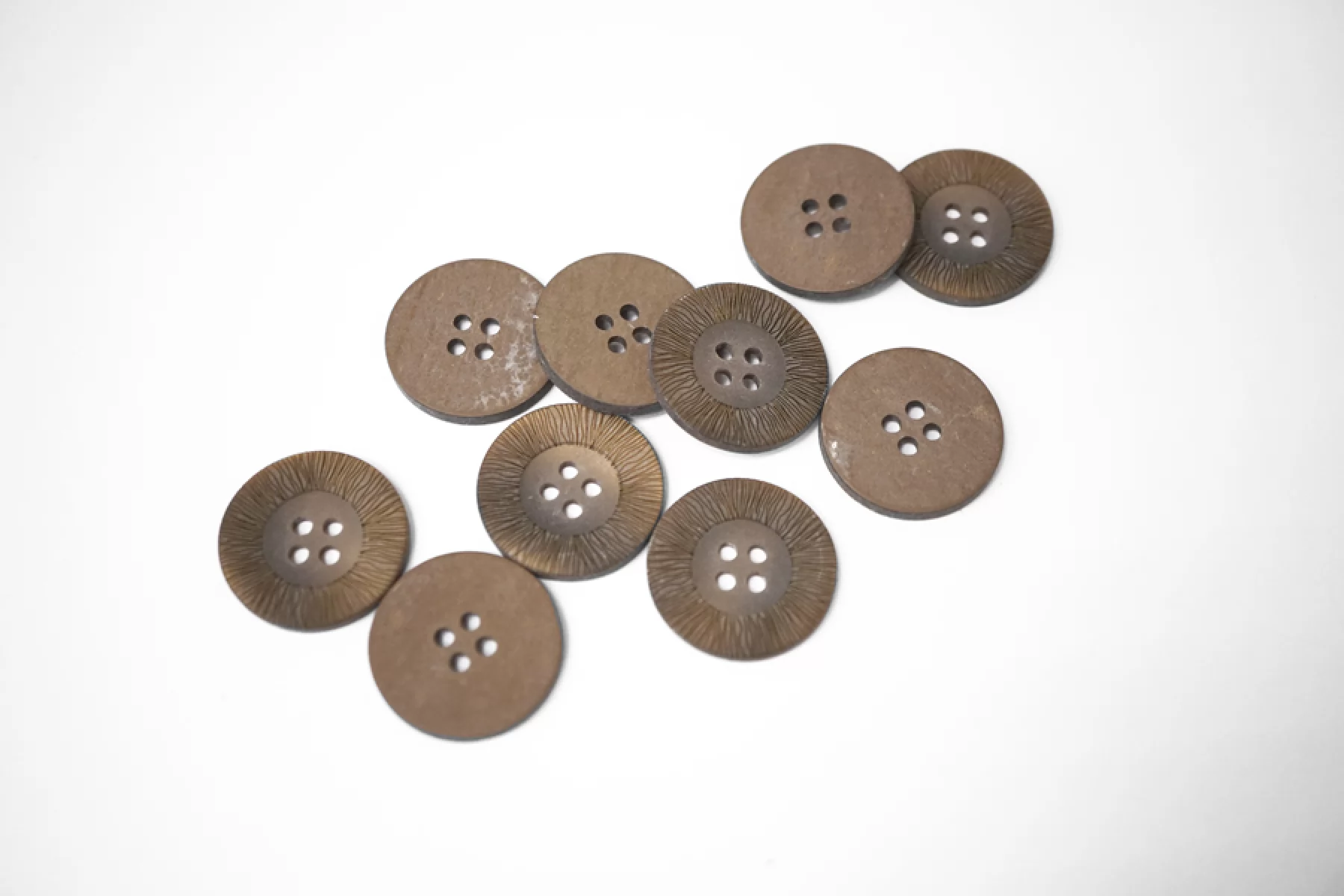 Пуговица костюмно-пальтовая матовая, размер 28 мм, с фактурной обработкой по кругу. Красиво переливается светло-коричневым и коричневым цветом.