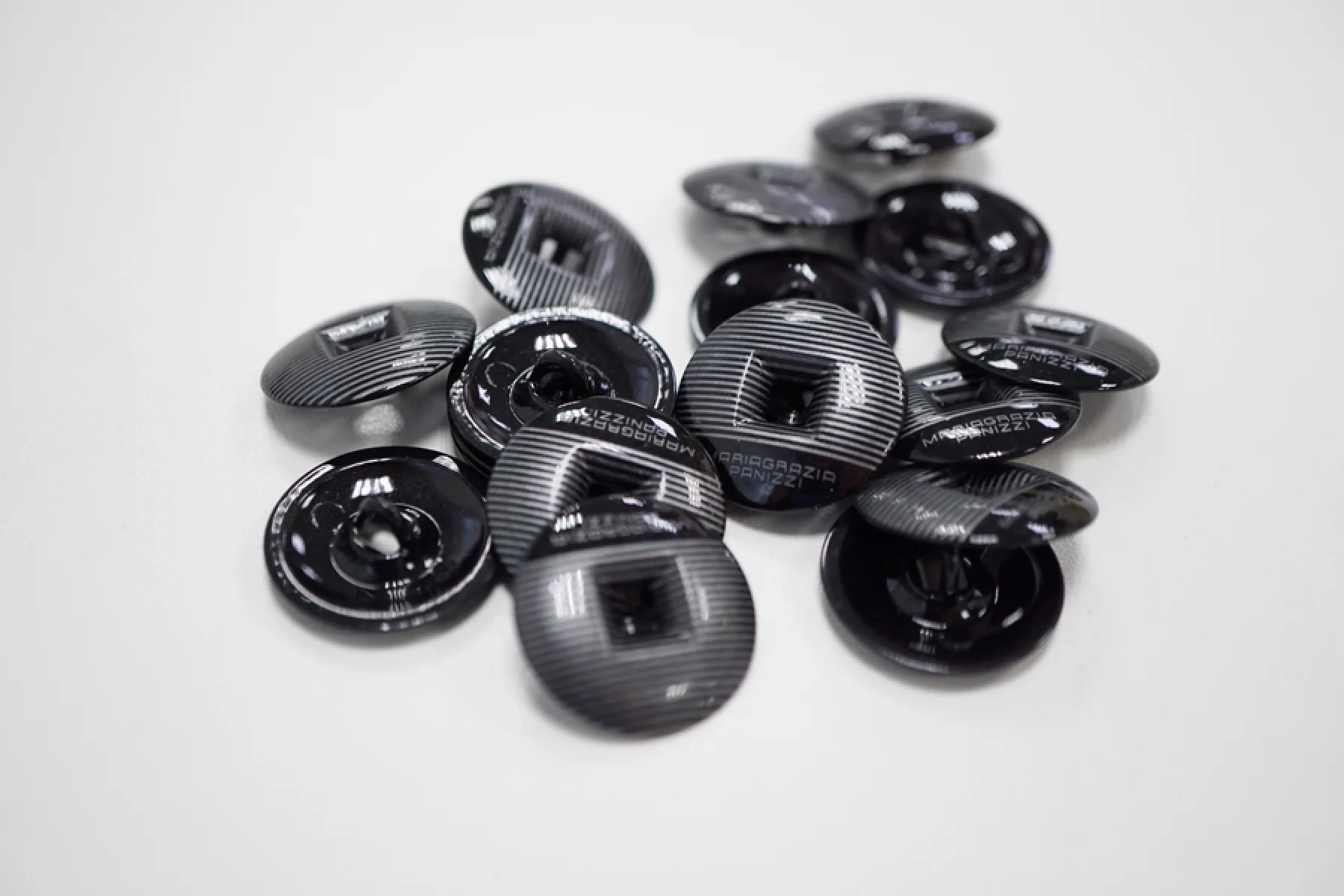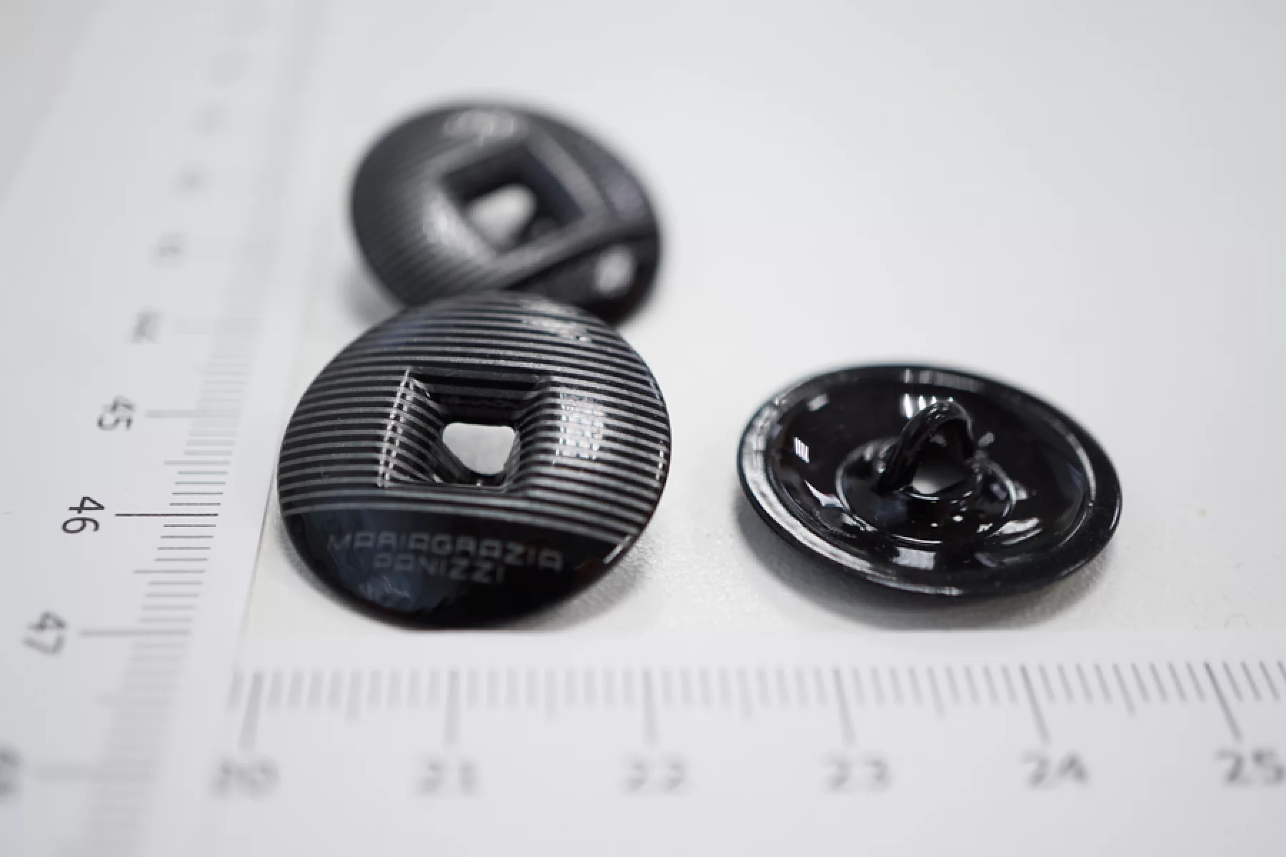 Пуговица костюмно-пальтовая "Mariagrazia Panizzi" из металла, размер 23 мм, черного цвета в тонкую серую полоску.
