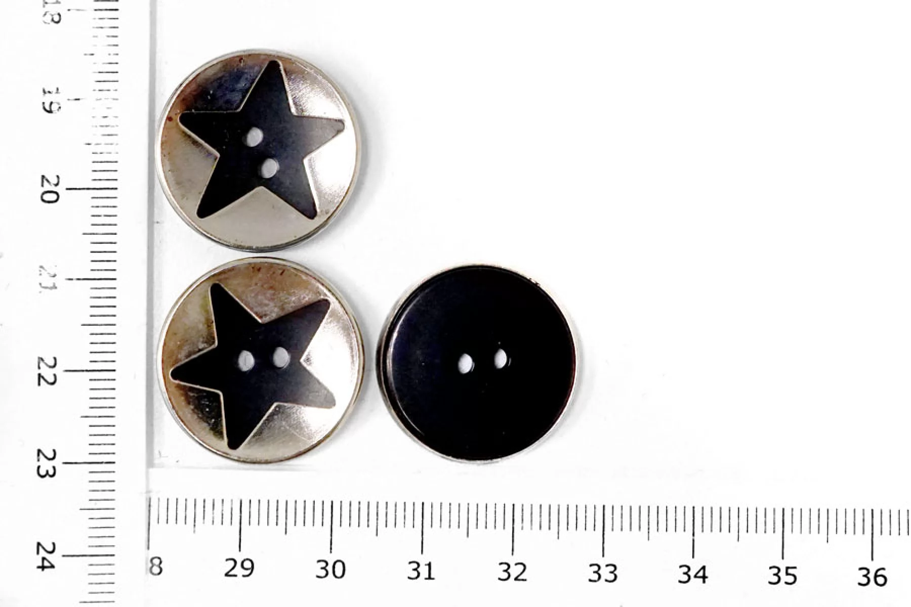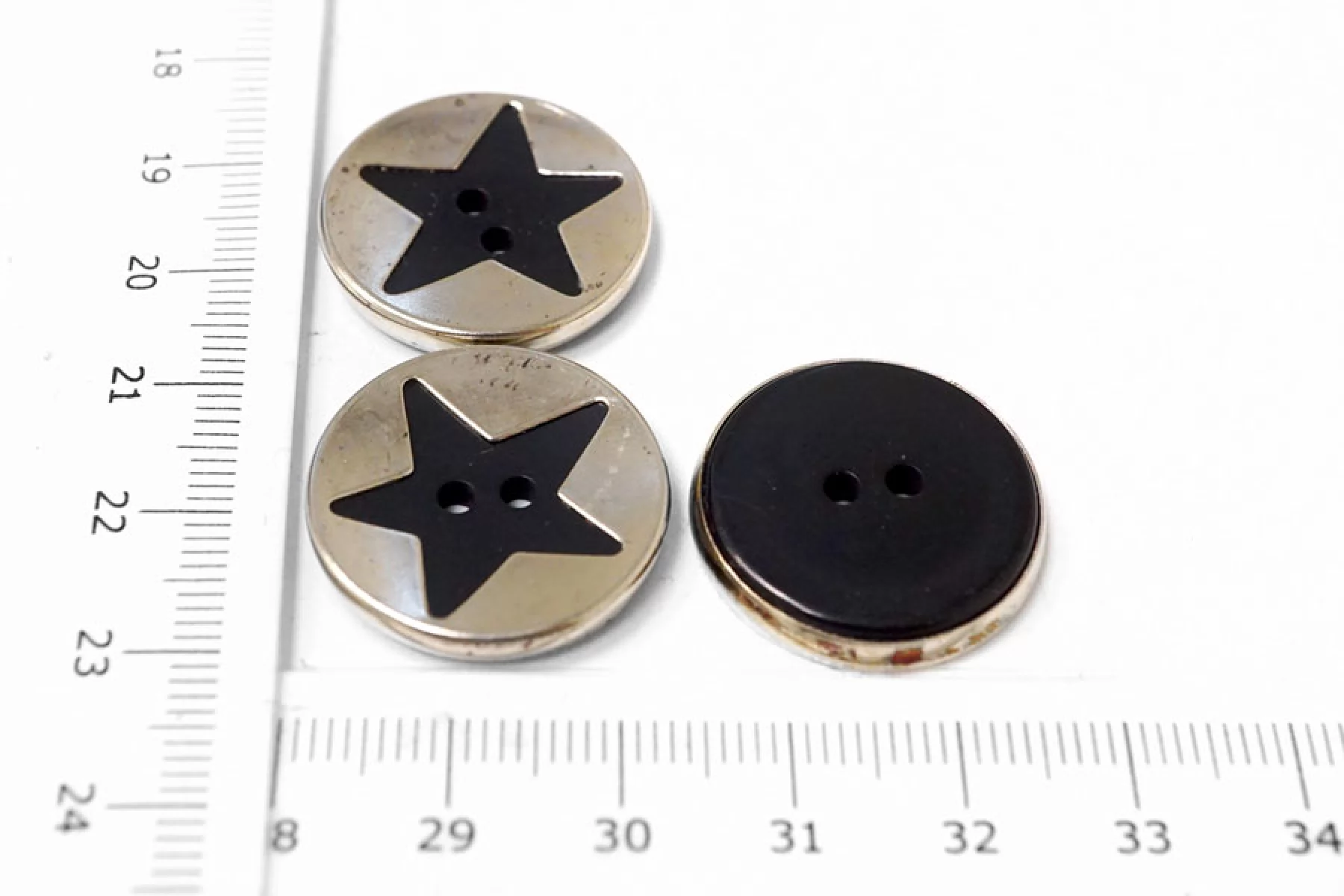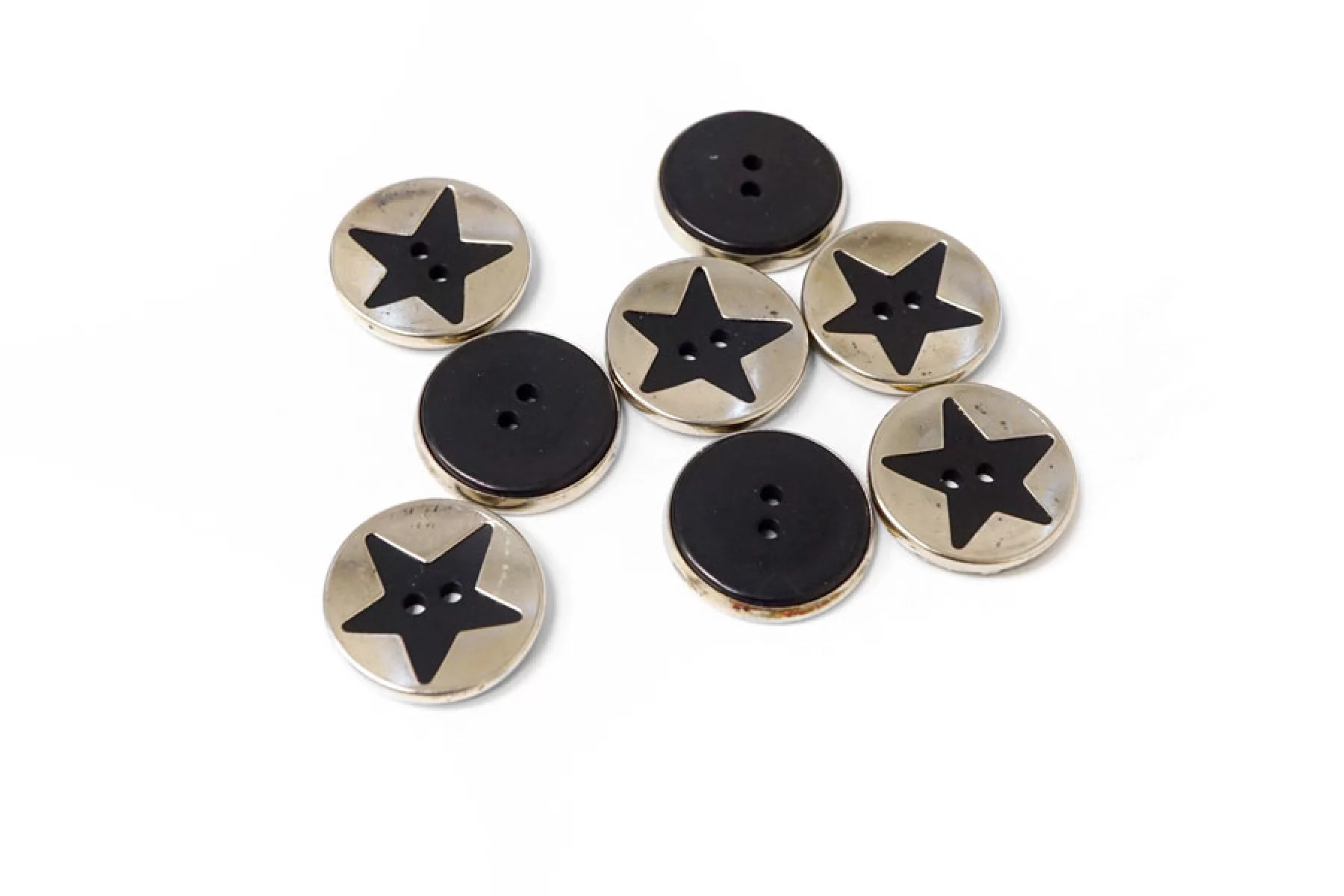 Пуговица металлическая с черной звездой по середине, глянцевая, размер 24 мм.
