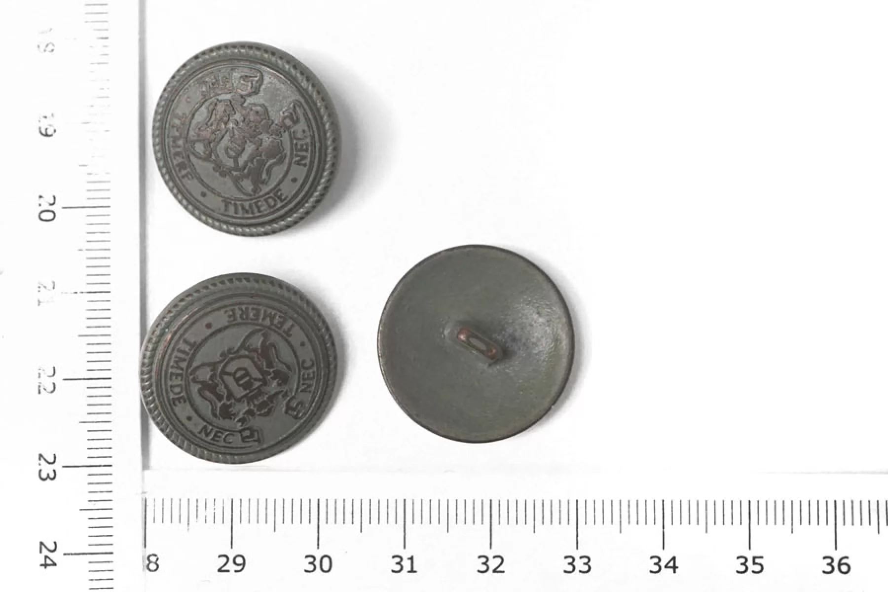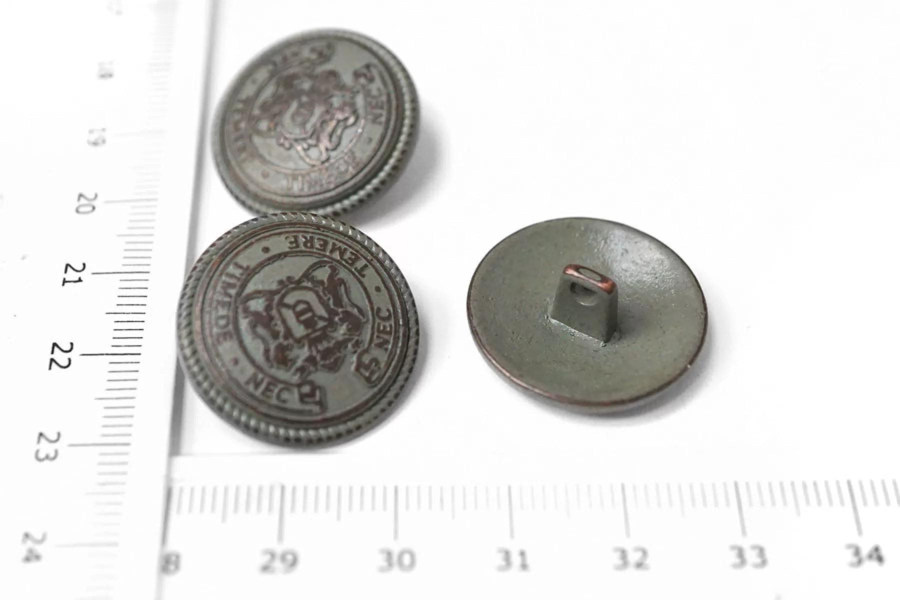 Пуговица металлическая серо-зеленого цвета, матовая, с выделкой в коричневатого цвета в виде геральдики. Размер 22 мм.