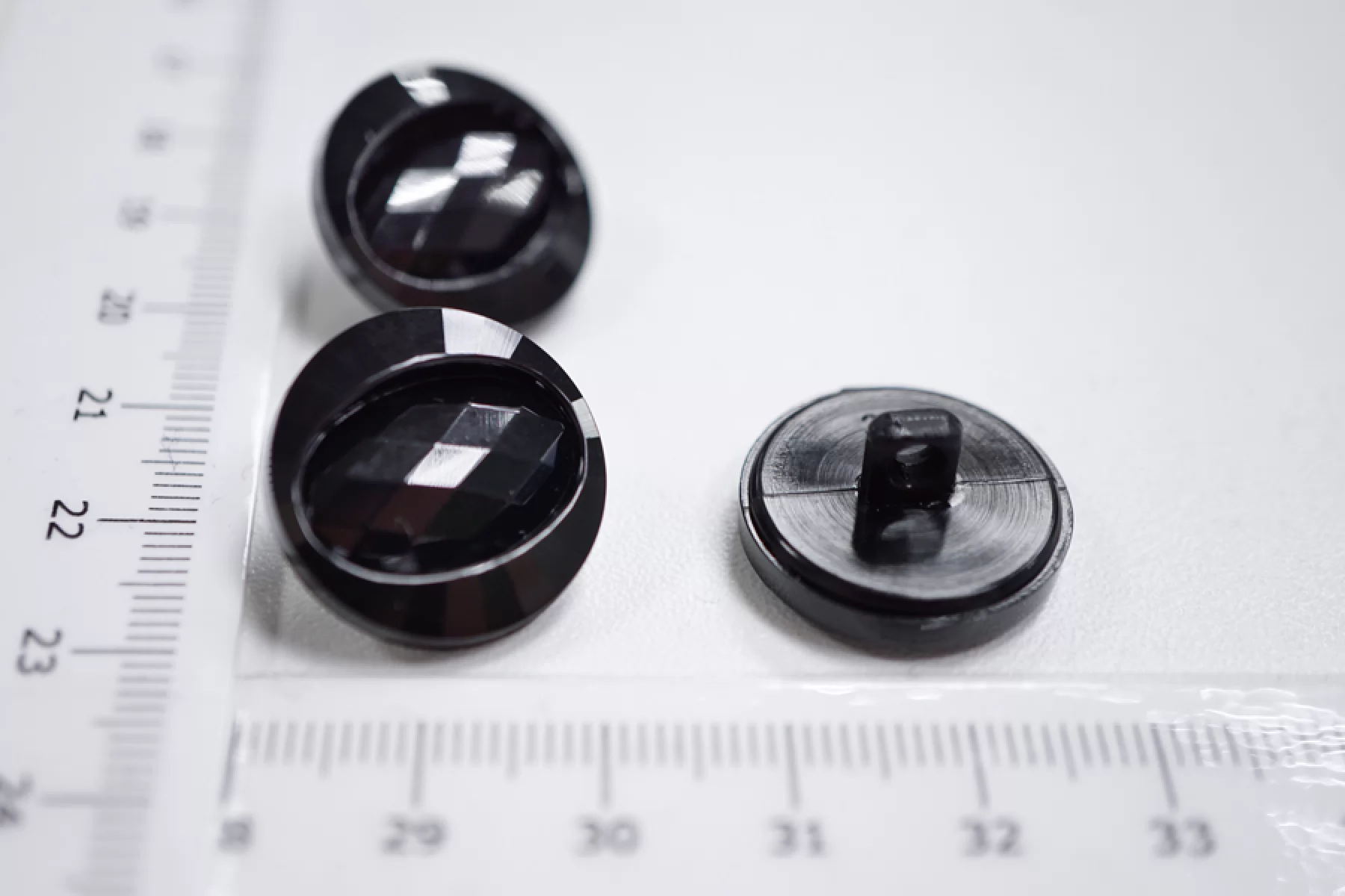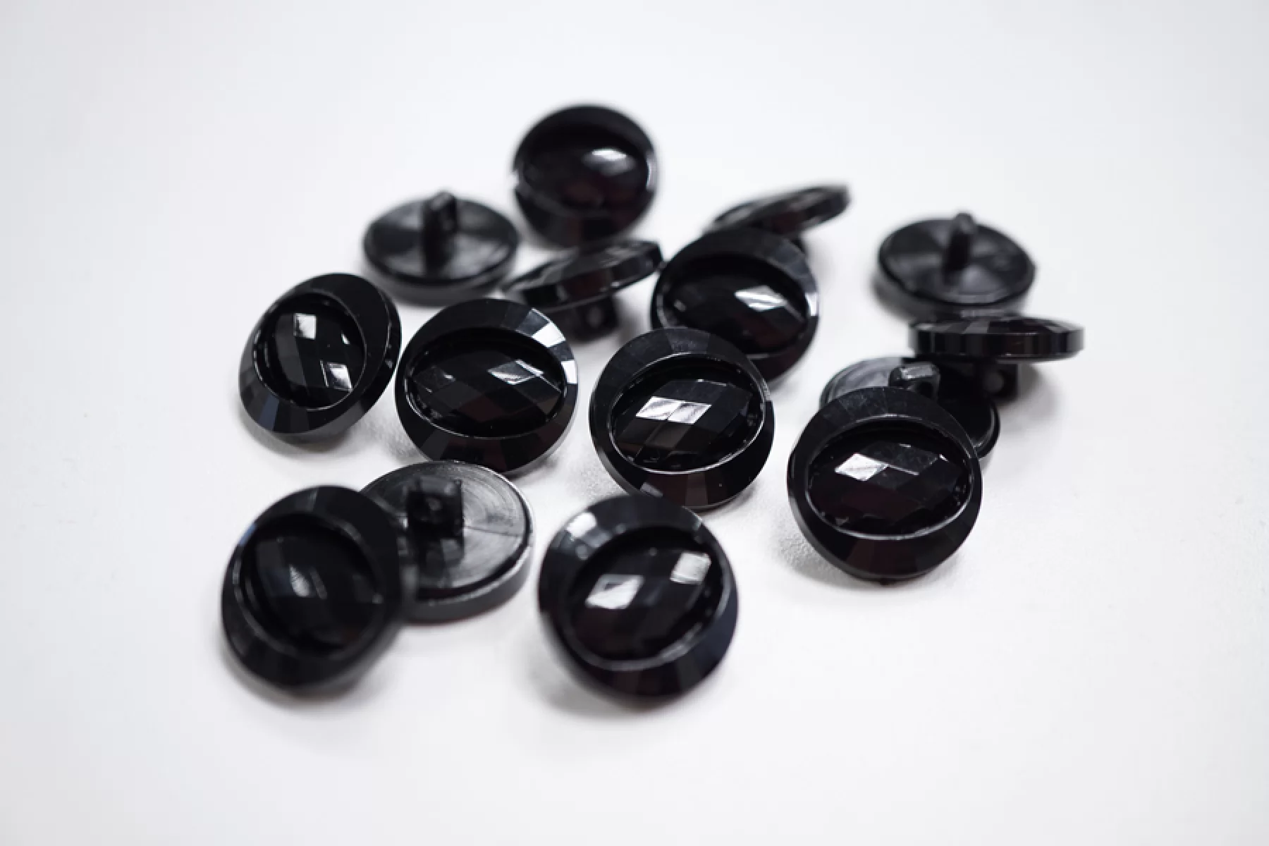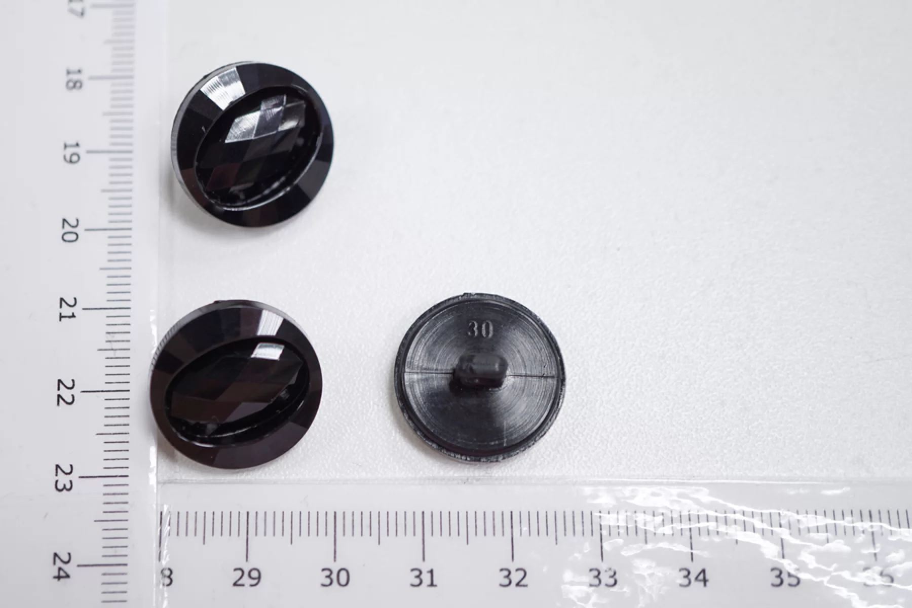 Пуговица костюмно-пальтовая из пластика, черного цвета. На ободке и в серединке, выполненной в форме овала, находится множество граней, благодаря которым пуговка красиво переливается. Диаметр - 20 мм.