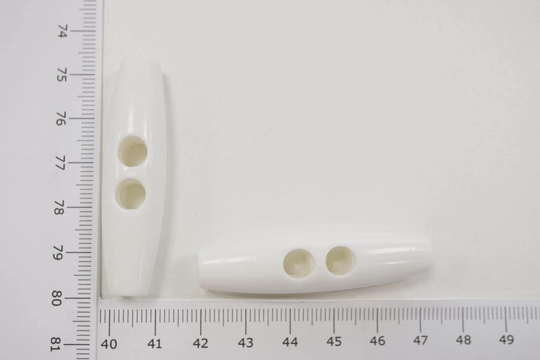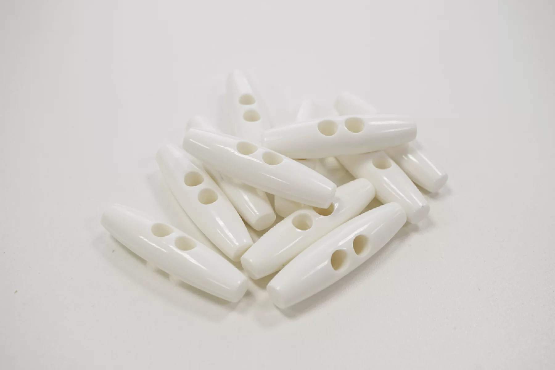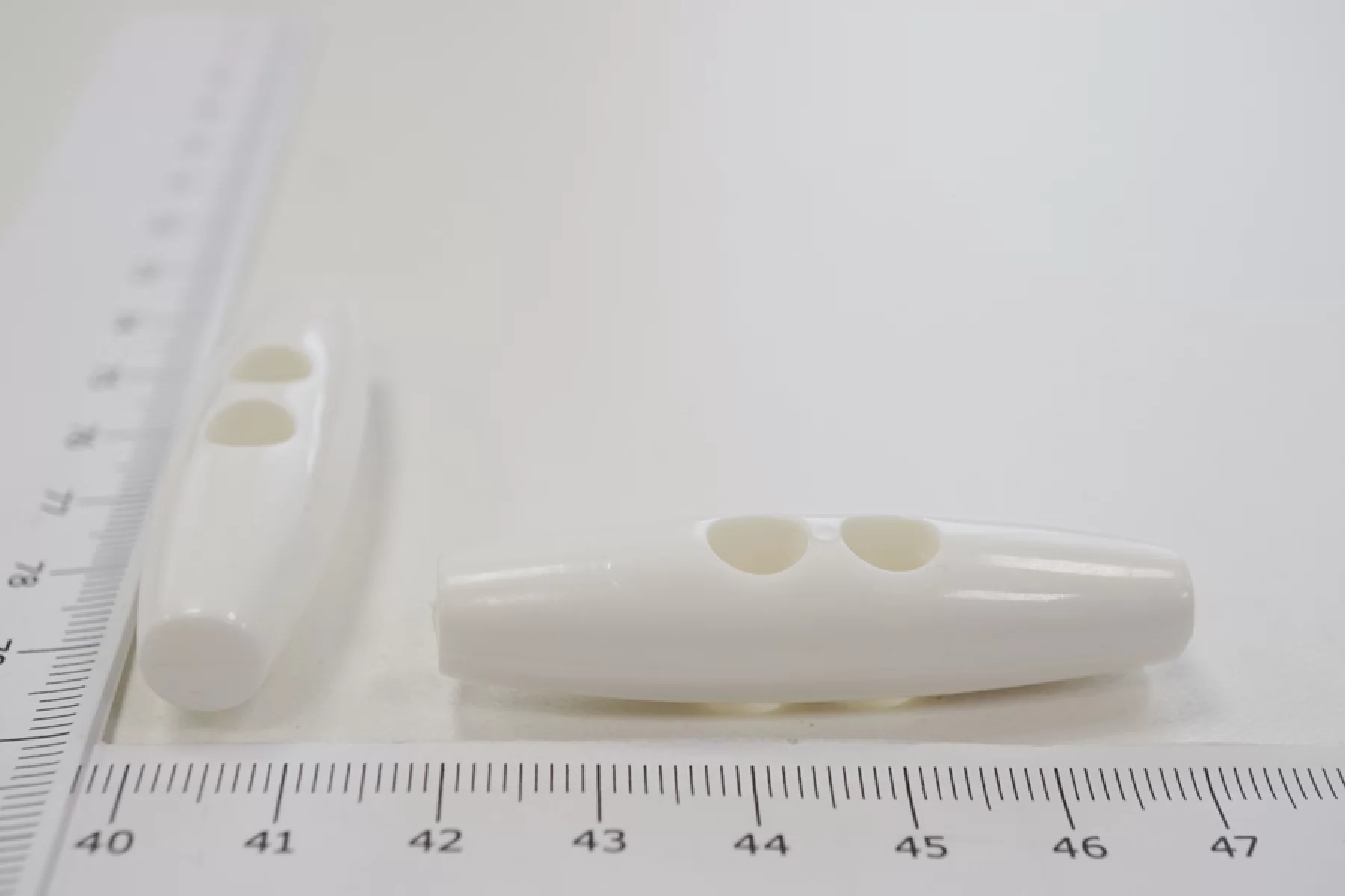 Пуговица костюмно-пальтовая из пластмассы, размер 51 мм, белого цвета цилиндрической формы.