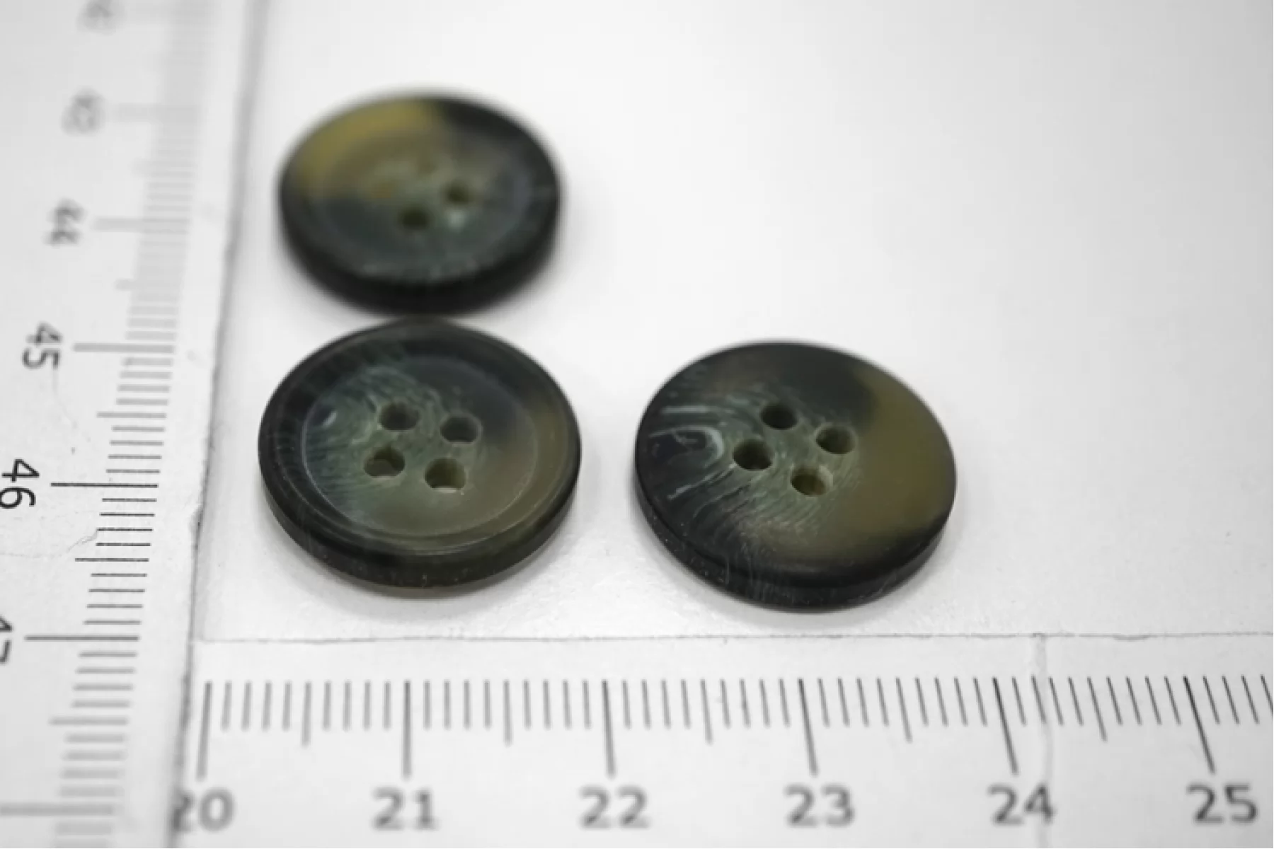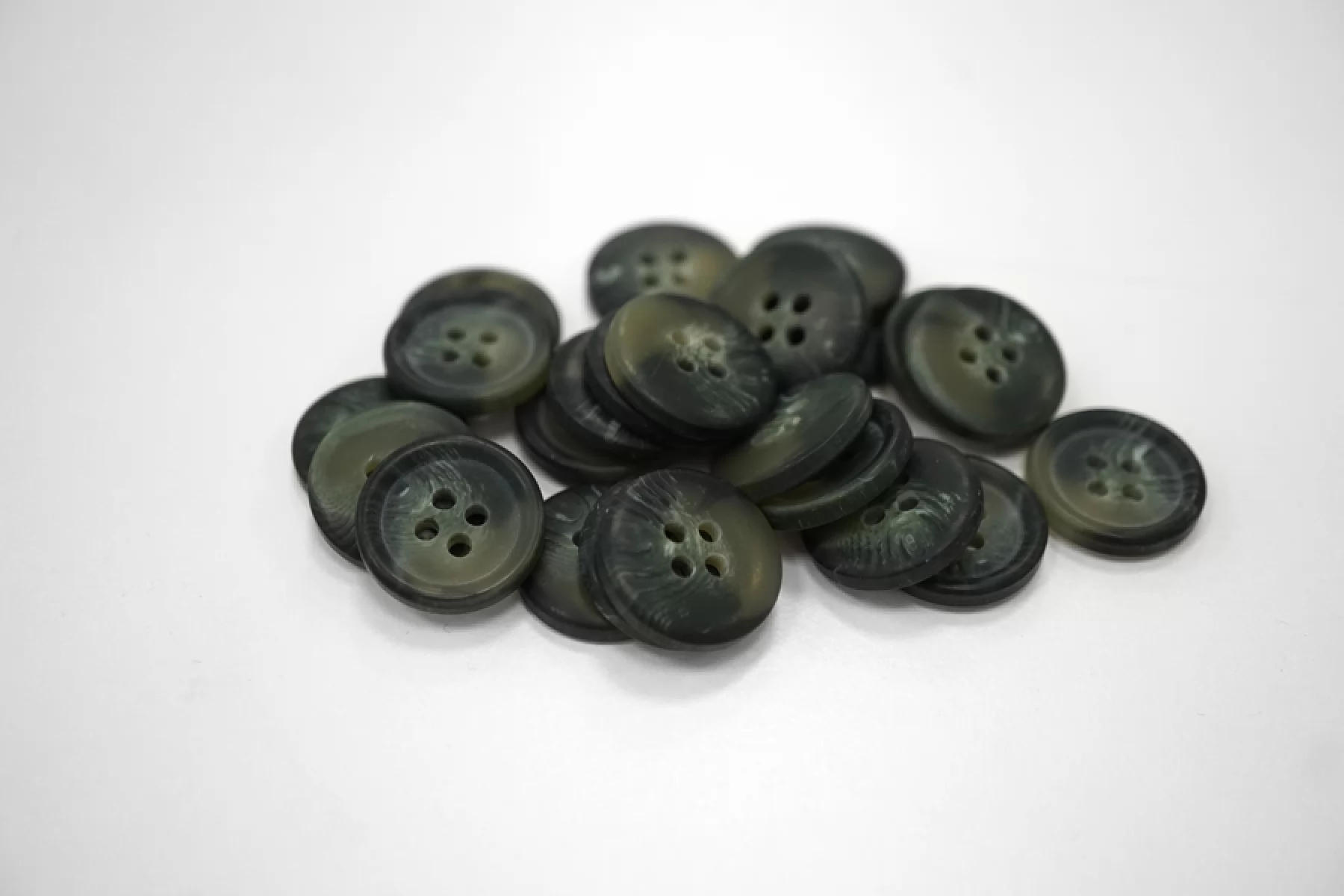 Пуговица костюмно-пальтовая из пластмассы, размер 18 мм, под рог, черно-зеленого цвета.