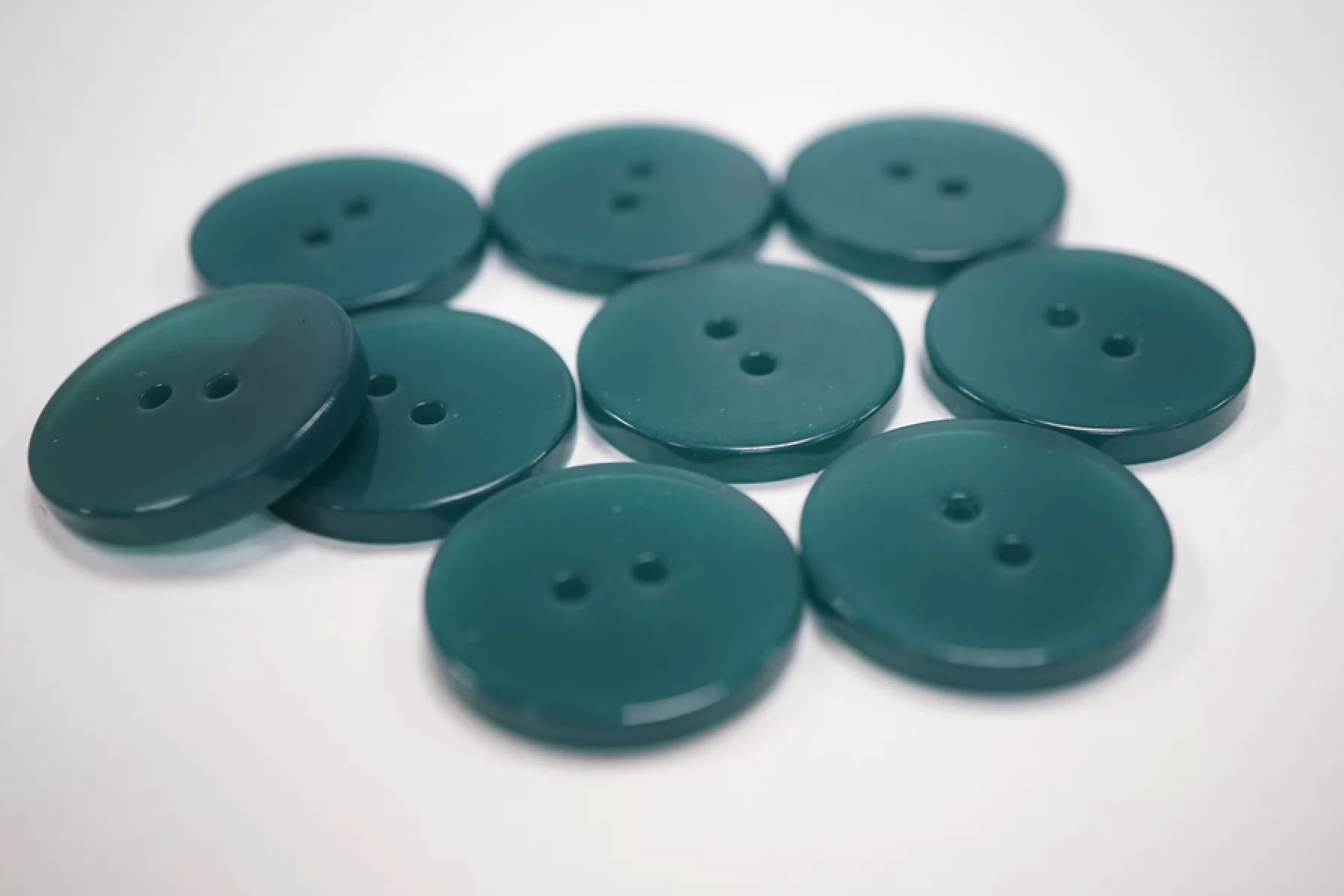 Пуговица костюмная из пластмассы, размер 22 мм, в неярком бирюзовом цвете, с гладкой поверхностью, немного прозрачная.