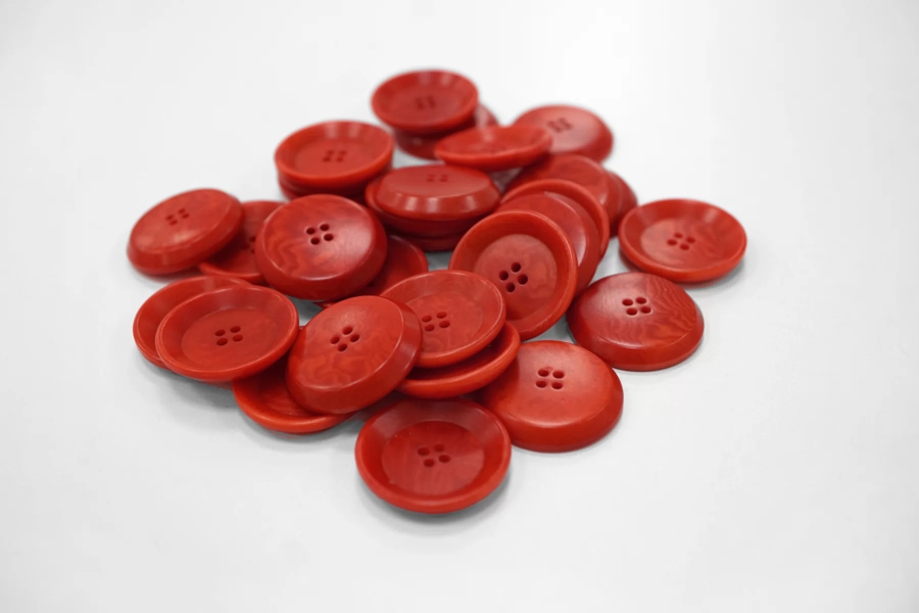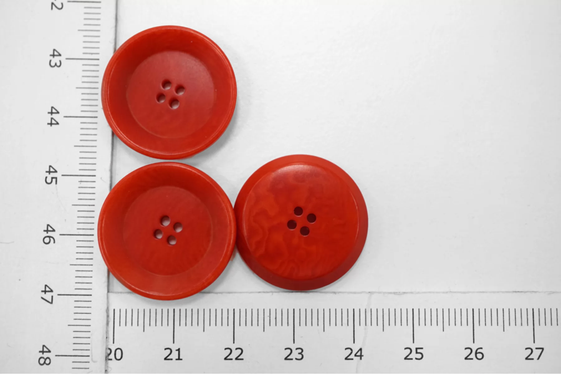 Пуговица костюмно-пальтовая из пластмассы, размер 23 мм, красно-рыжего цвета, с волнообразным узором.