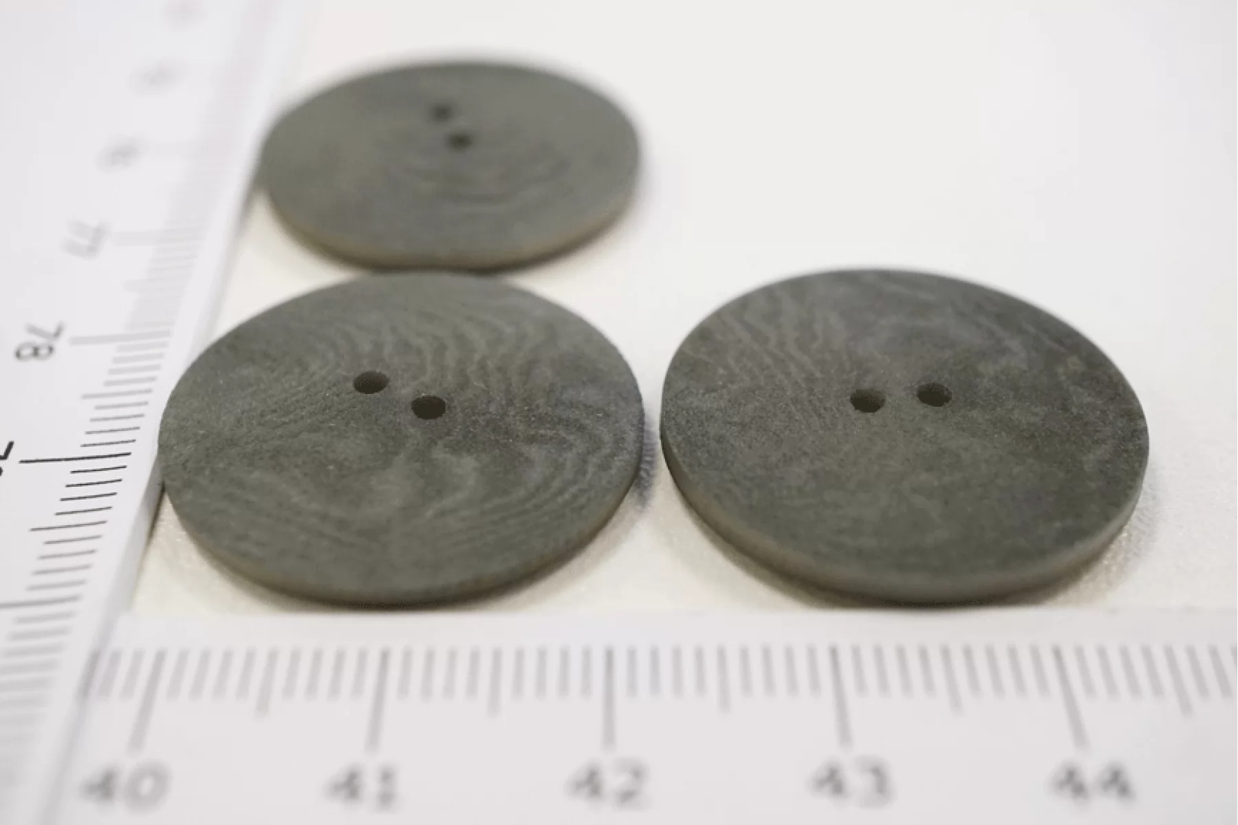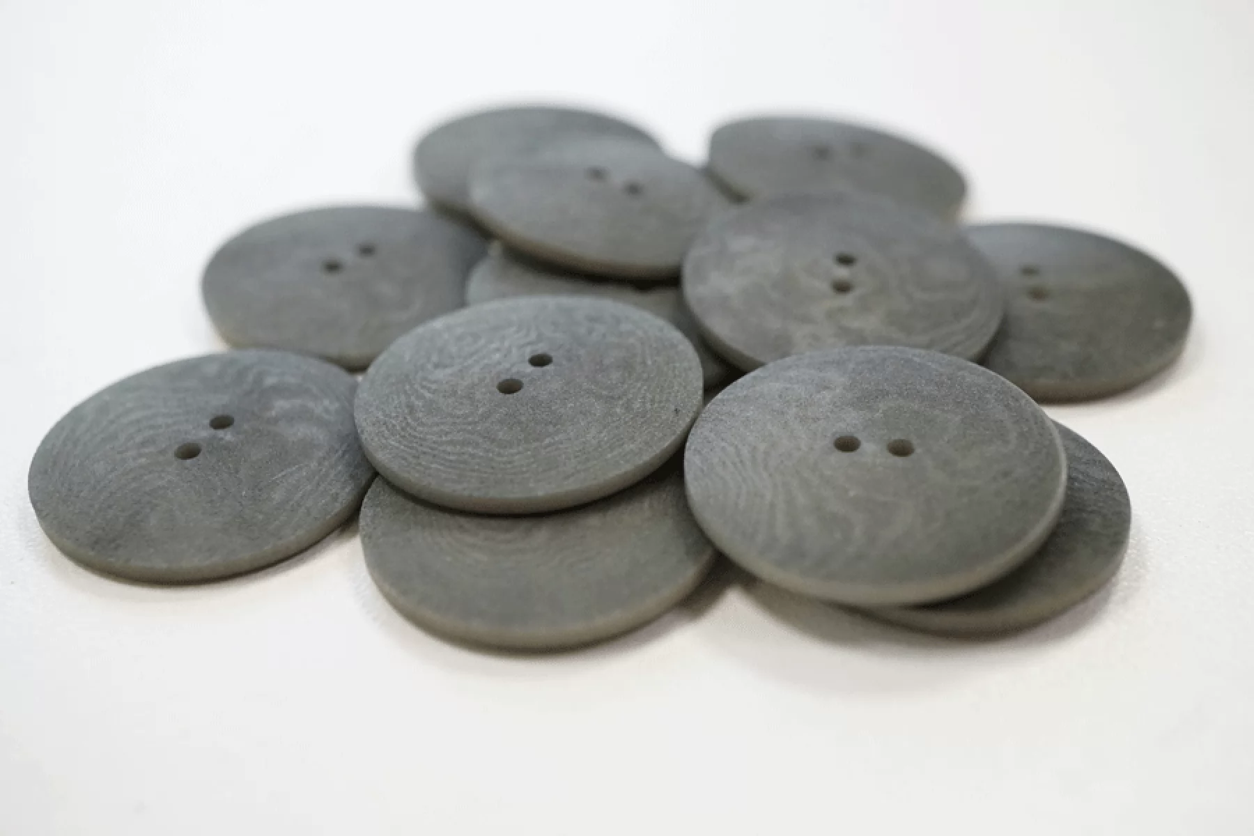 Пуговица костюмно-пальтовая из пластмассы, размер 24 мм, серого цвета цвета, со слегка шероховатой матовой поверхностью.
