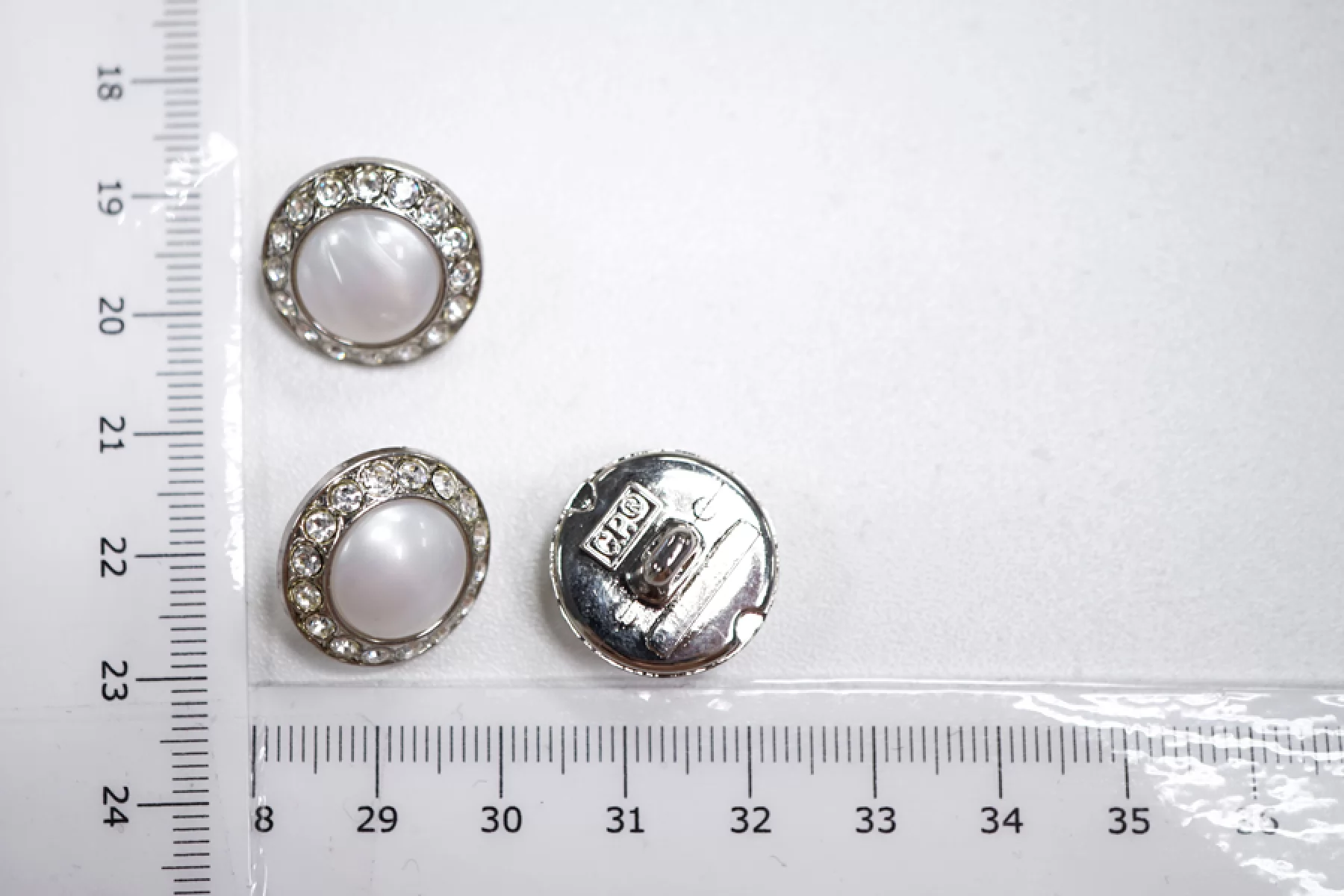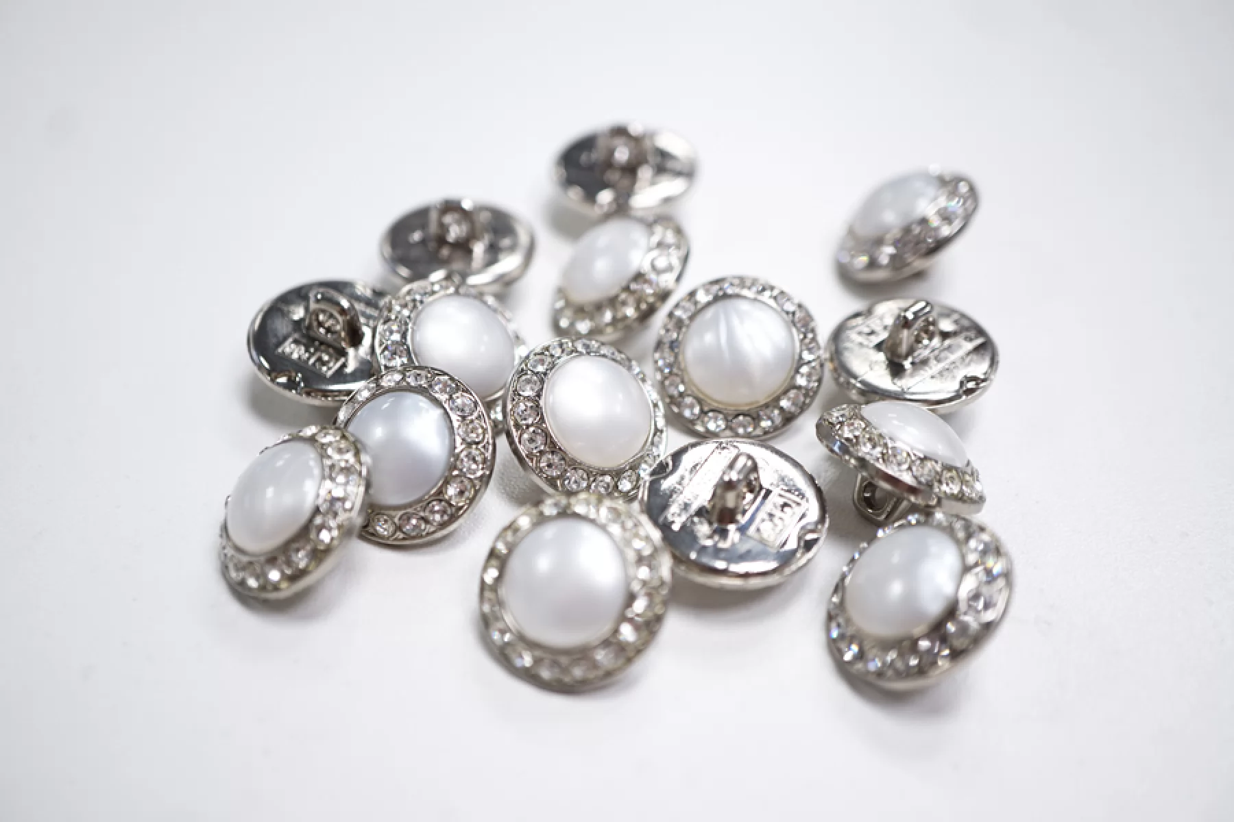 Пуговица костюмно-плательная из пластика, серебряного цвета с имитацией жемчуга в серединке. Имитация металла со стразами на ободке. Диаметр - 18 мм.