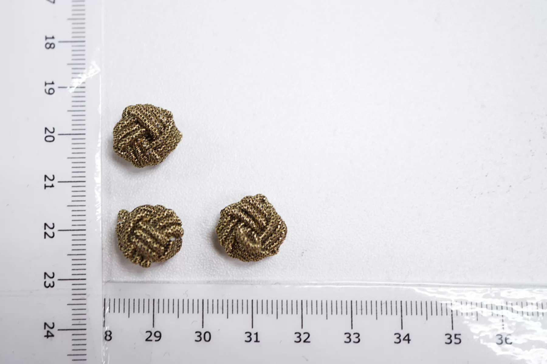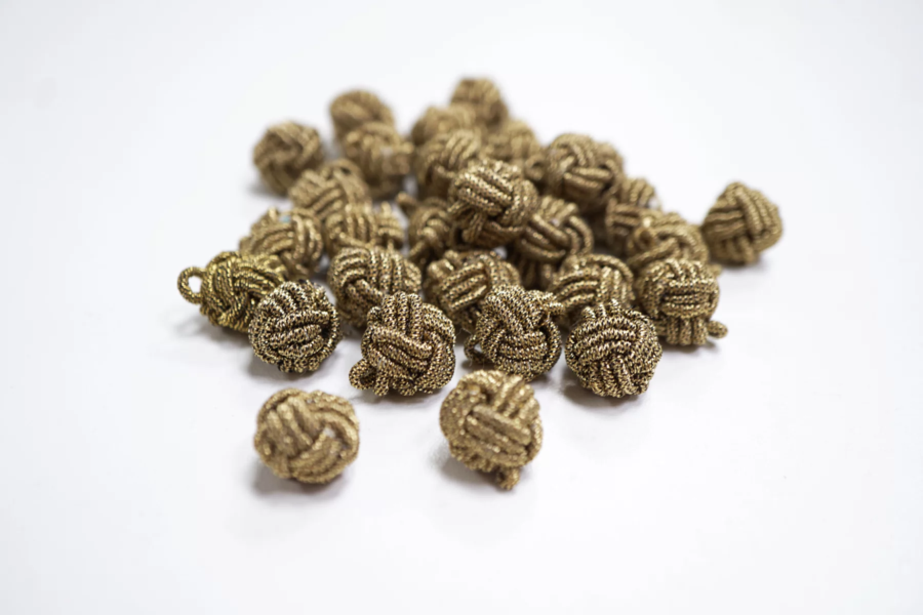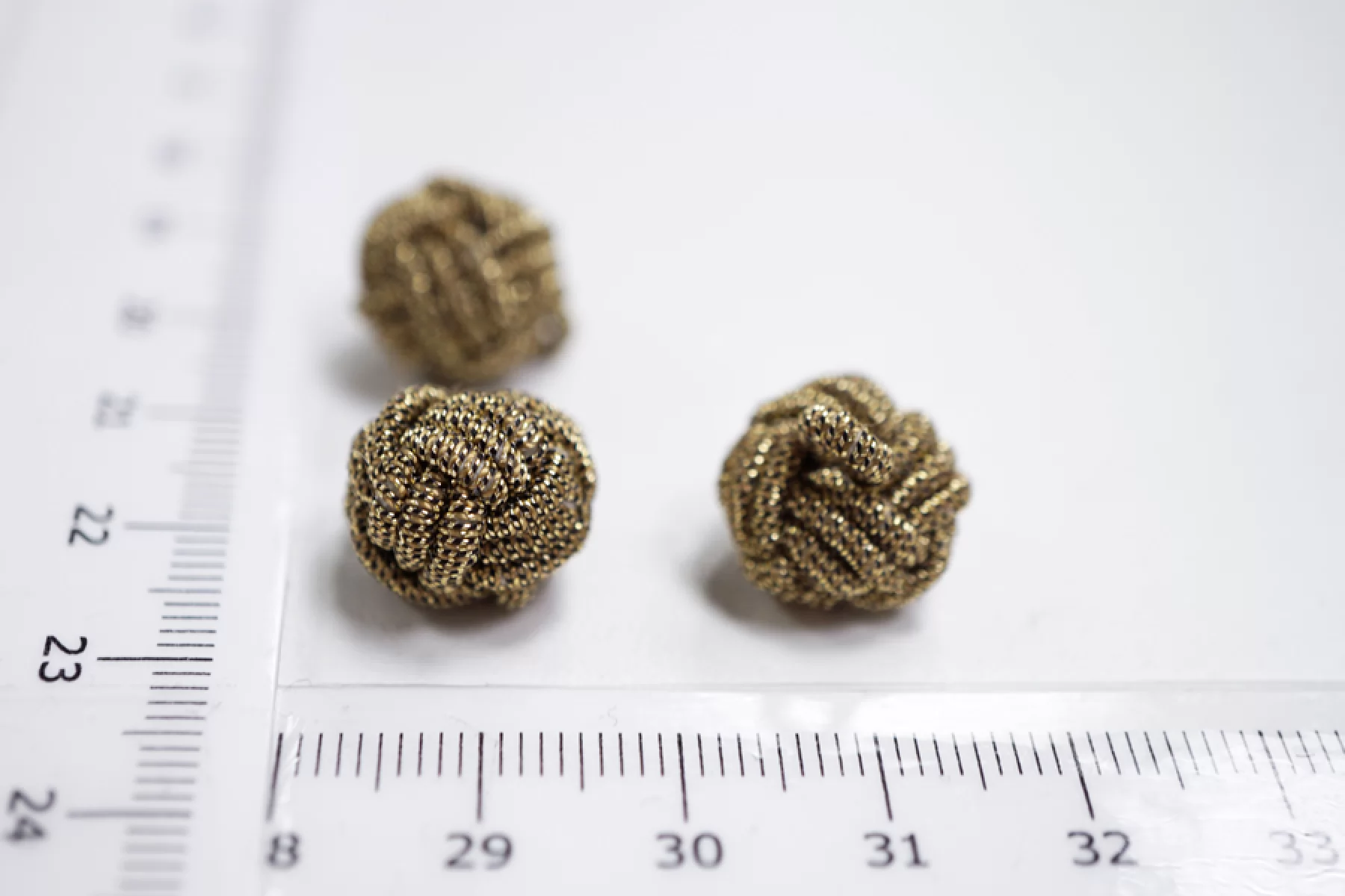 Пуговица костюмно-плательная из текстиля, темно-золотистого цвета. Выполнена в форме узелка из тонких жгутиков. Размер 14 мм, на ножке.