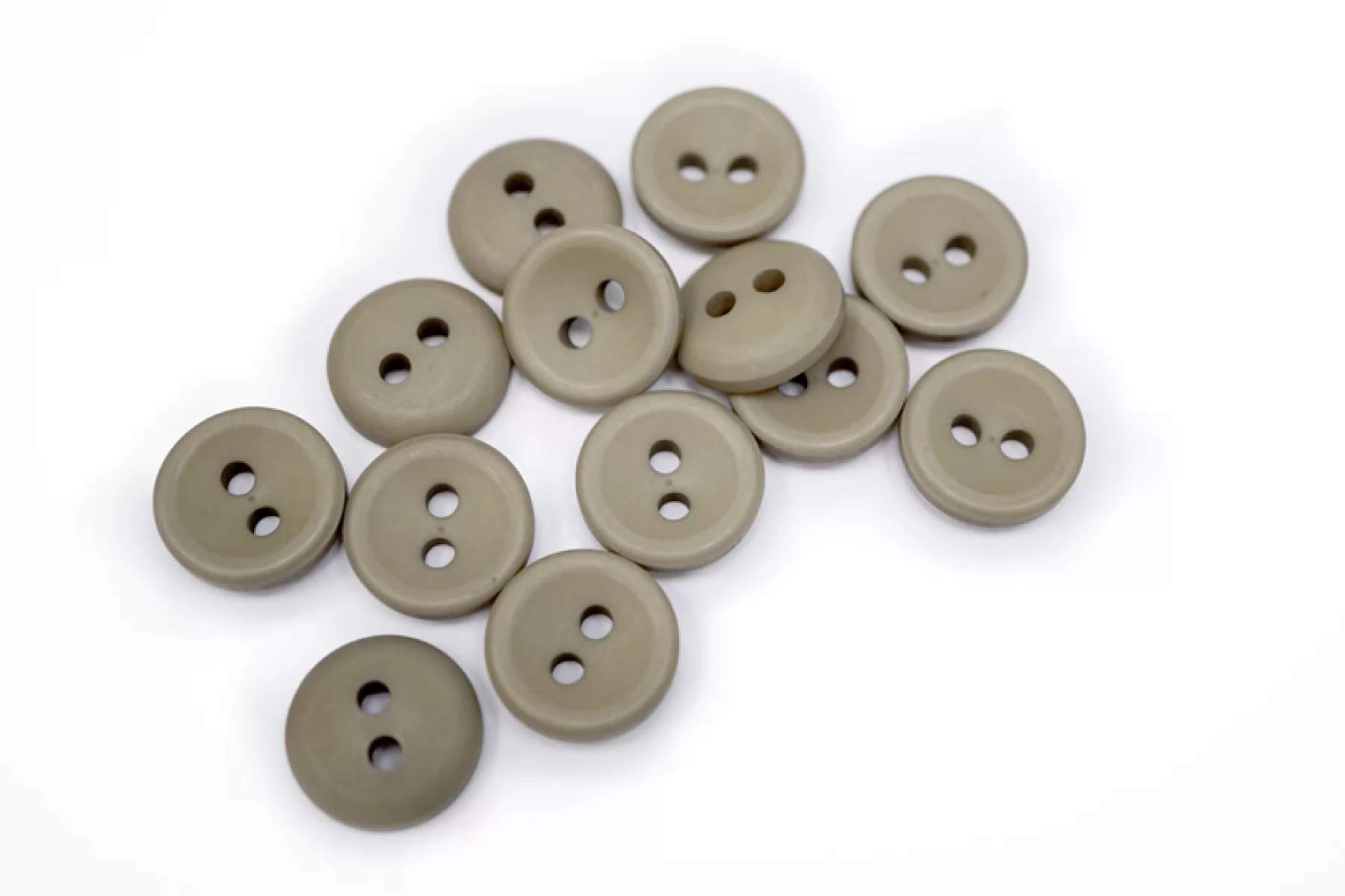 Пуговица костюмно-плательная пластиковая, матовая, размер 18 мм, приглушенно-оливкового цвета.