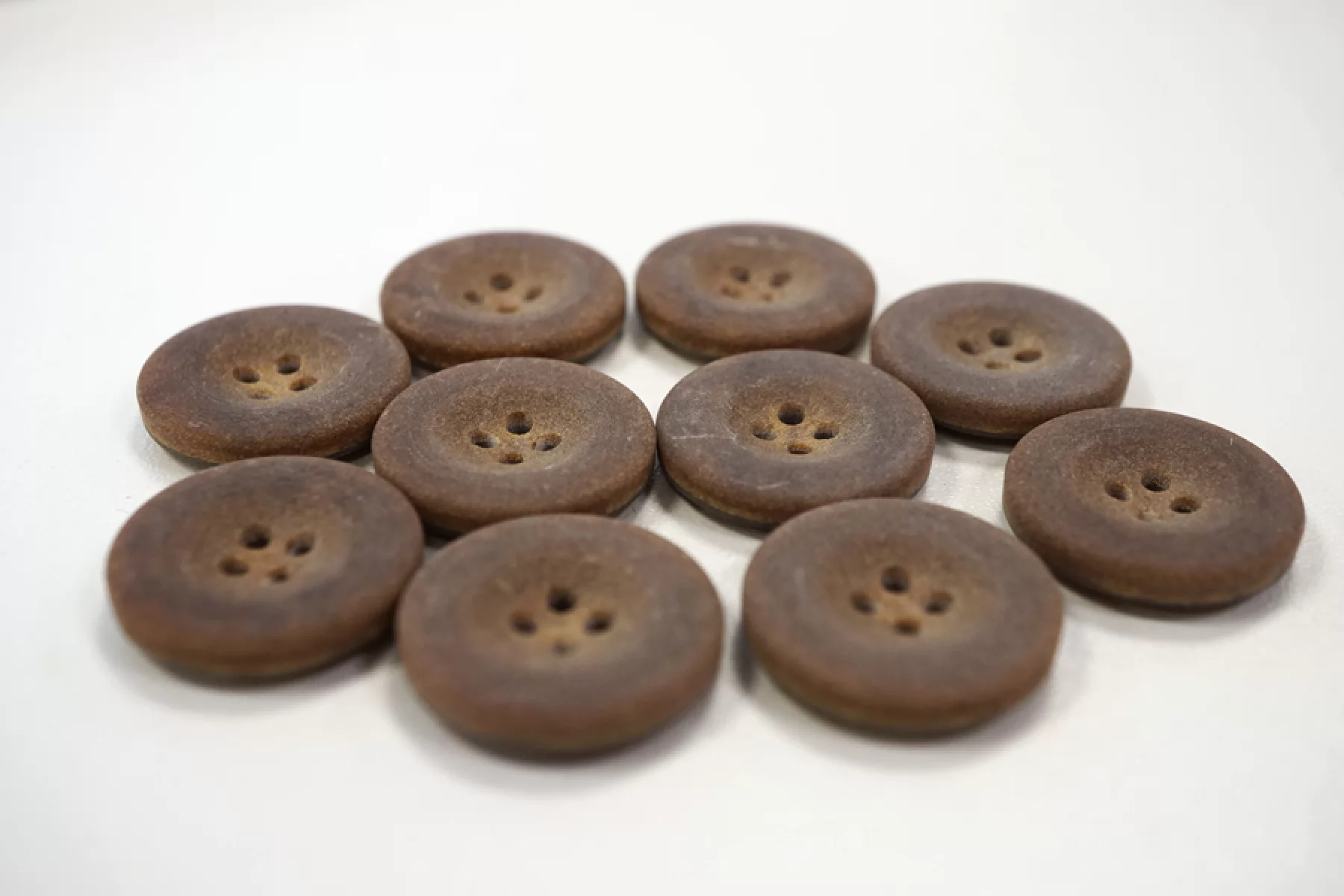 Пуговица костюмная из пластмассы, размер 22 мм, коричневого цвета, с интересной текстурой, похожей на гальку.