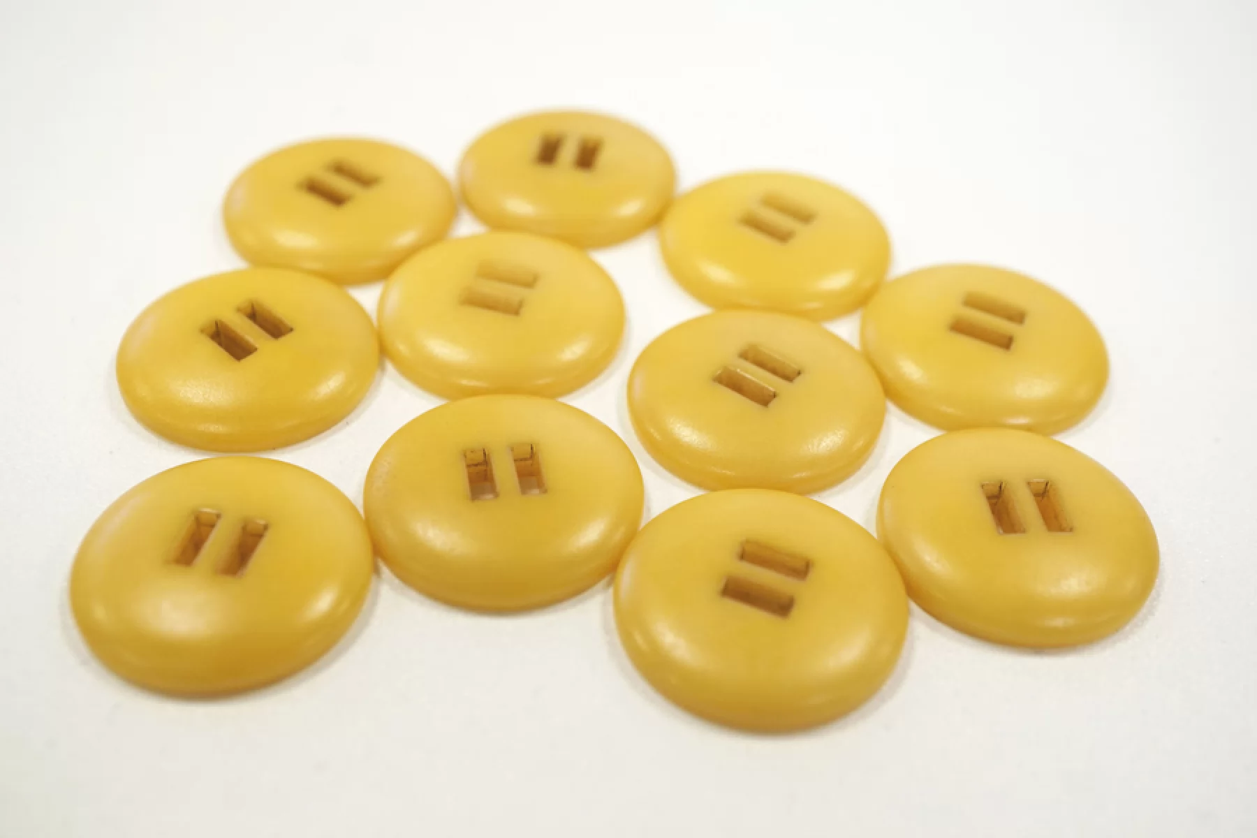 Пуговица костюмно-плательная из пластмассы, размер 22 мм, желтого цвета, с волнообразной окраской.