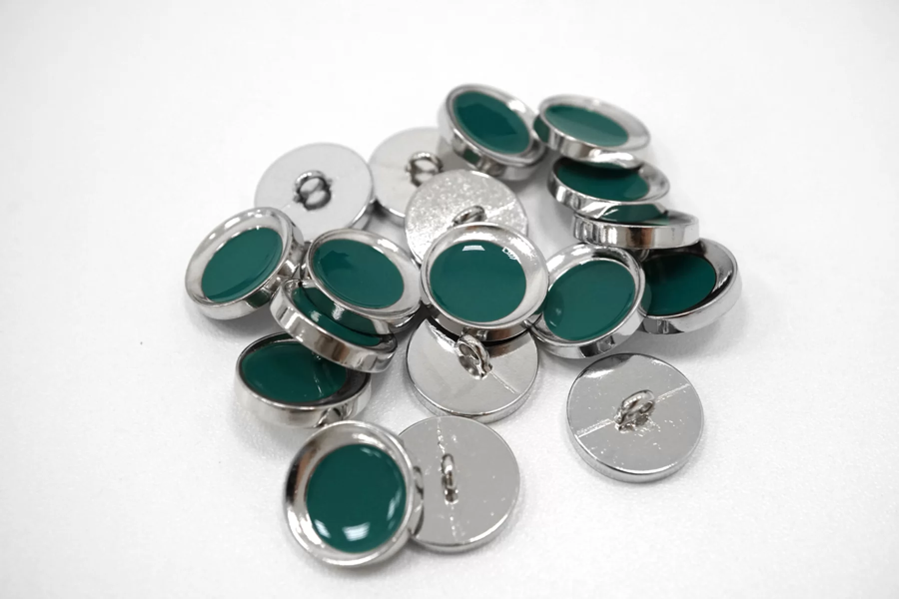 Пуговица костюмно-плательная из пластмассы, размер 18 мм, изумрудного цвета с серебристой каймой.