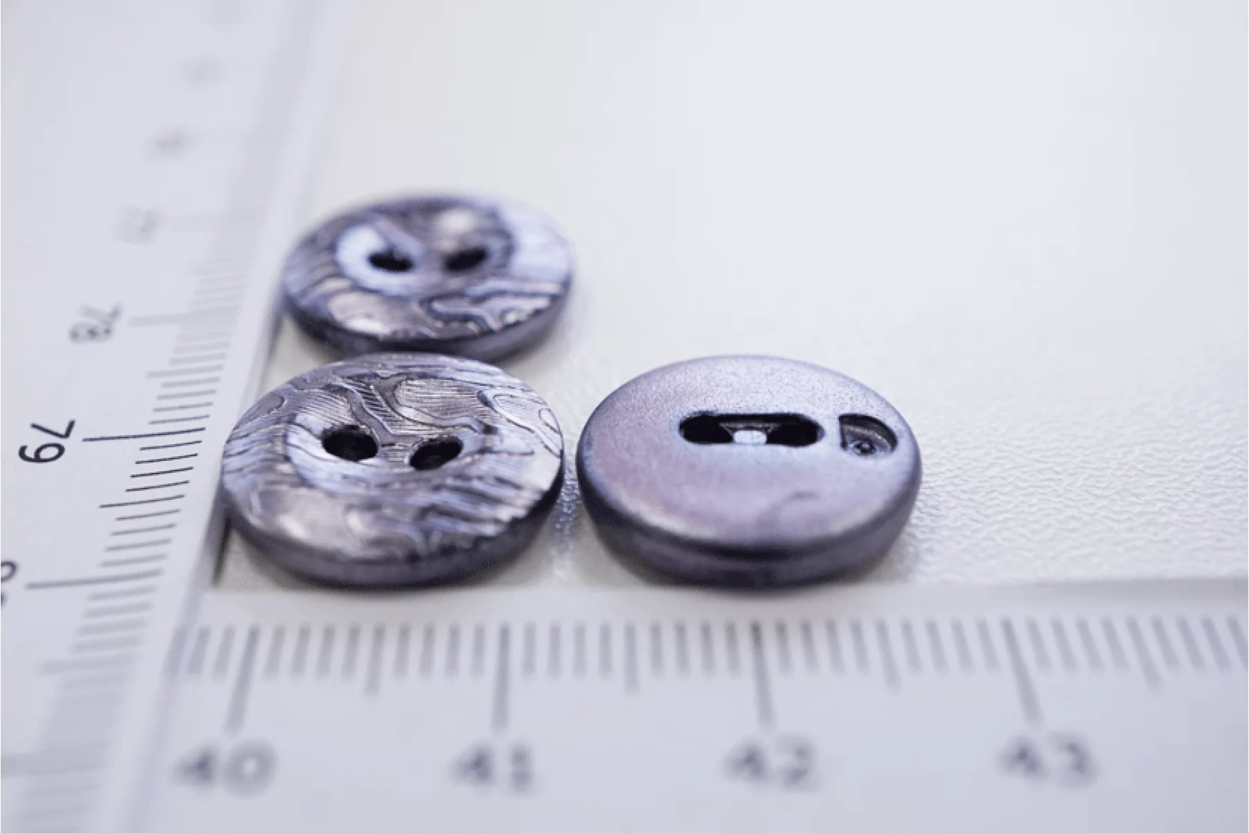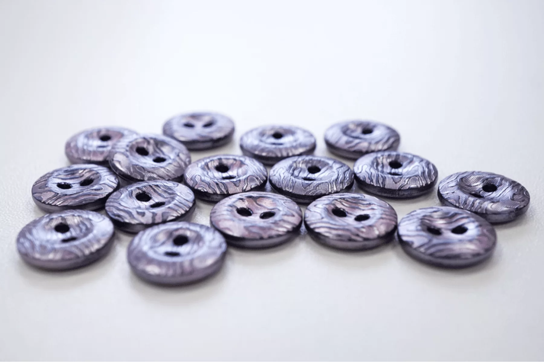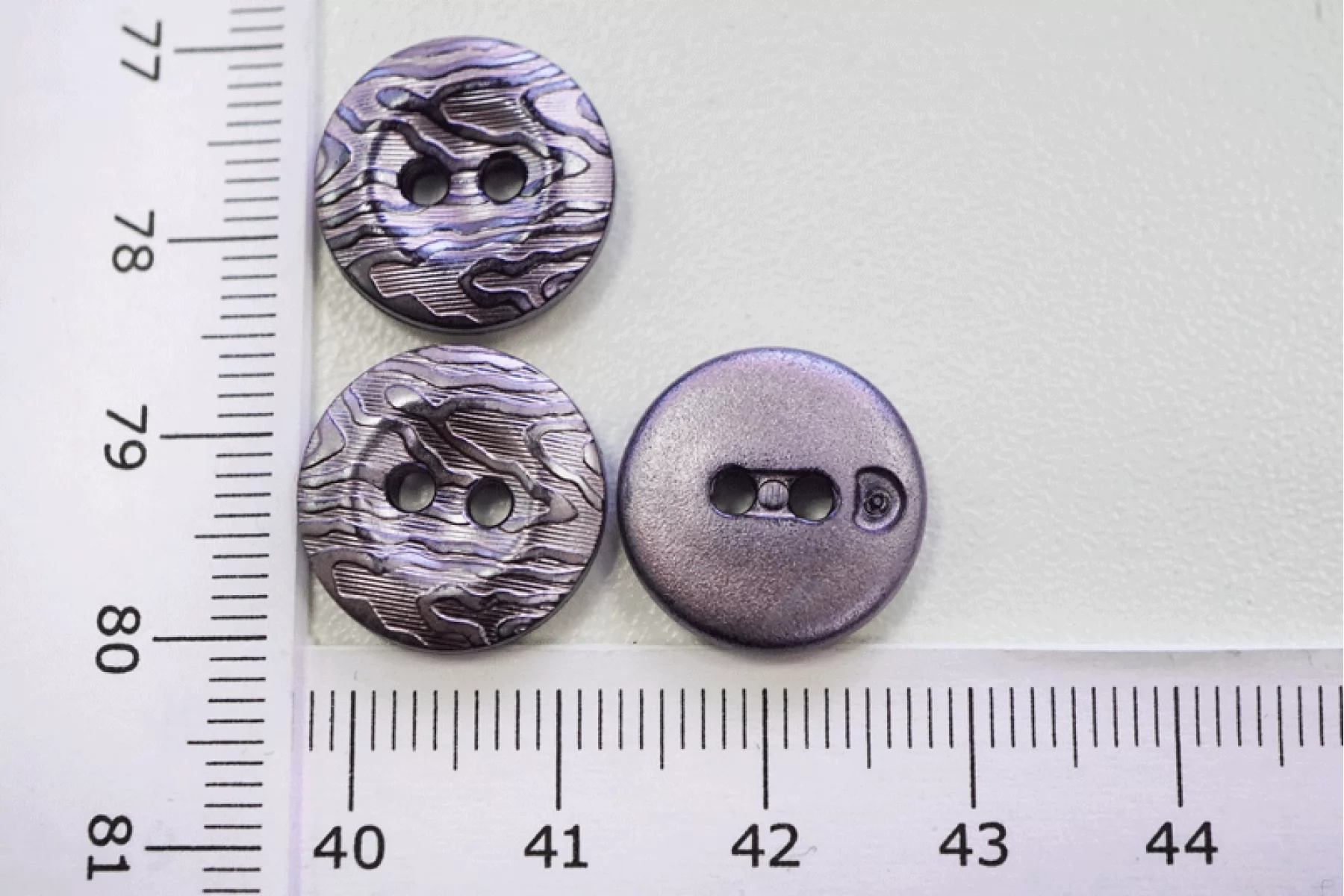 Пуговица костюмно-плательная из пластмассы, размер 15 мм, сиренево-черного цвета с фактурным орнаментом на поверхности.