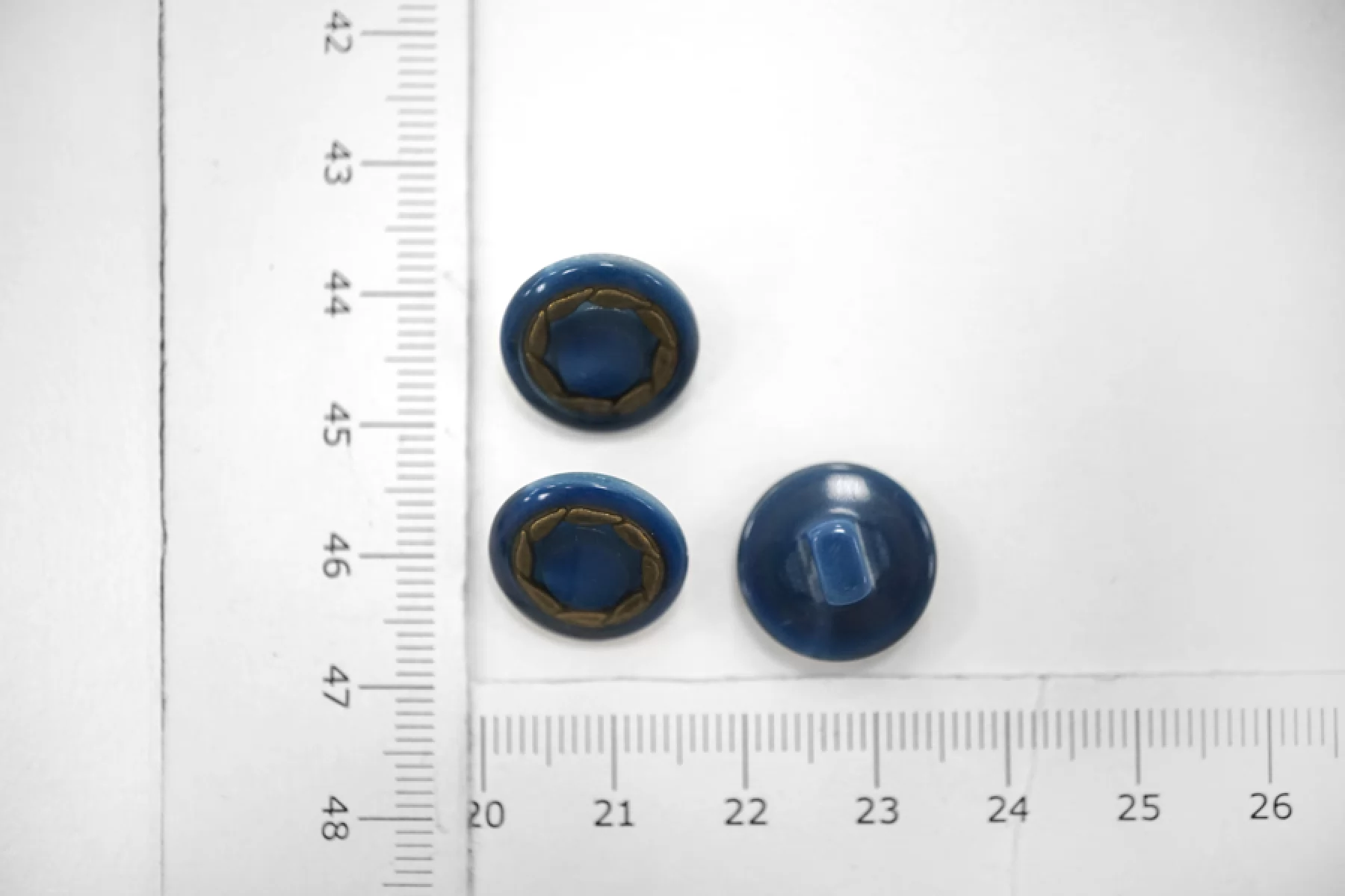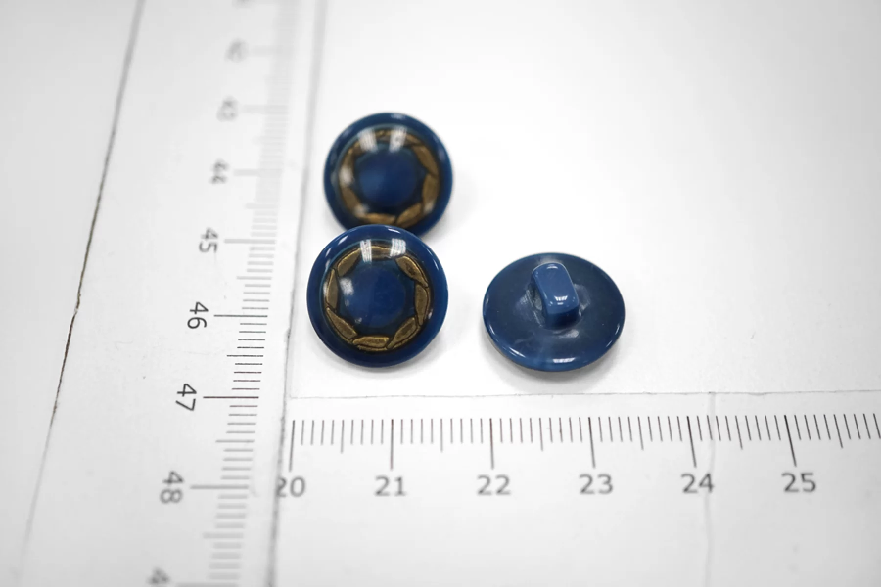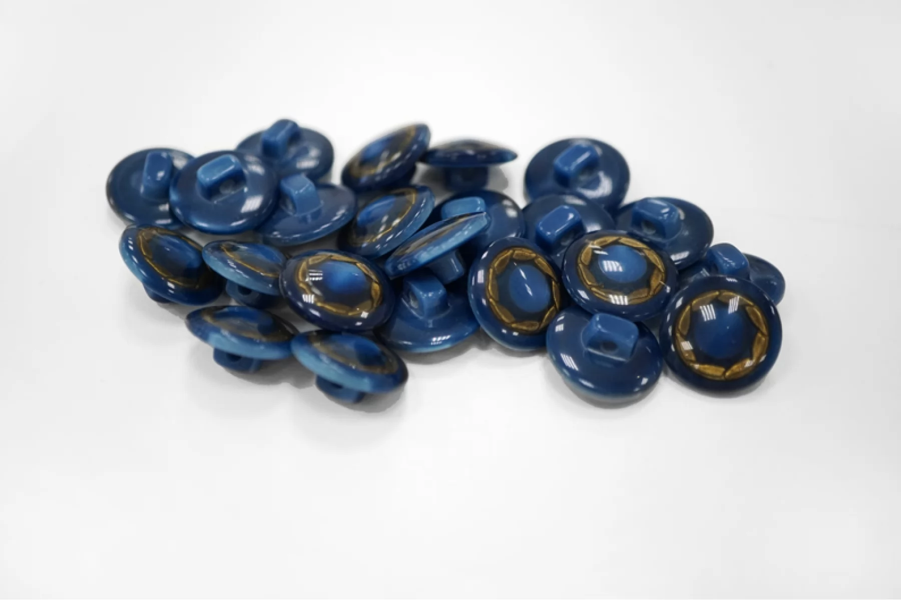 Пуговица костюмно-плательная из пластмассы, размер 15 мм, на ножке, синего цвета с золотистым ободком.