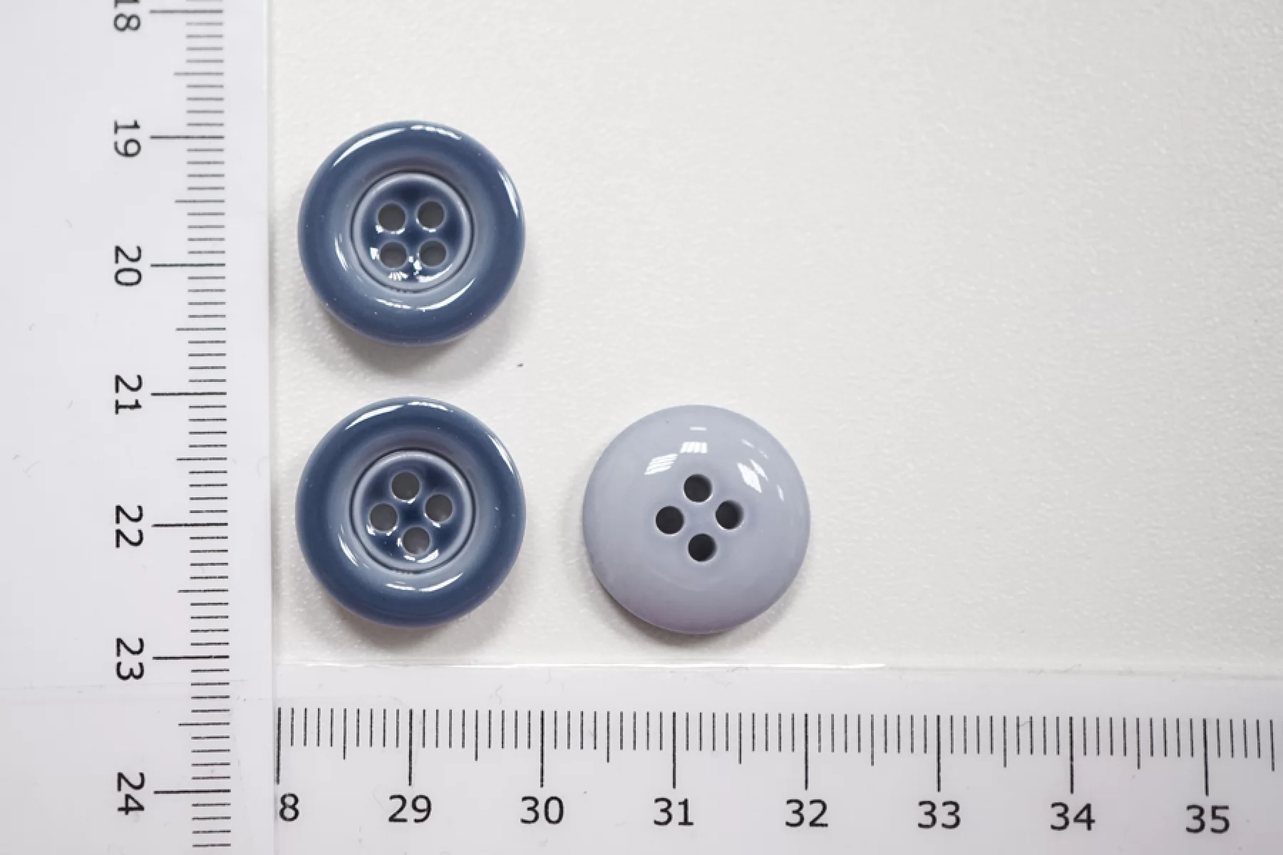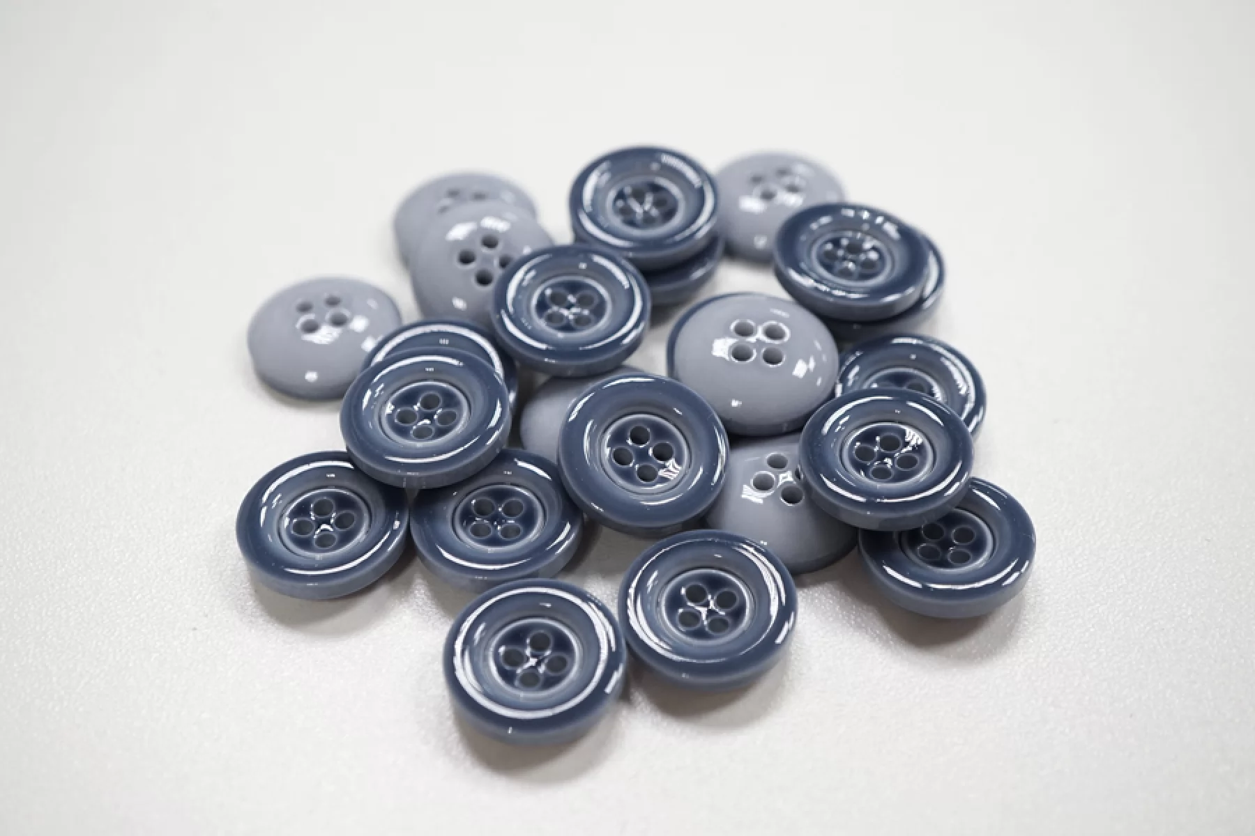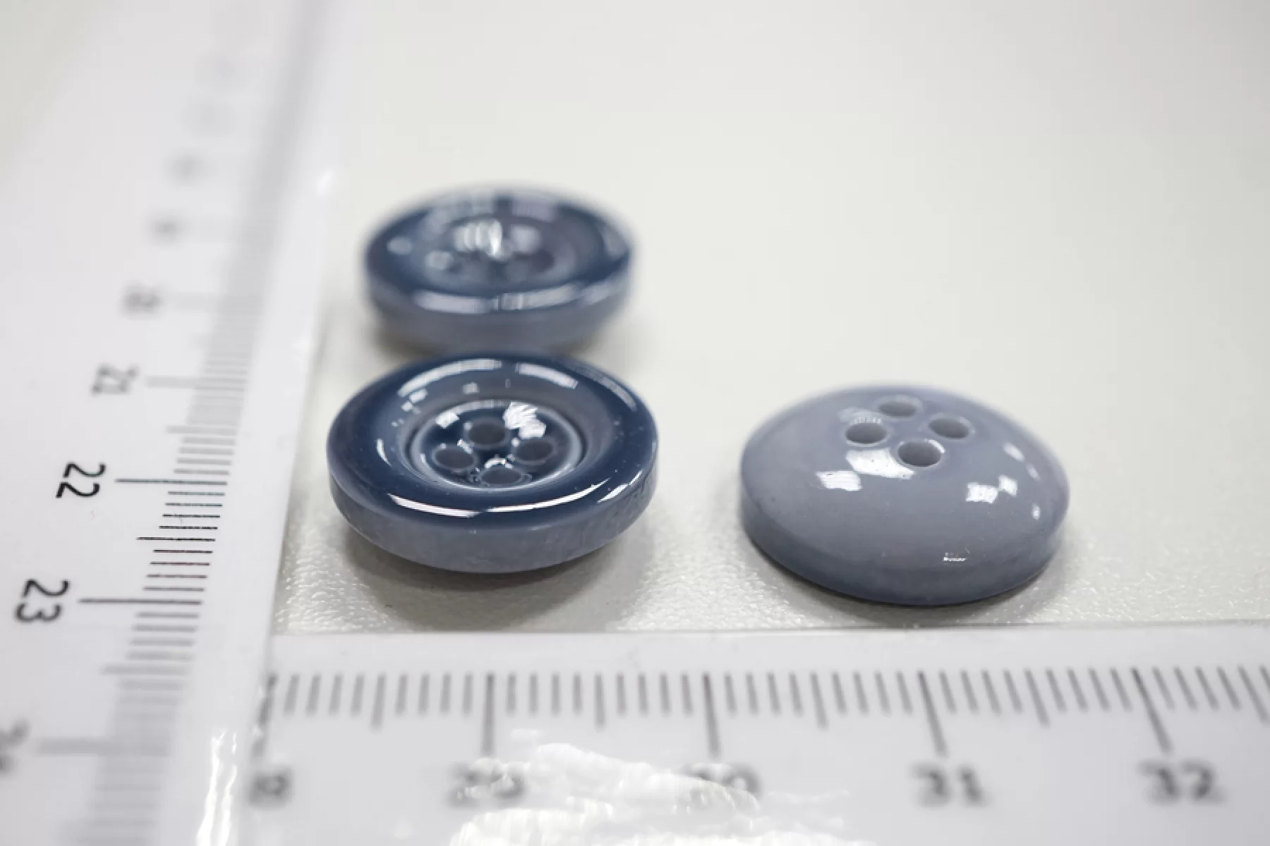 Пуговица костюмно-рубашечная пластиковая, размер 17 мм, серо-голубого цвета с гладкой глянцевой поверхностью и формой, похожей на блюдечко.