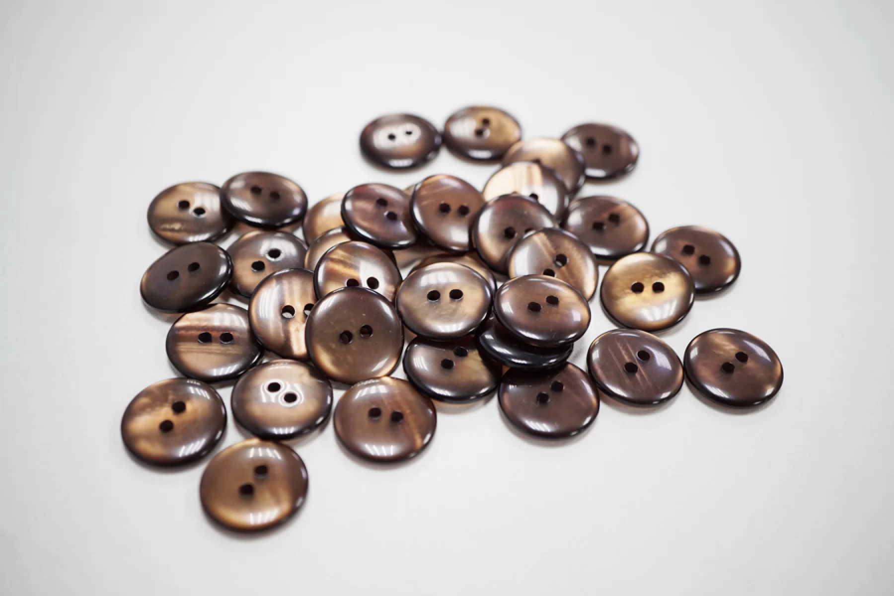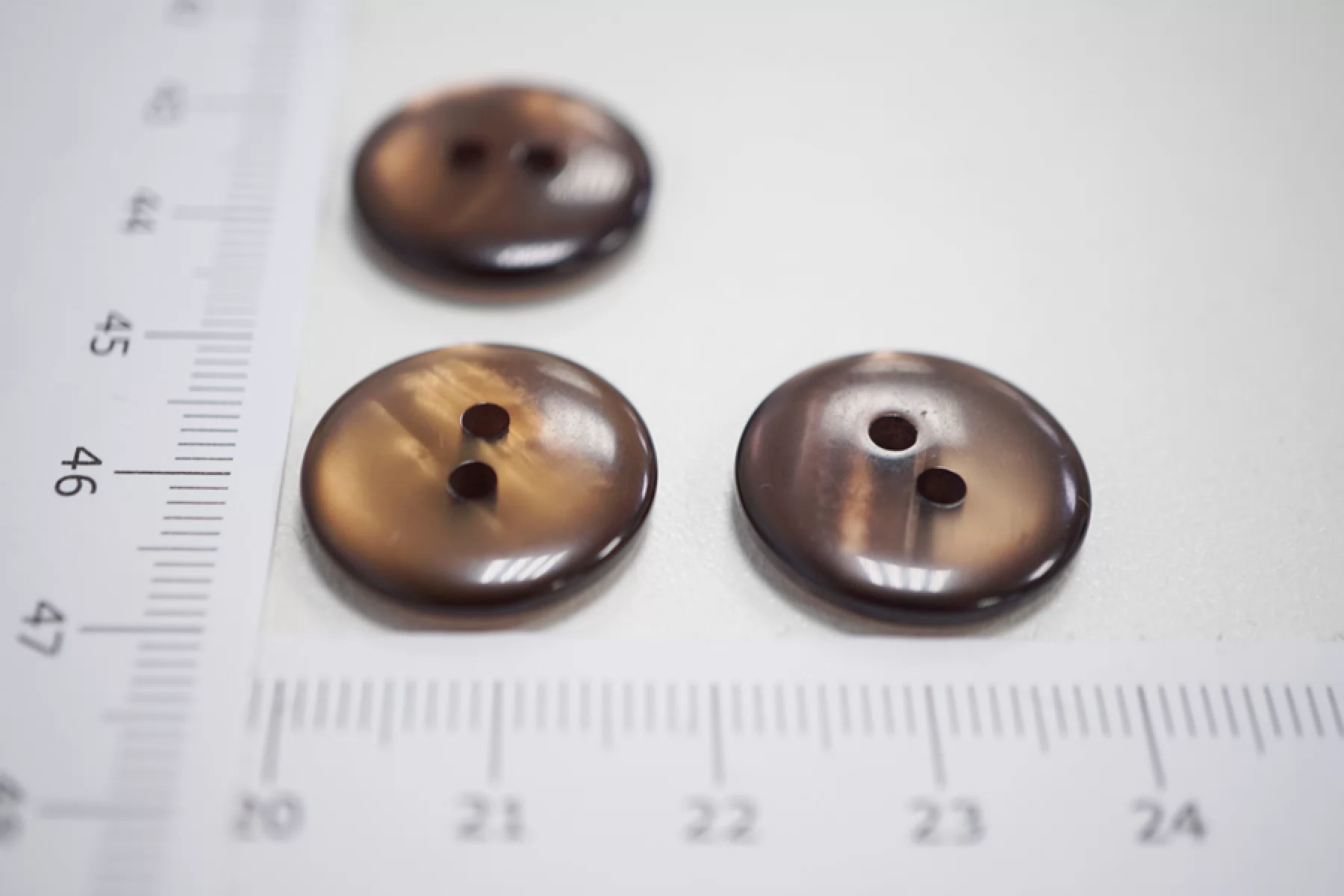Пуговица костюмно-рубашечная из пластмассы, размер 17 мм, коричневого цвета с желтоватыми переливами под перламутр.