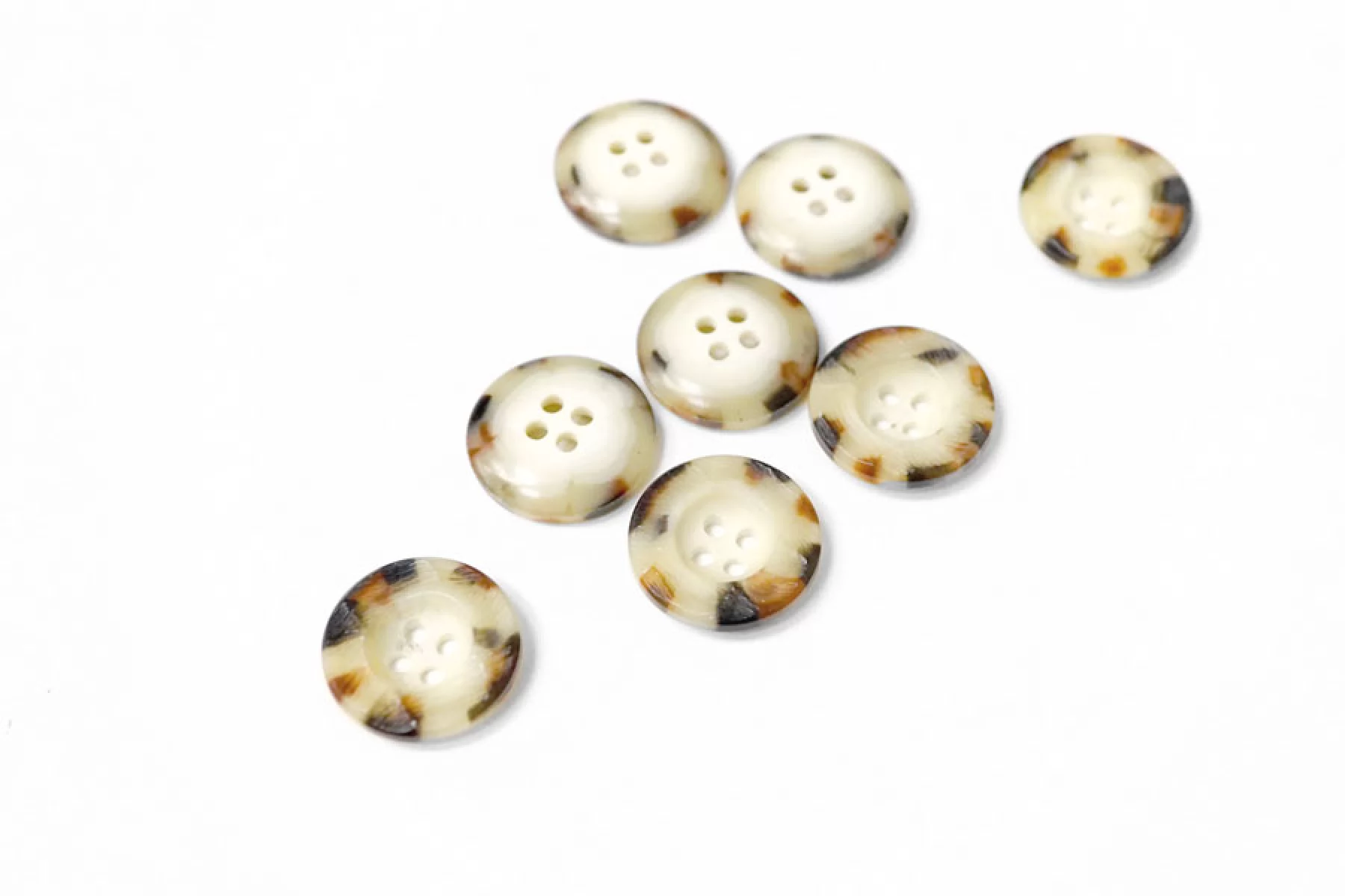 Пуговица костюмно-рубашечная под рог молочного цвета с коричнево-красными вкраплениями, с ребристой фактурой покругу, пластиковая, размер 18 мм.