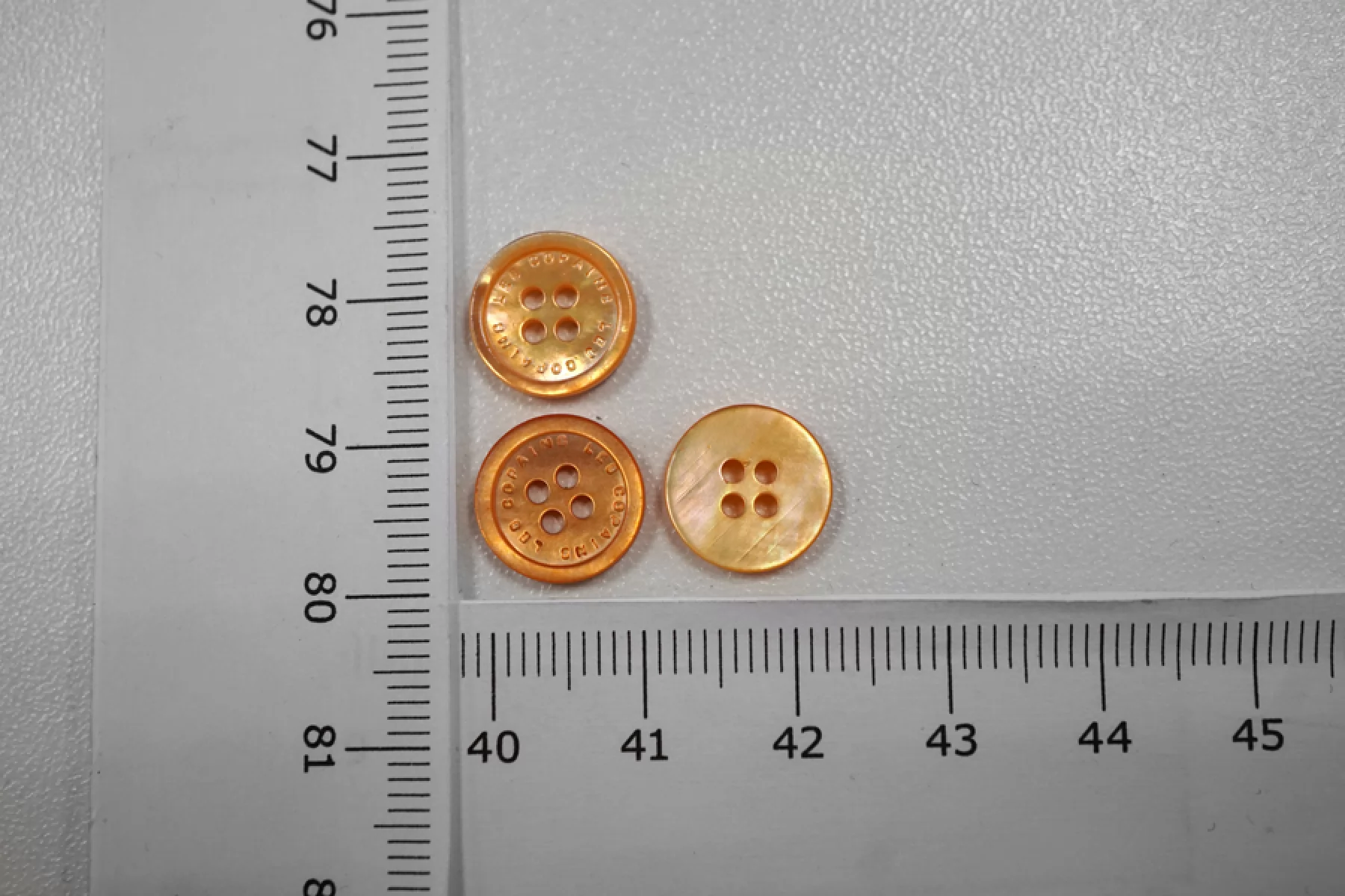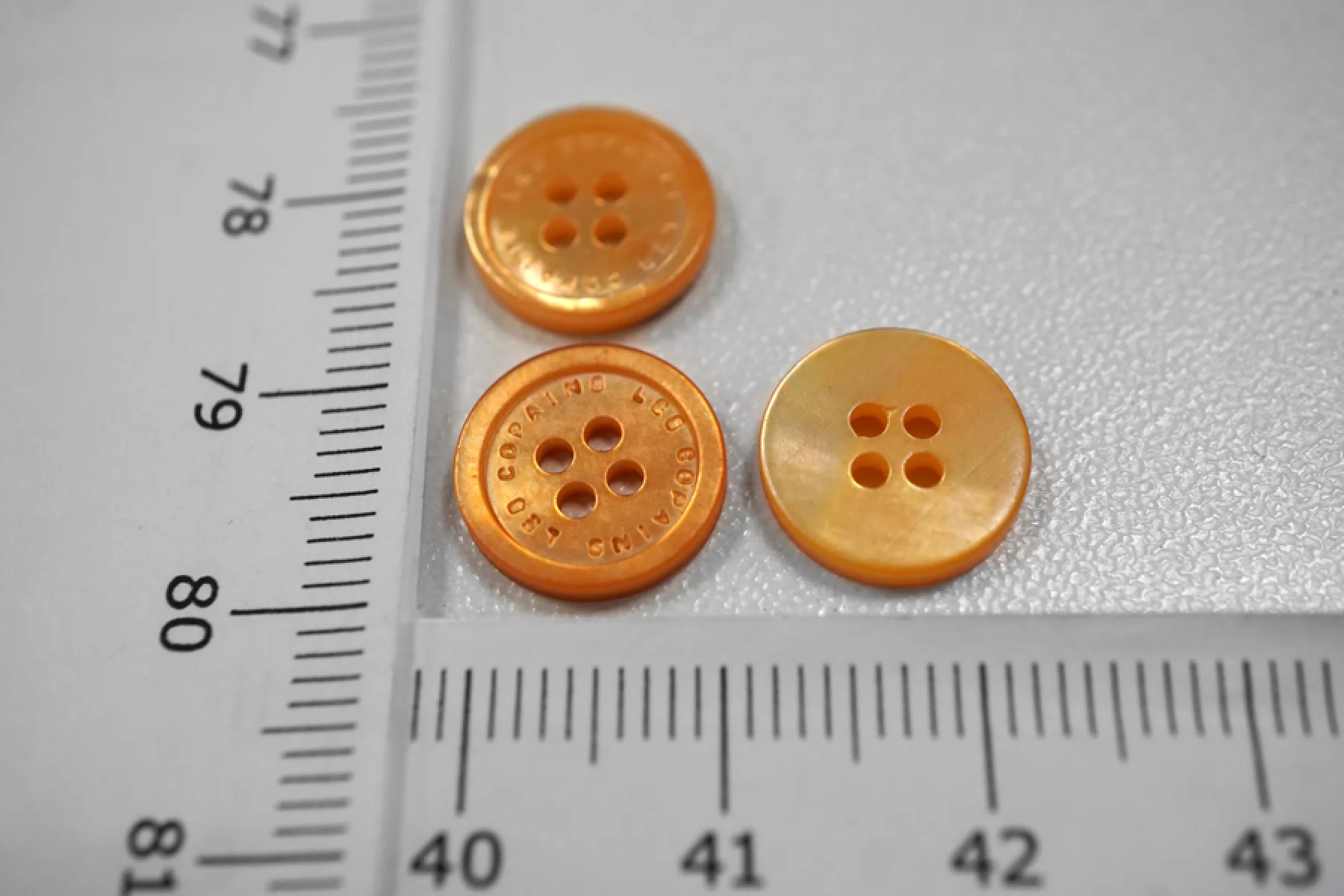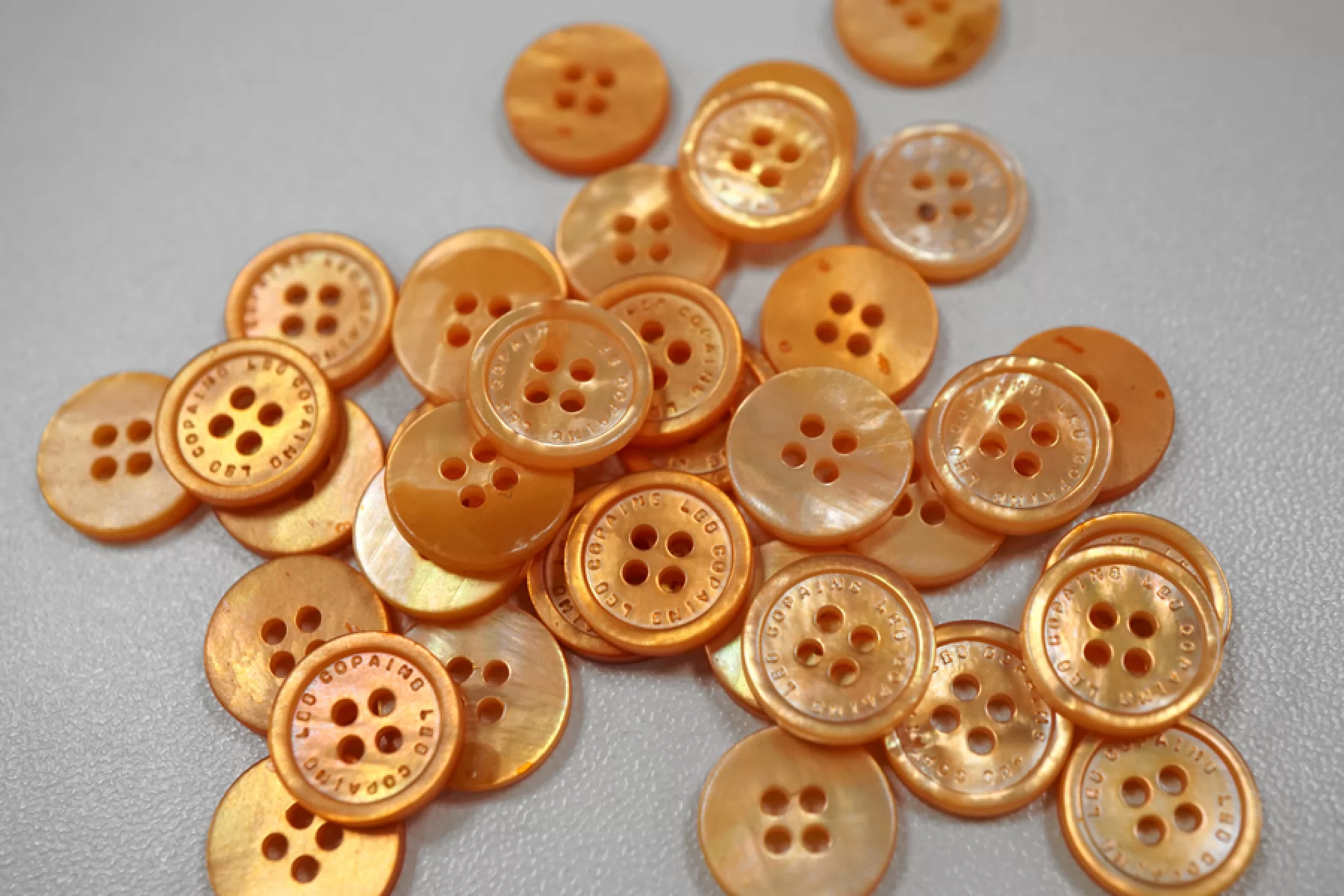 Пуговица рубашечно-плательная "Les Copains" из натуральной ракушки, размер 12 мм, цвет оранжевый. Пуговицы из натурального перламутра хрупкие, могут сломаться при падении с высоты или при сильном сжатии.