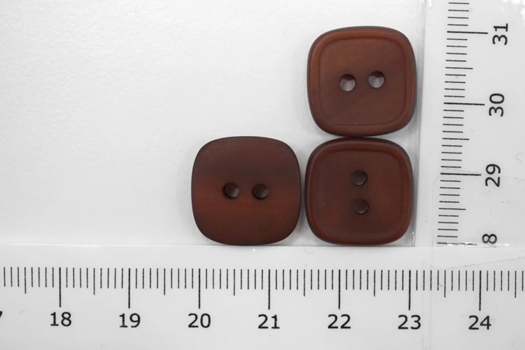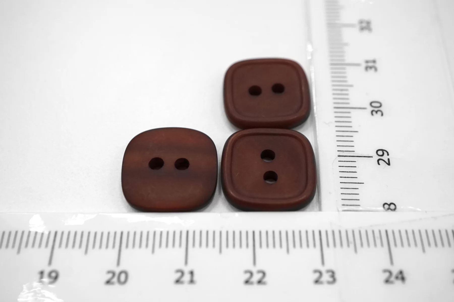 Пуговица матовая квадратная костюмно-рубашечная из пластмассы, под рог, размер 15 мм, коричневого цвета.