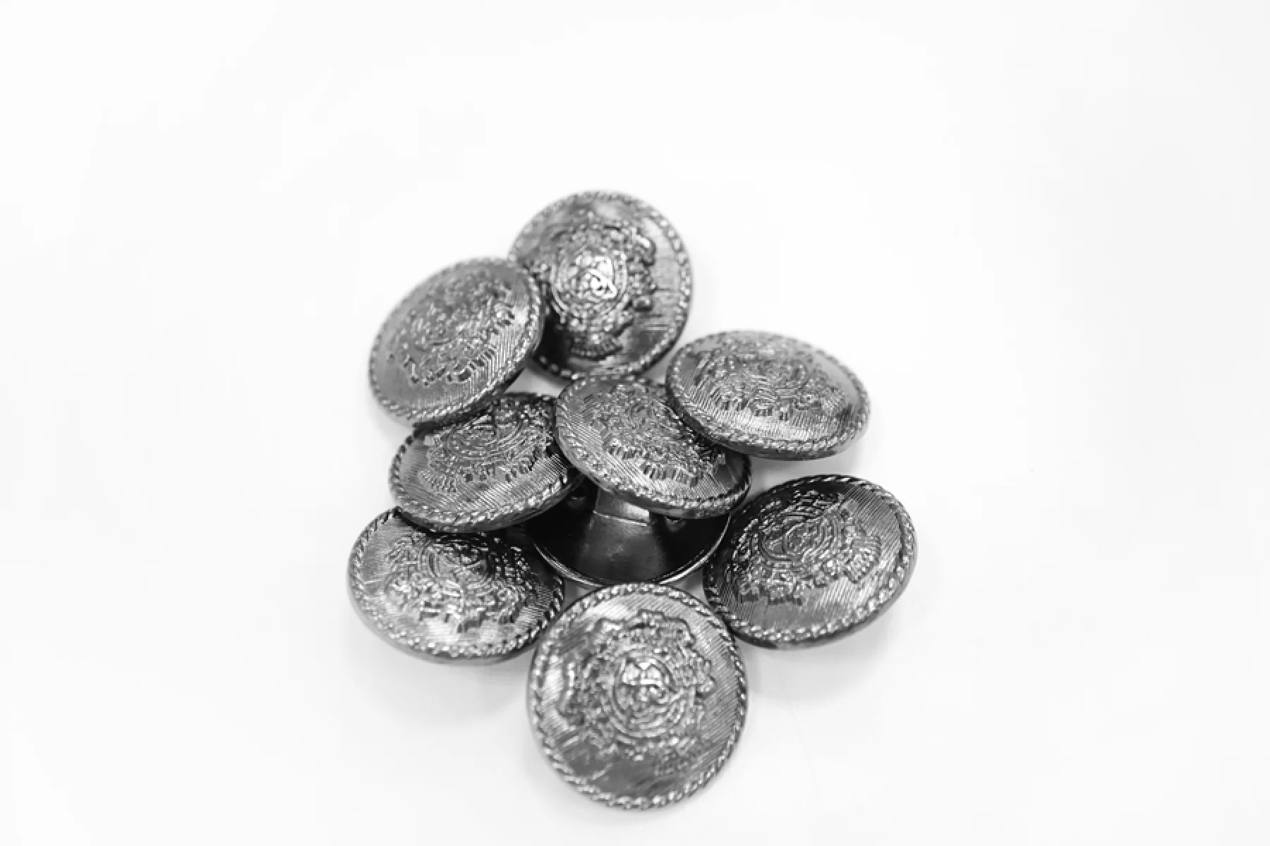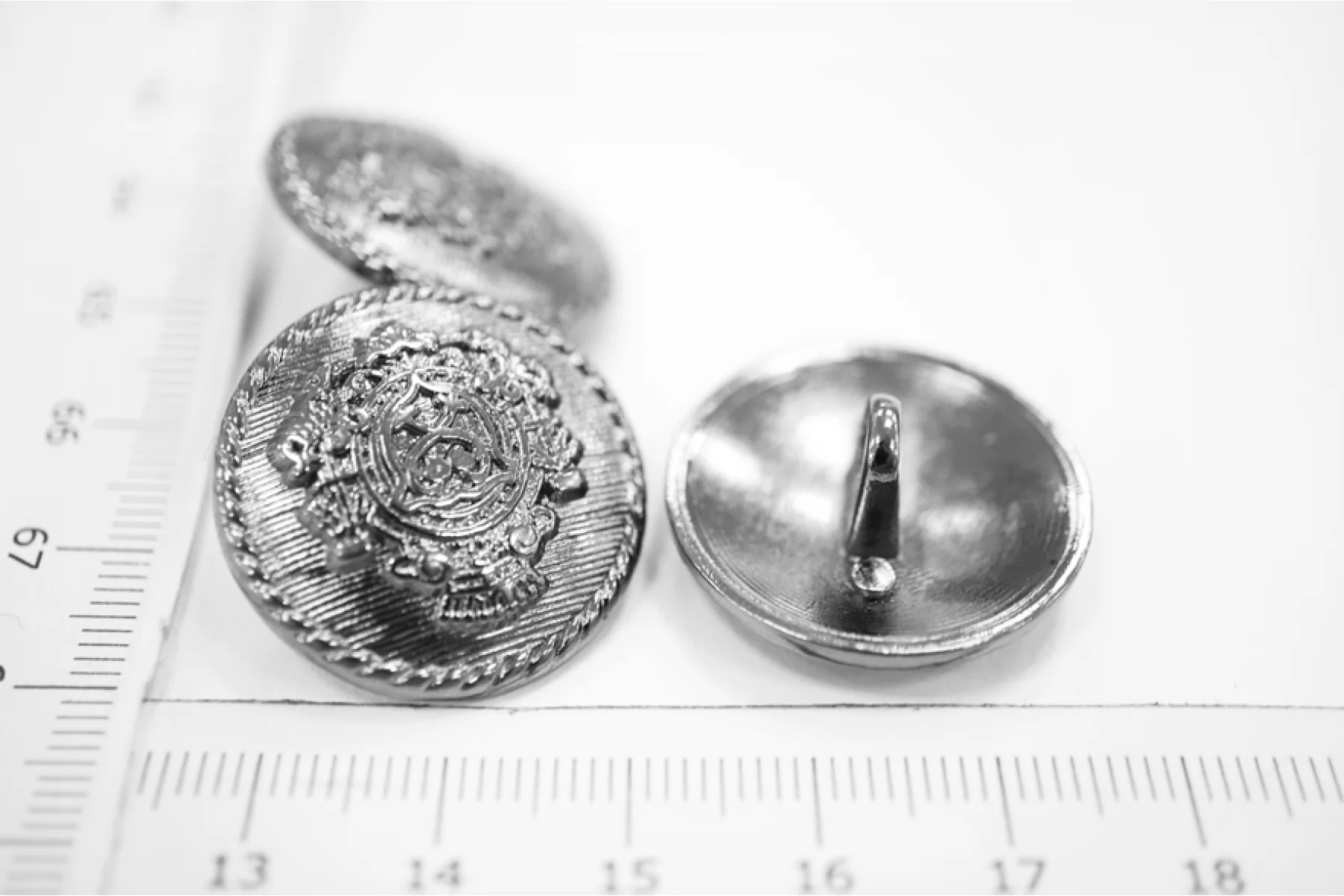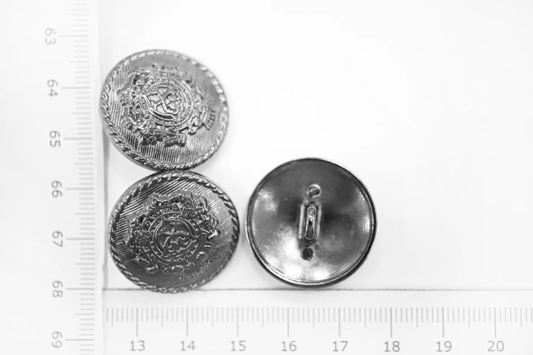 Пуговица матовая костюмно-пальтовая металлическая на ножке, размер 25 мм, ,чернённо-серебряного цвета, с геральдическим узором.