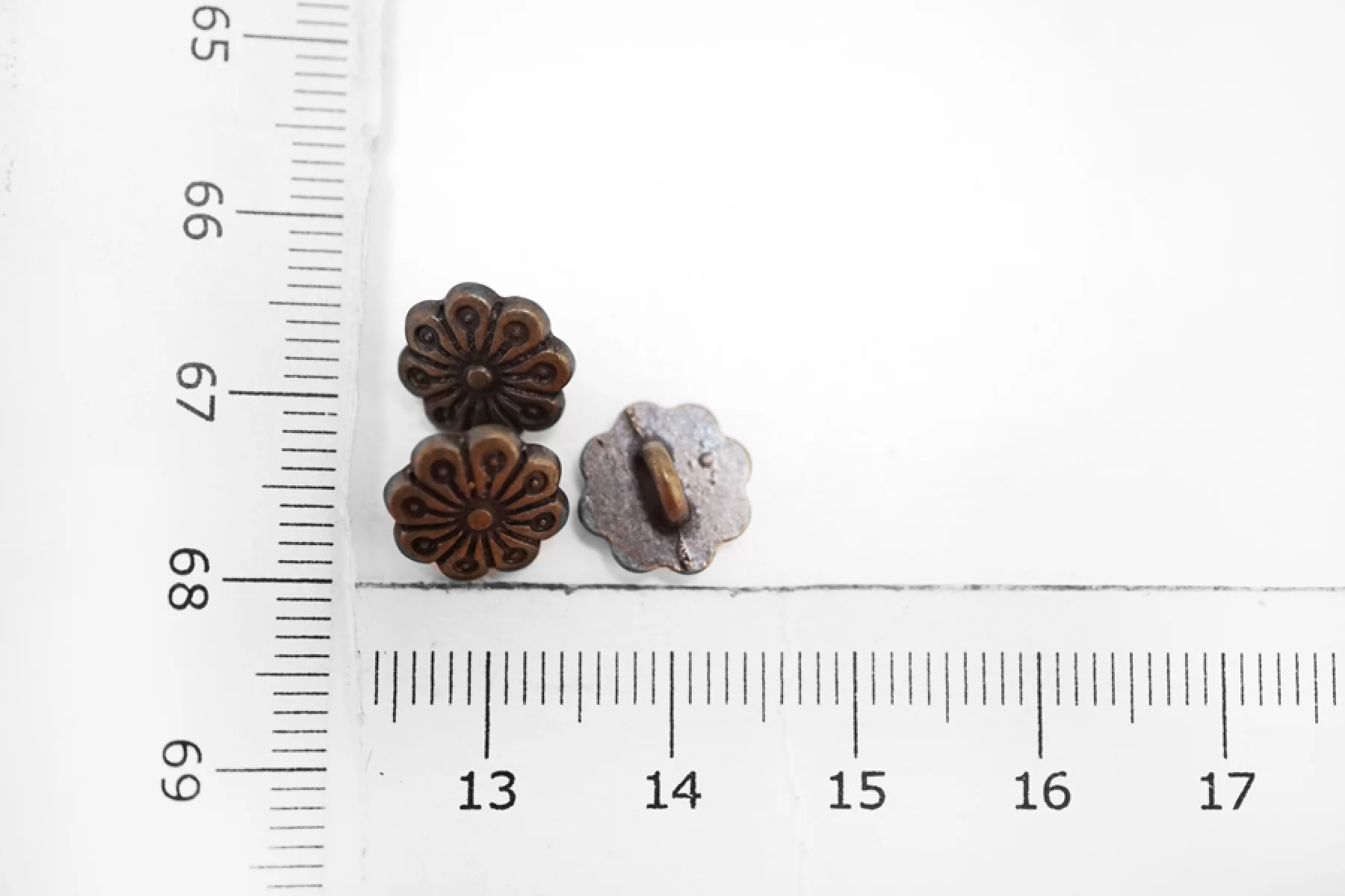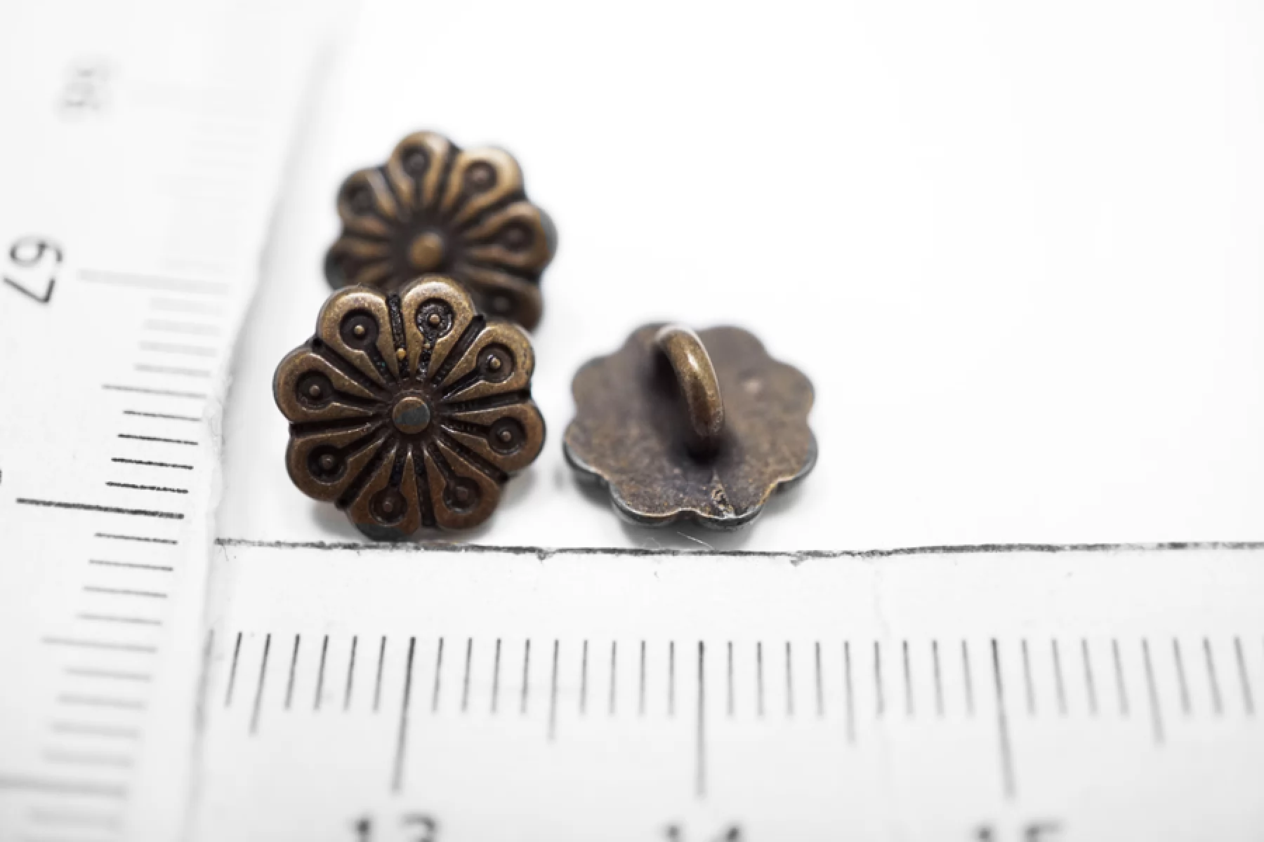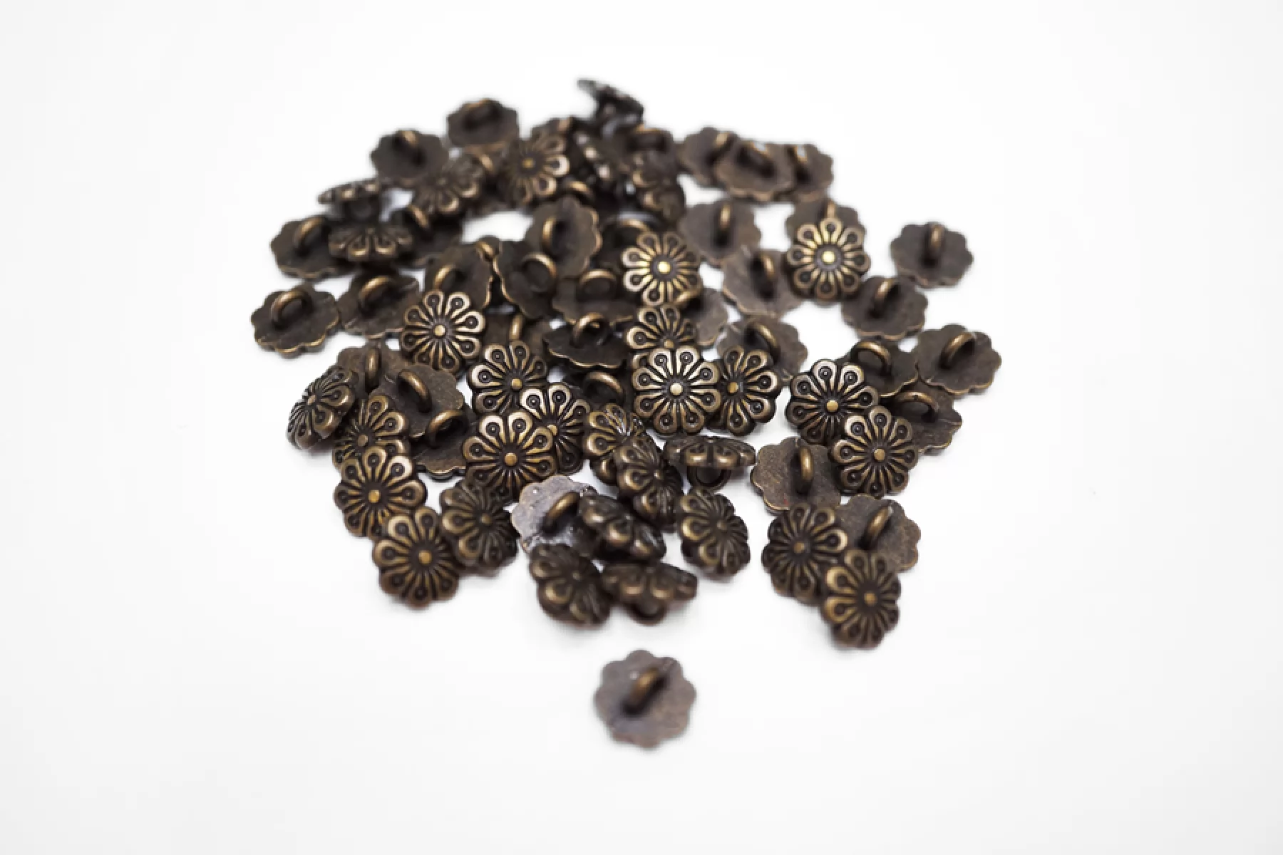 Пуговица металлическая, в виде цветка ,на ножке, чернено-бронзового цвета , размер 10 мм.