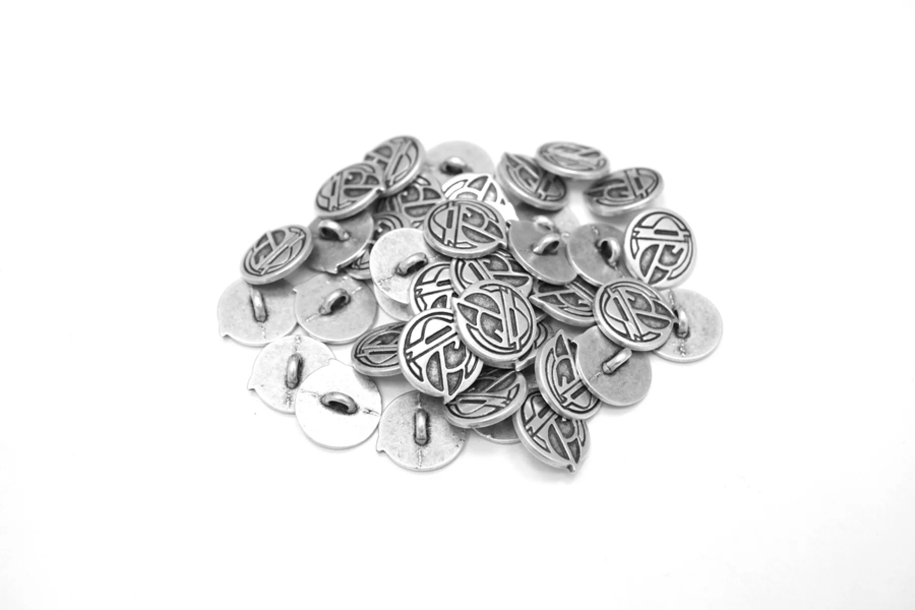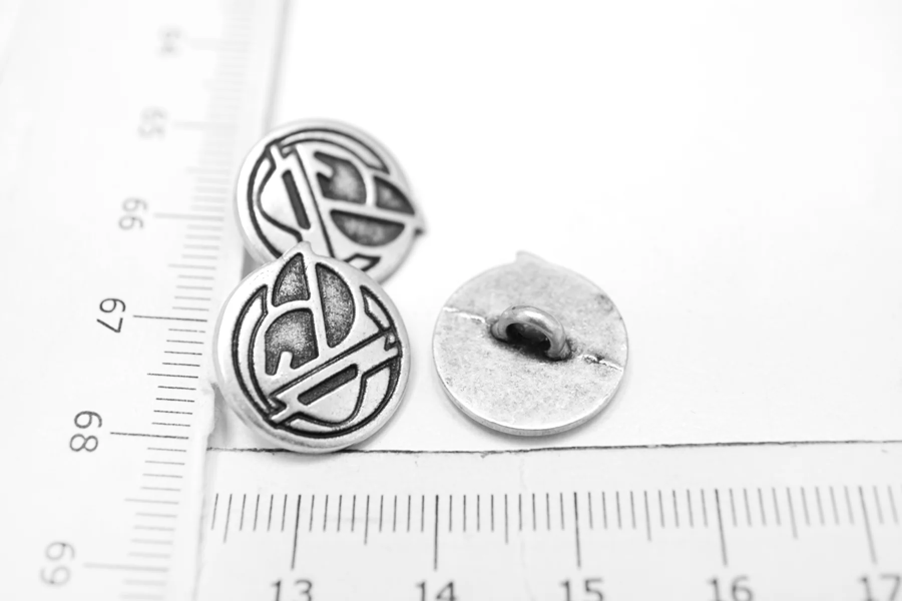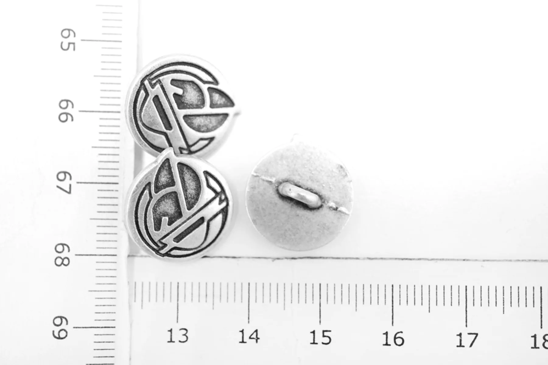 Пуговица металлическая, на ножке, серебристого цвета, с черненым узором, размер 15 мм.