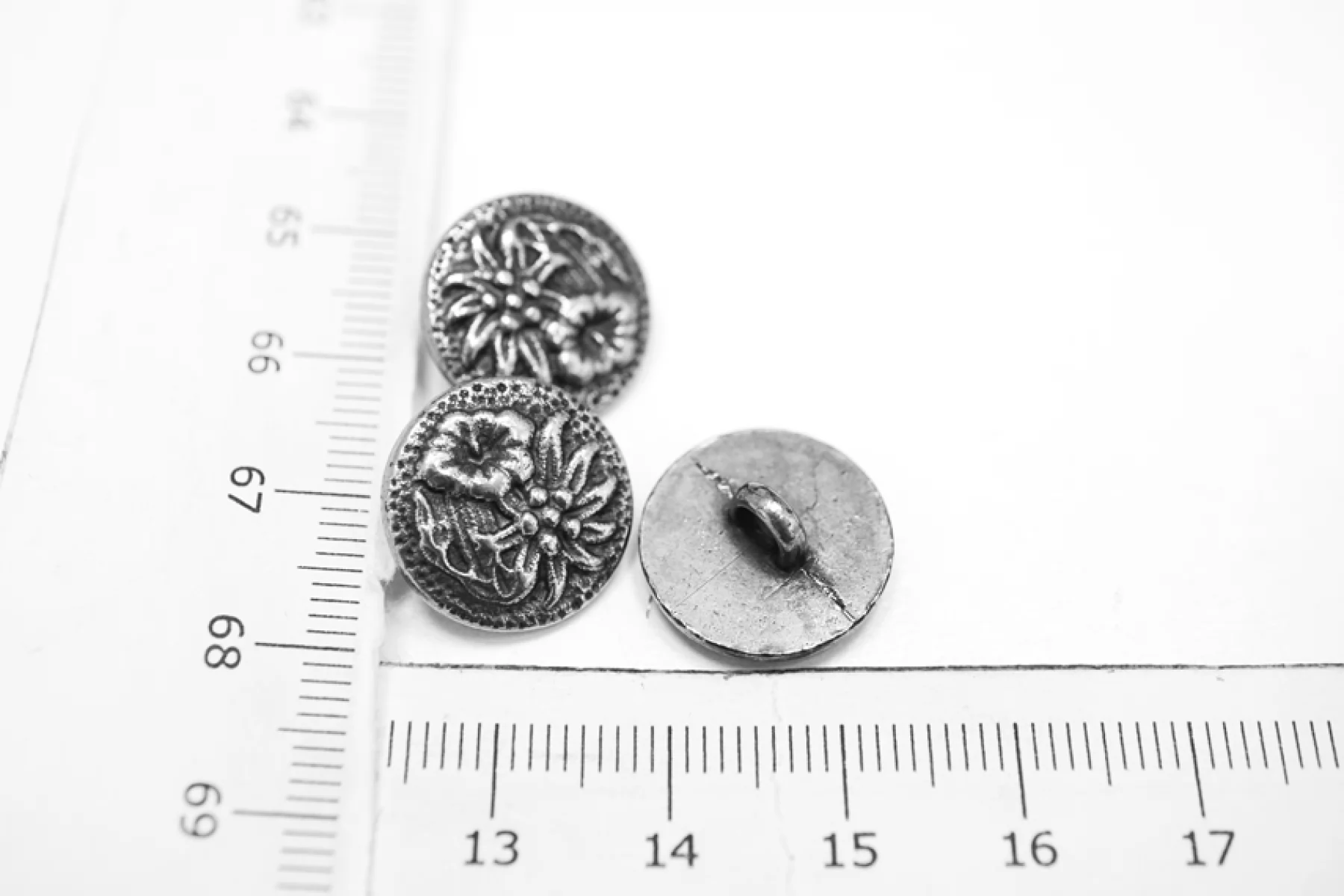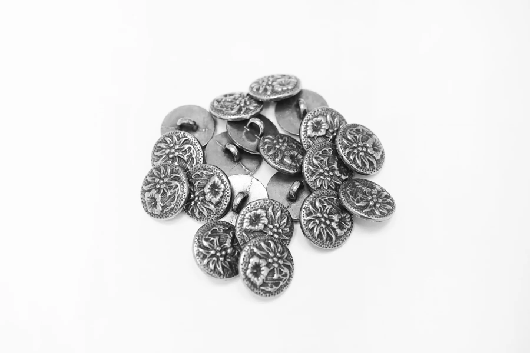 Пуговица металлическая, на ножке, серебристого цвета, с черненым узором в виде цветка, размер 16 мм.