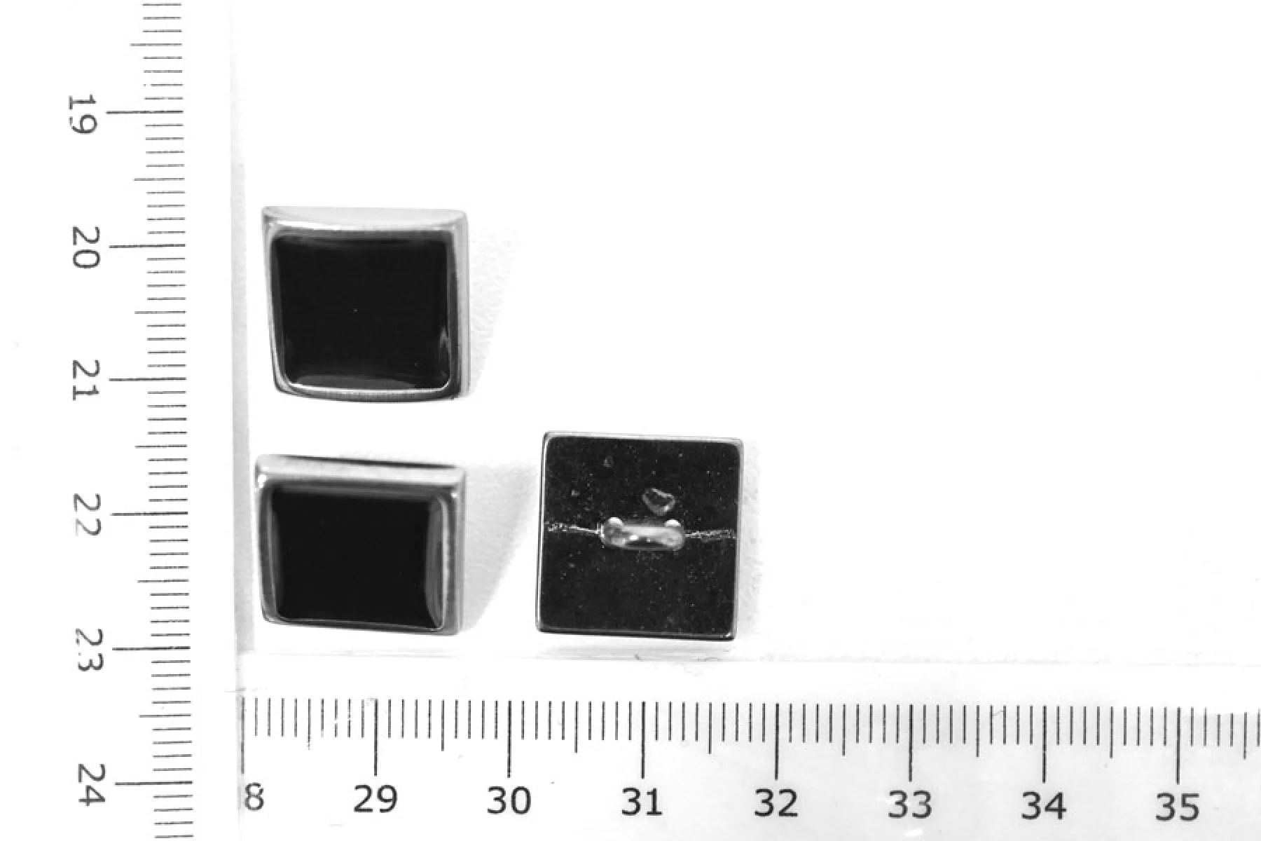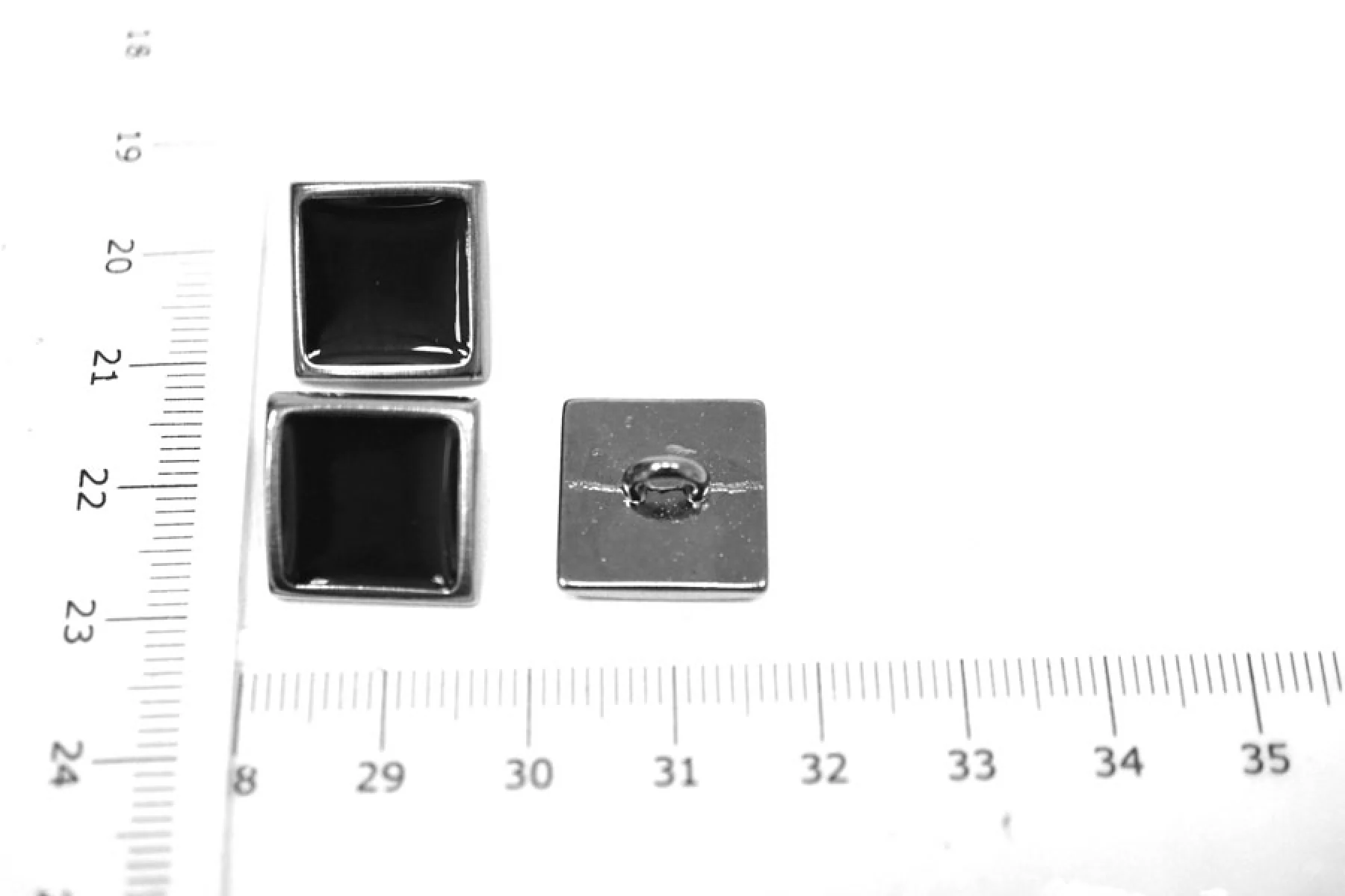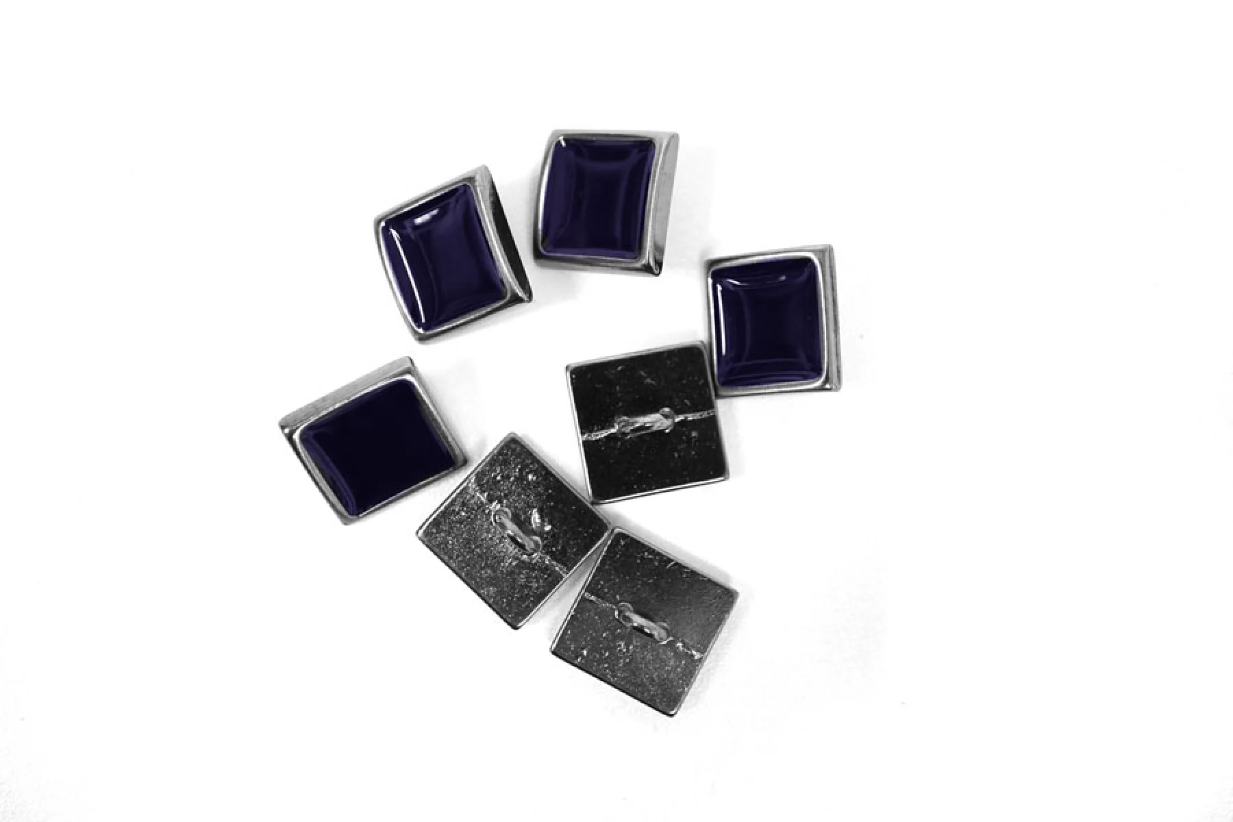 Пуговица металлическая квадратная серебряная покрытая эмалью тёмно-фиолетового цвета , на ножке , размер 15 мм.