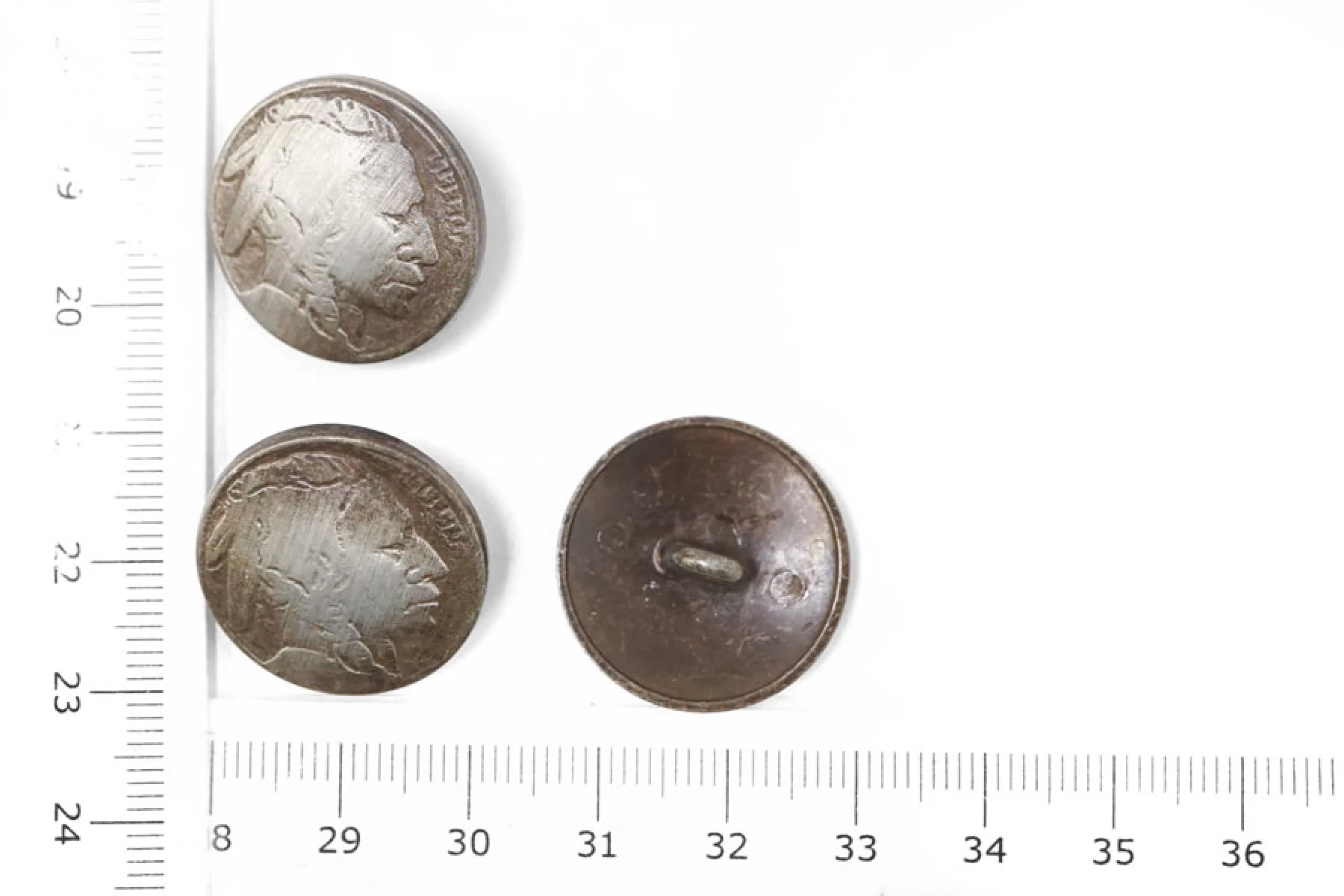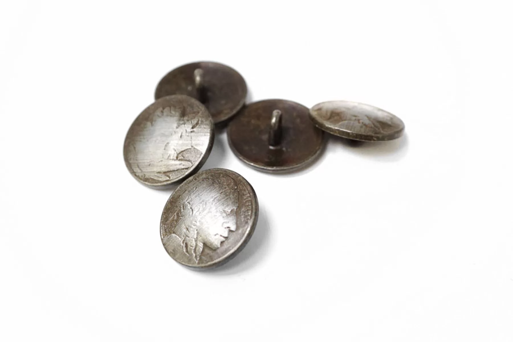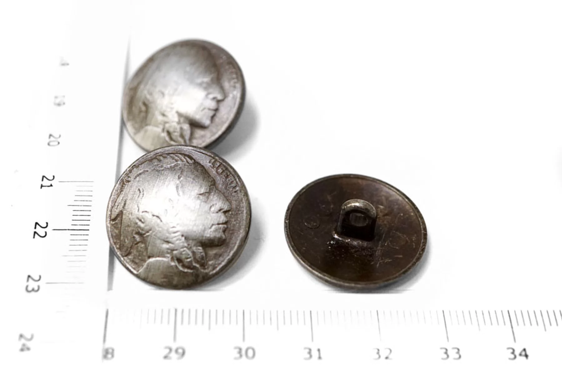 Пуговица костюмная металлическая на ножке под старину с гравировкой портрета индейца в профиль, размер 23 мм.
