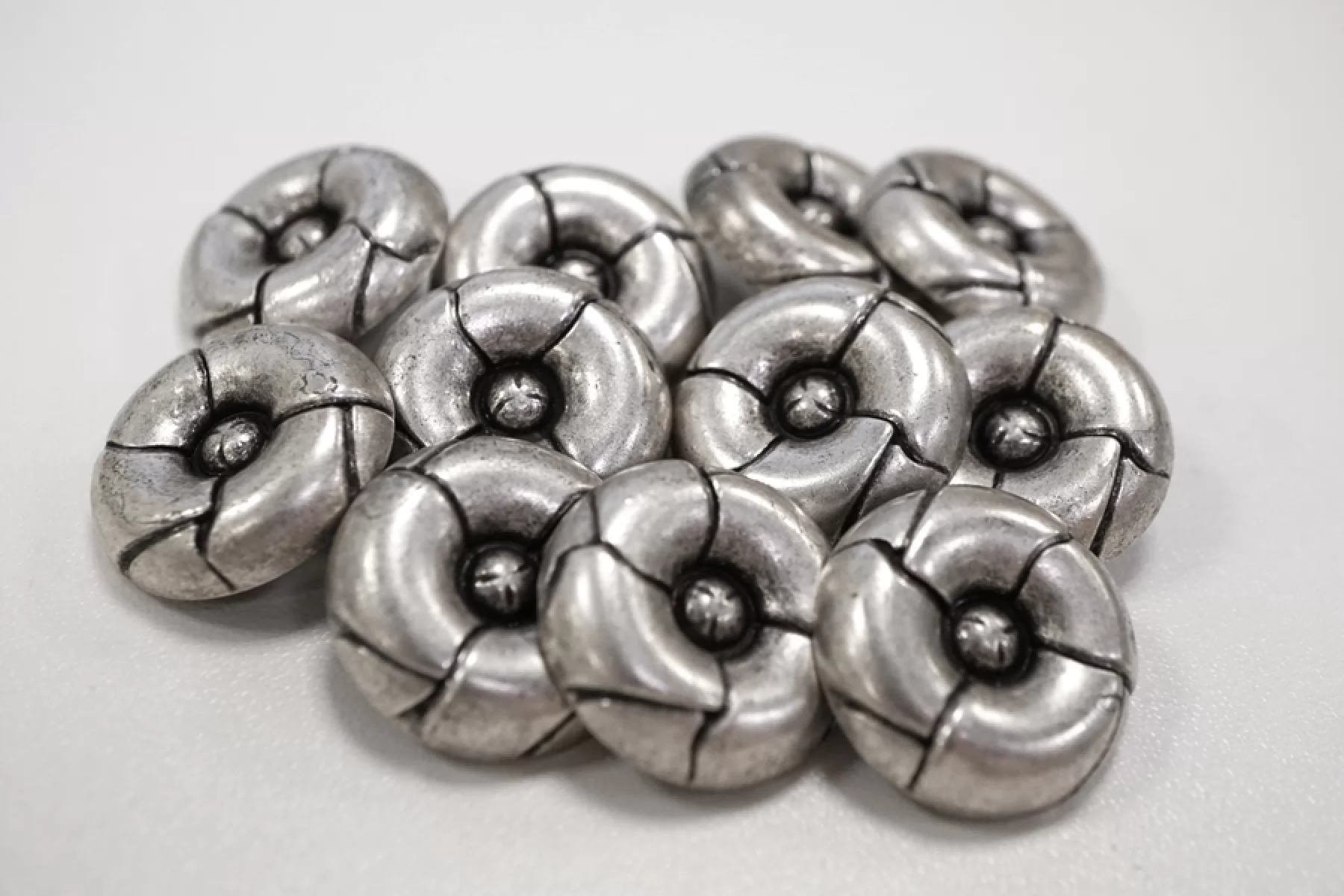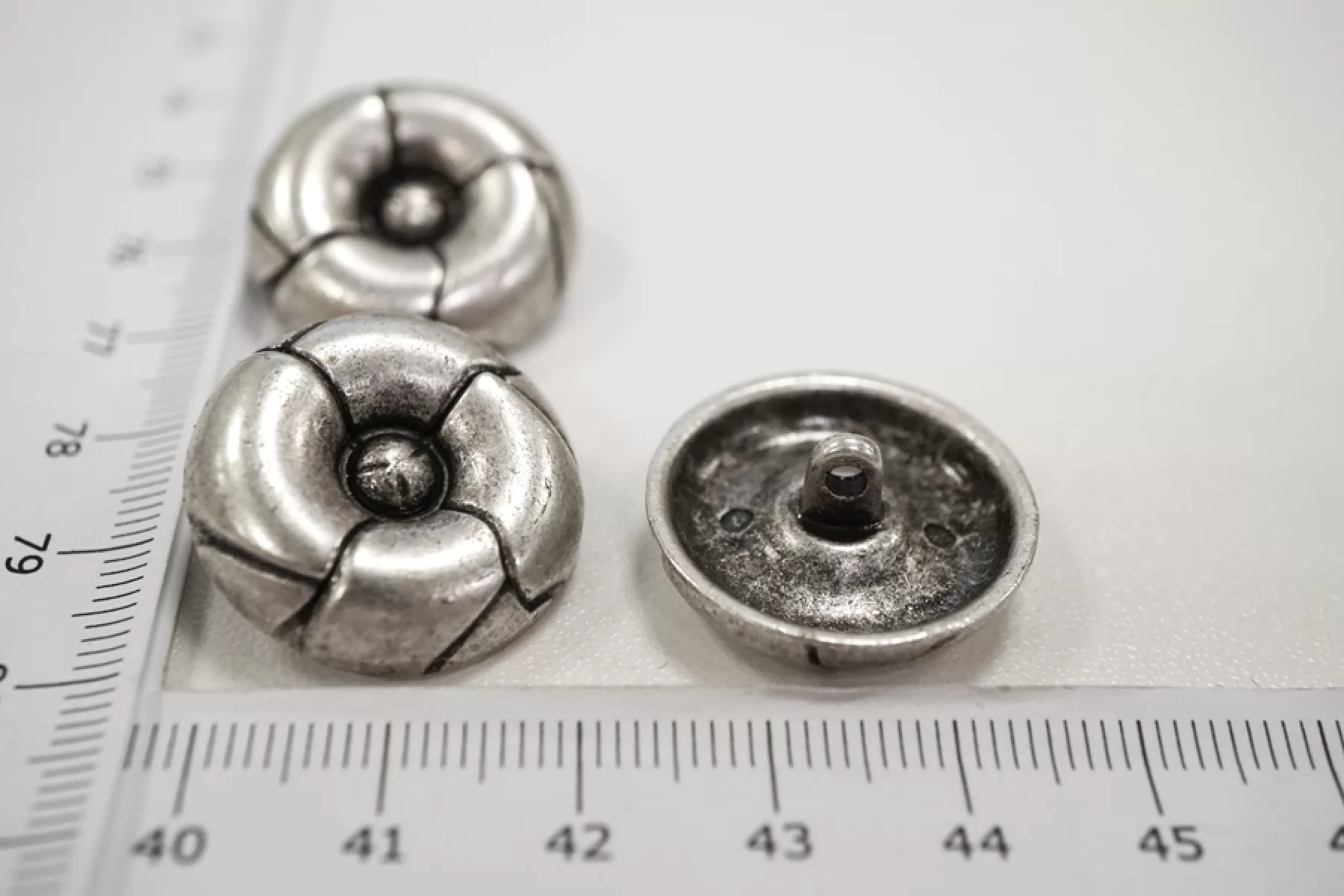 Пуговица костюмно-пальтовая металлическая на ножке, размер 25 мм, серебряного цвета, фактурная.