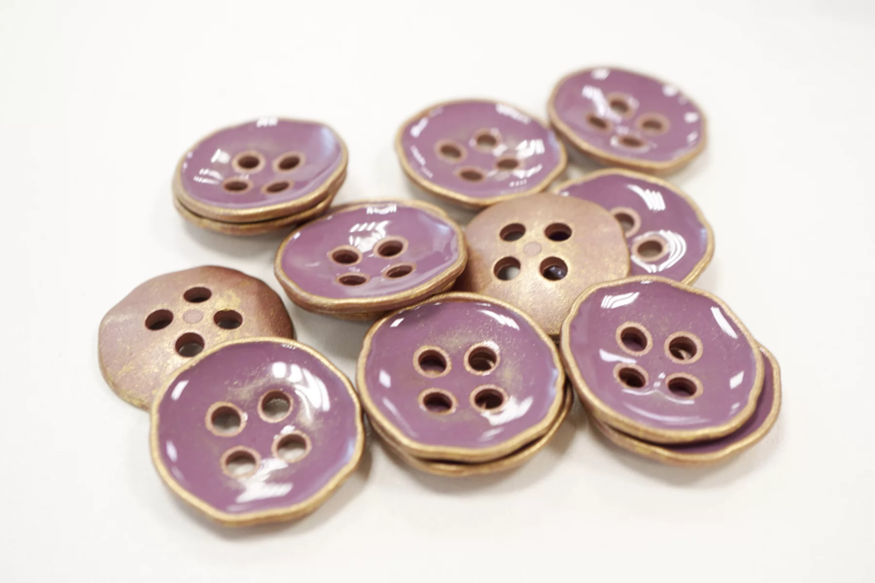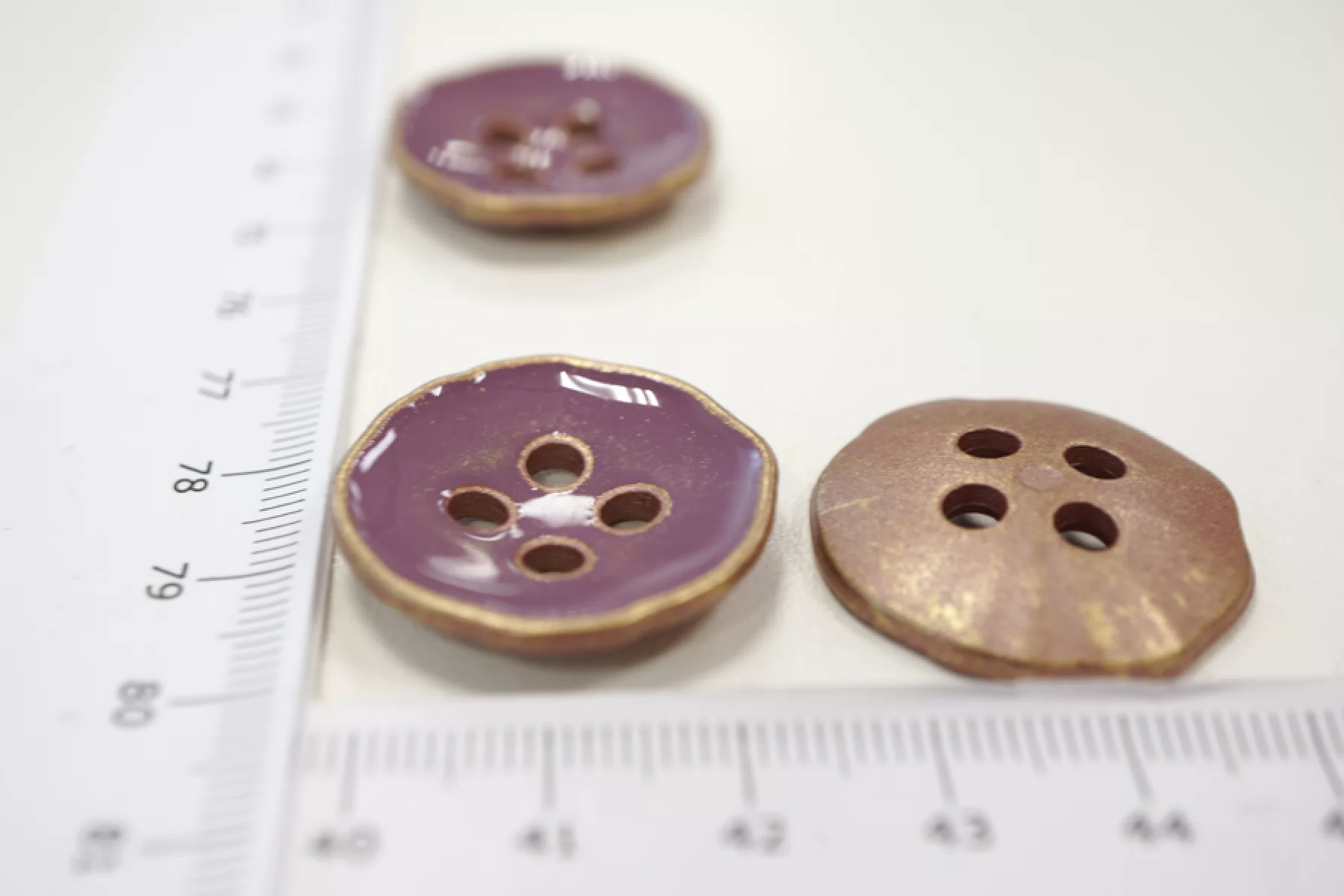 Пуговица пальтовая металлическая, размер 25 мм, золотая, покрытая пыльно-сиреневой эмалью.