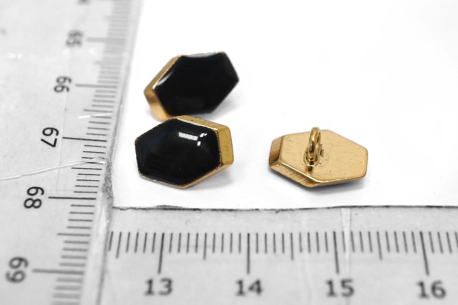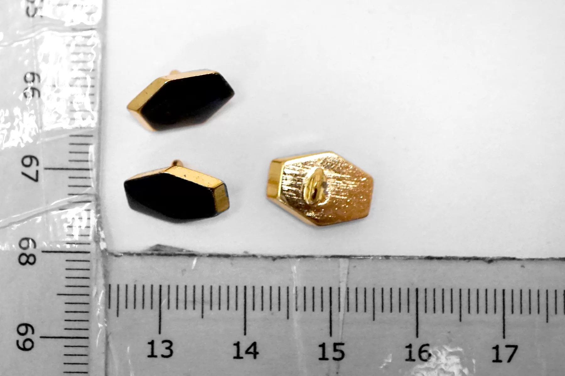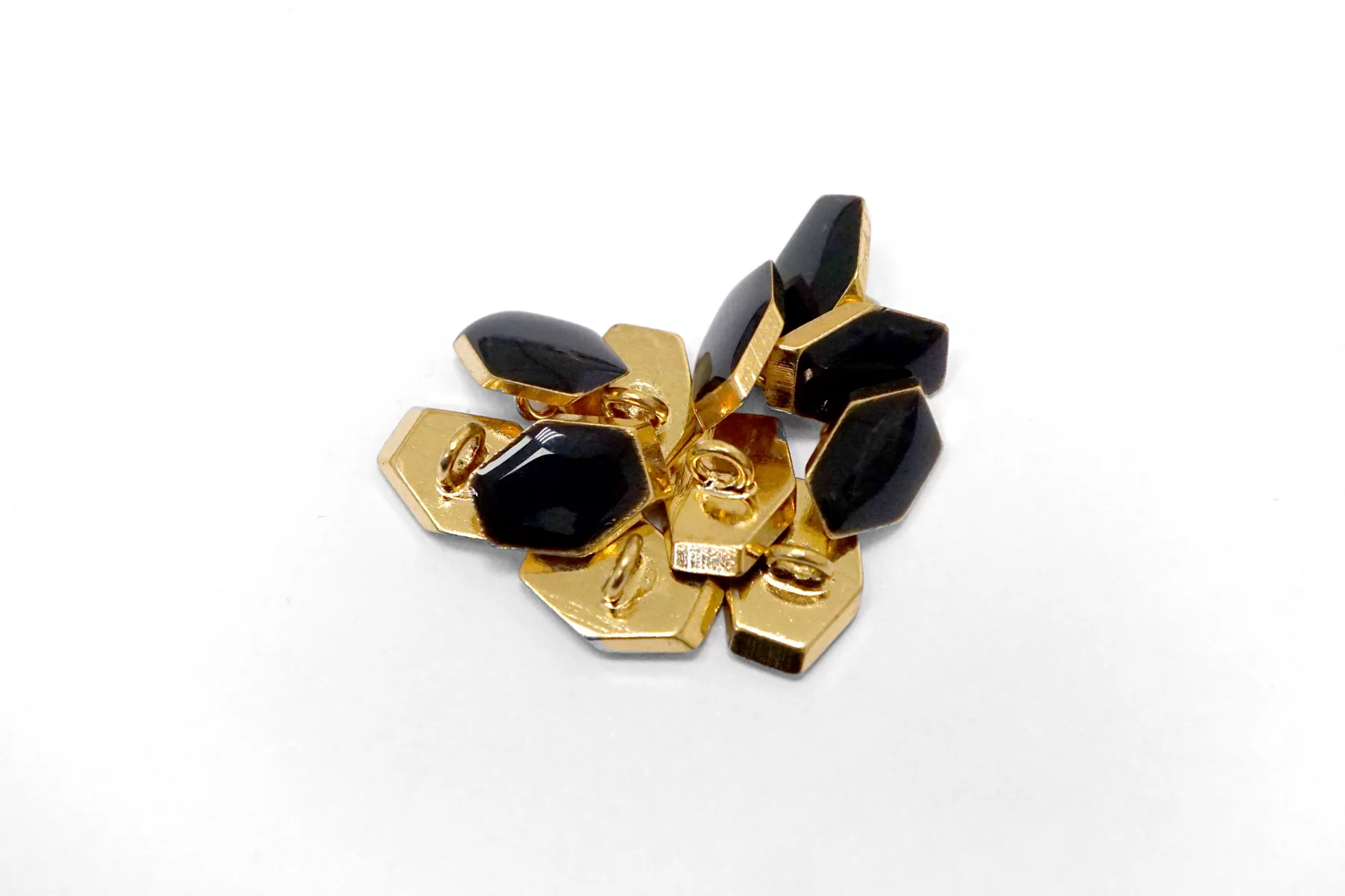 Пуговица металлическая на ножке плательная, золотая ,покрытая эмалью черного цвета. Размер 12 мм на 9 мм.
