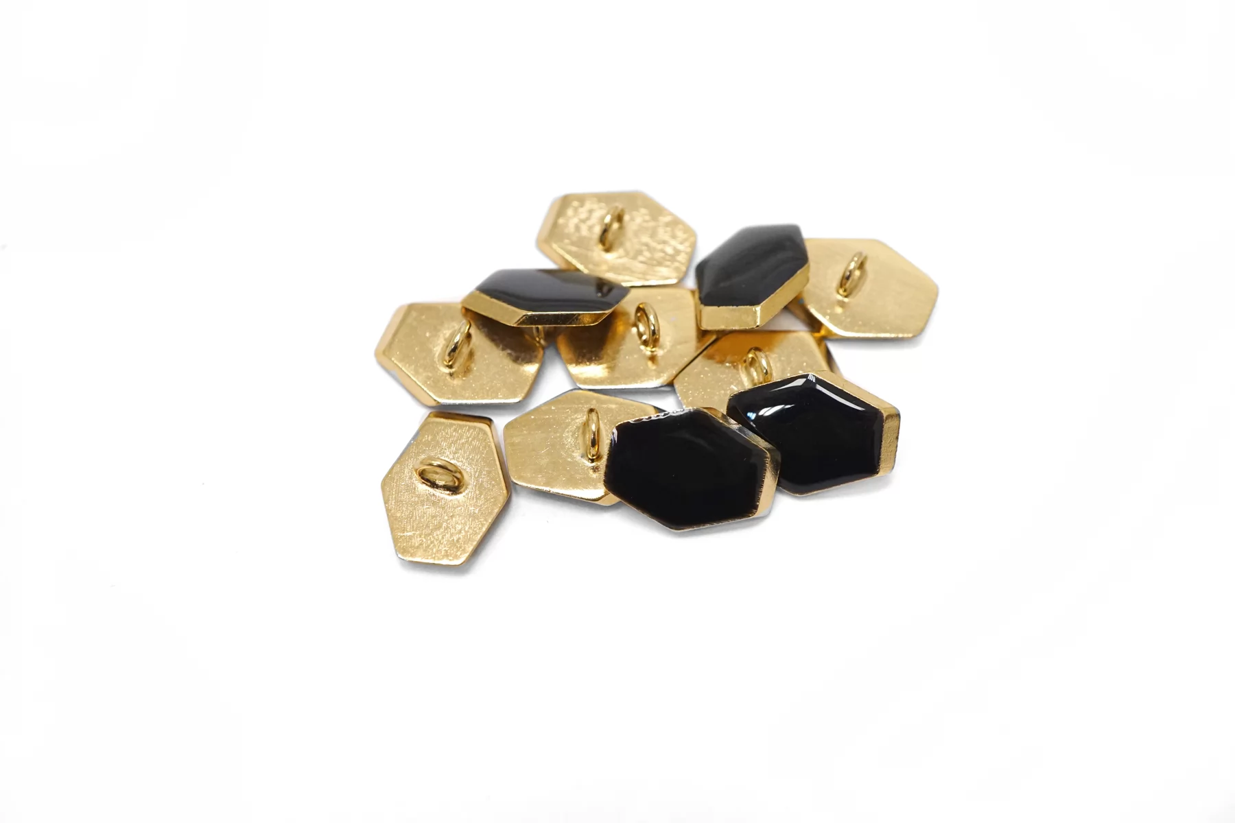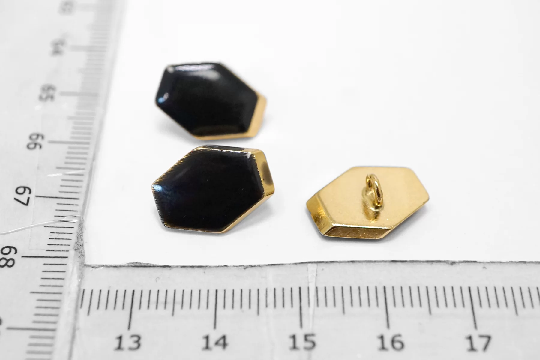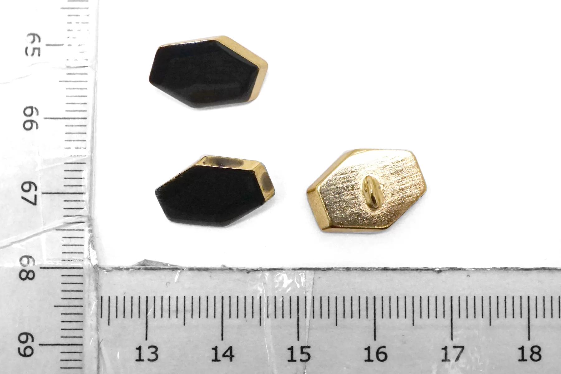 Пуговица металлическая на ножке плательная, золотая ,покрытая эмалью черного цвета. Размер 15 мм на 11 мм.