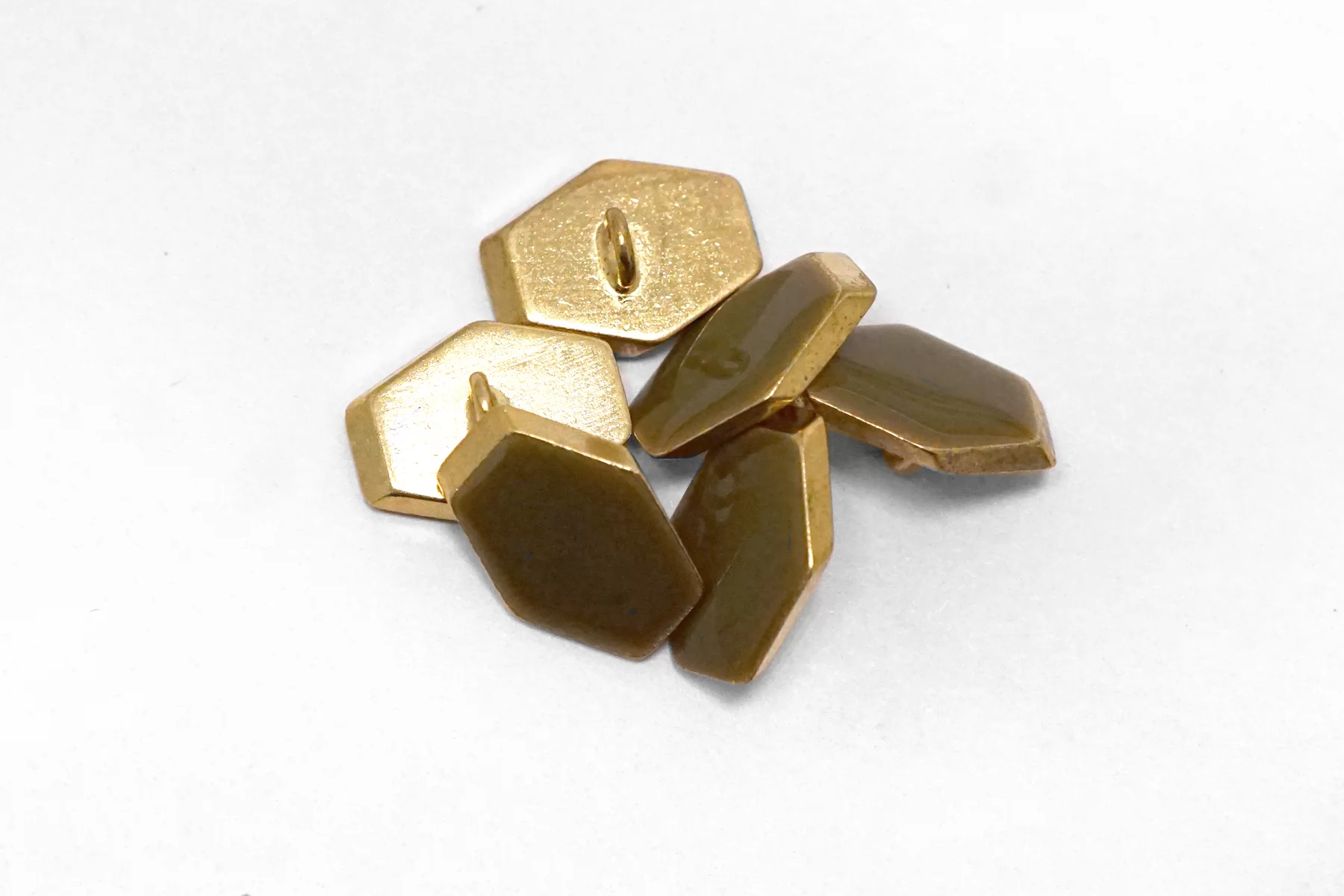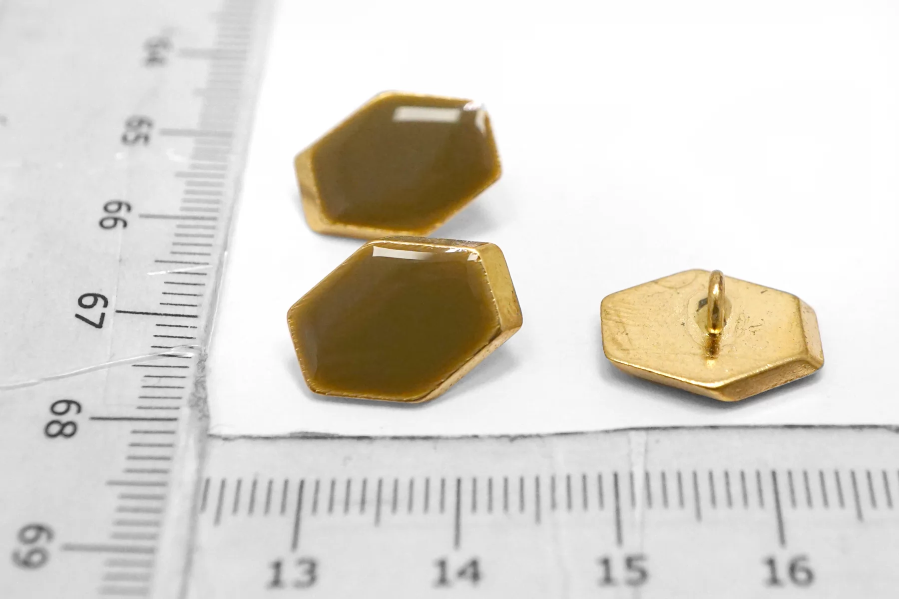 Пуговица металлическая на ножке плательная, золотая ,покрытая эмалью горчичного цвета. Размер 15 мм на 11 мм.
