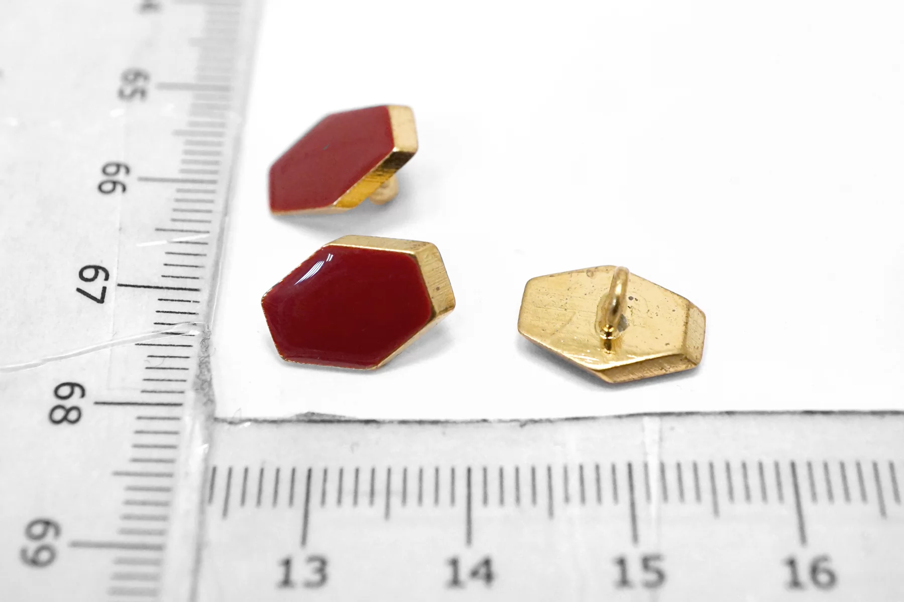 Пуговица металлическая на ножке плательная, золотая ,покрытая эмалью красного цвета. Размер 12 мм на 9 мм.