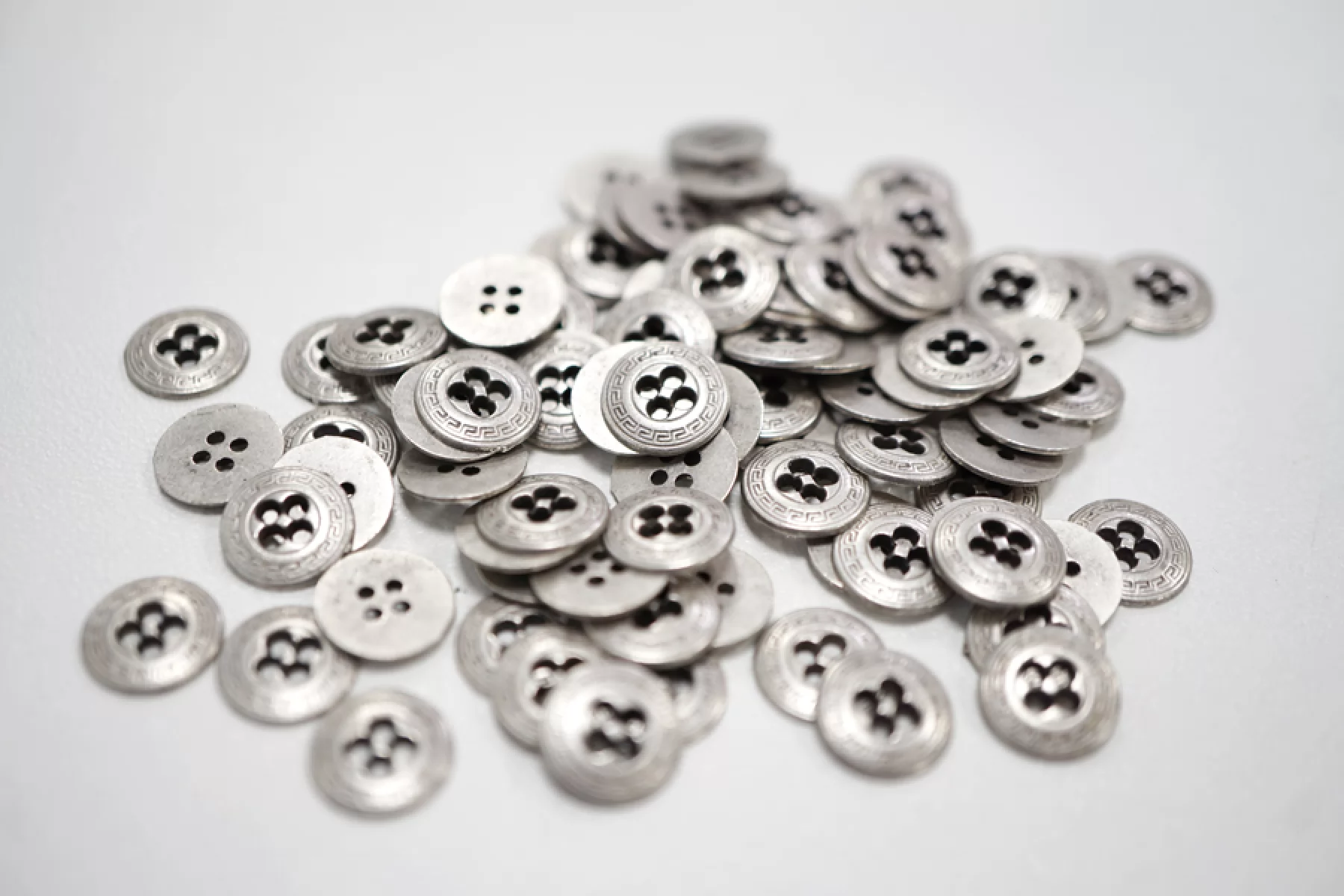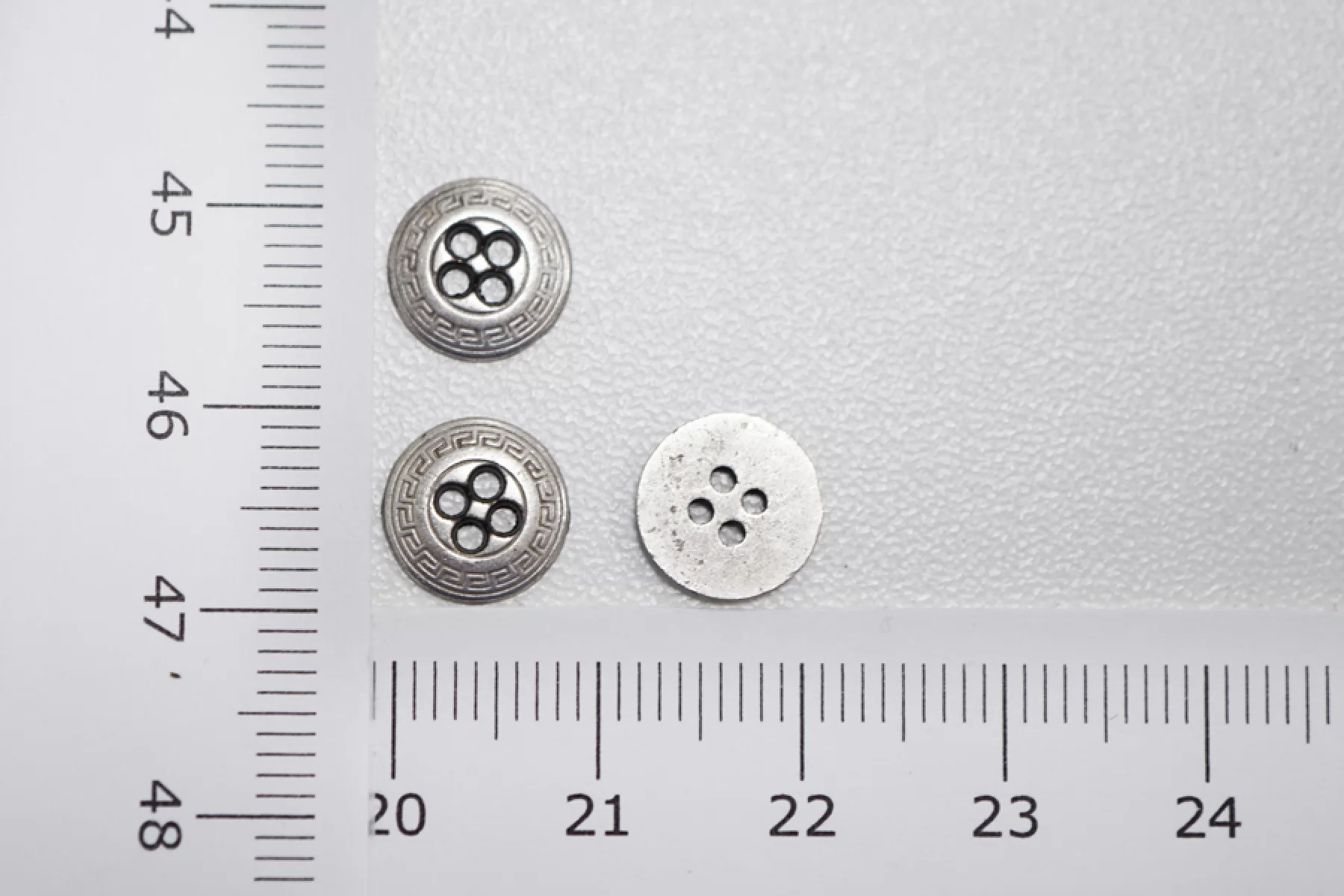 Пуговица рубашечно-плательная металлическая, размер 10 мм, цвет серебряный. На пуговице выбит традиционный греческий орнамент.