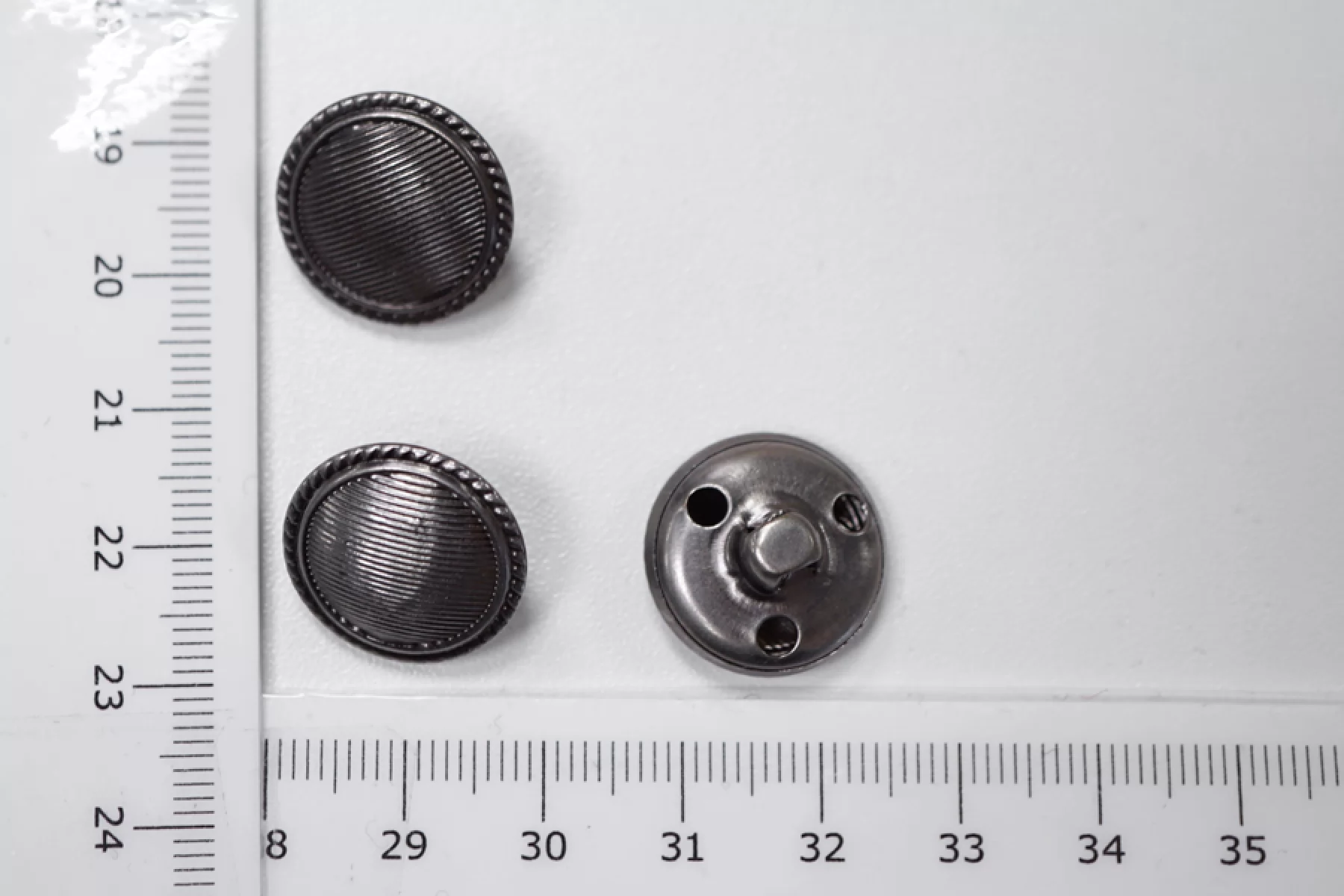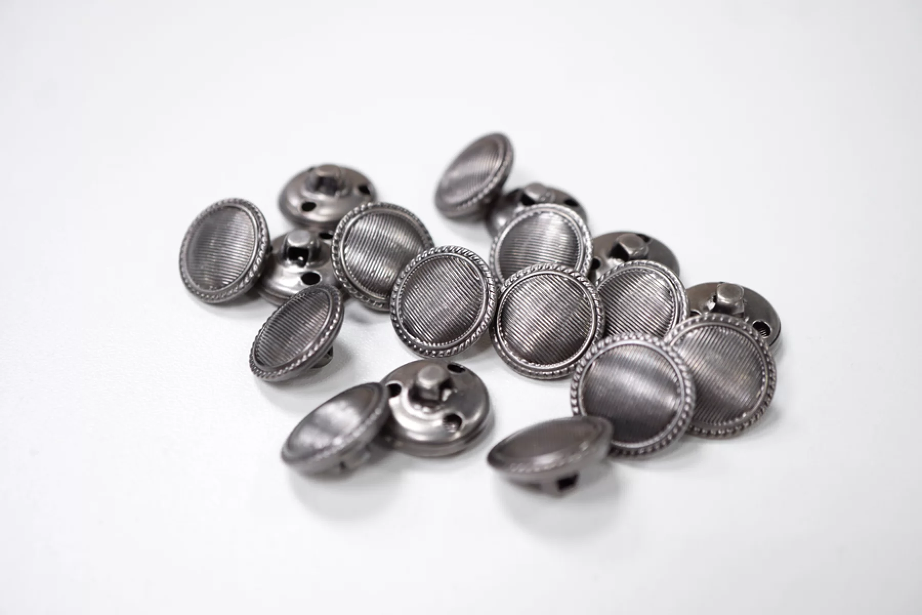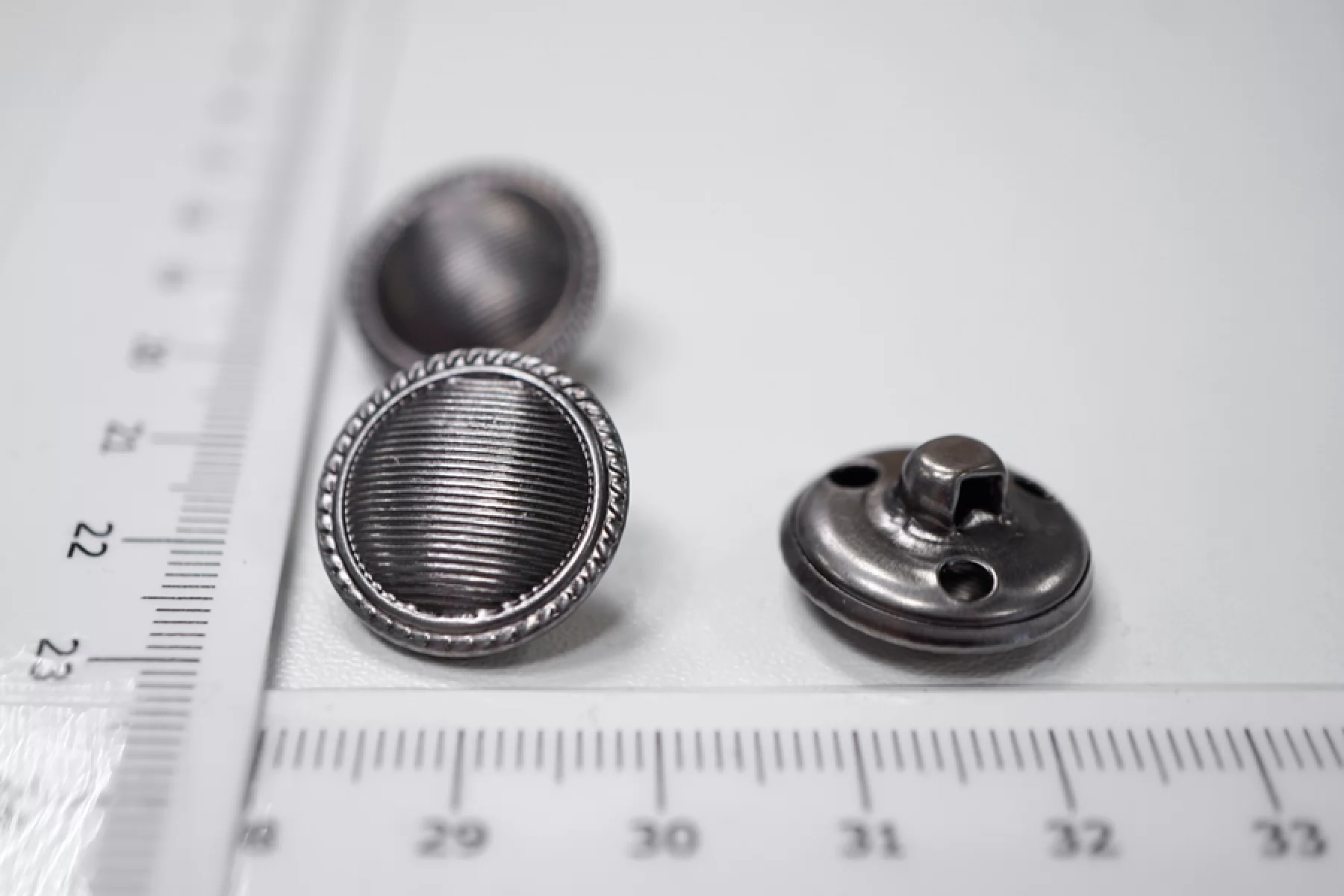 Пуговица костюмная на ножке металлическая, легкая, размер 17 мм. Ободок пуговицы с орнаментом, серединка - фактурная, в полосочку.